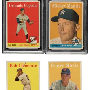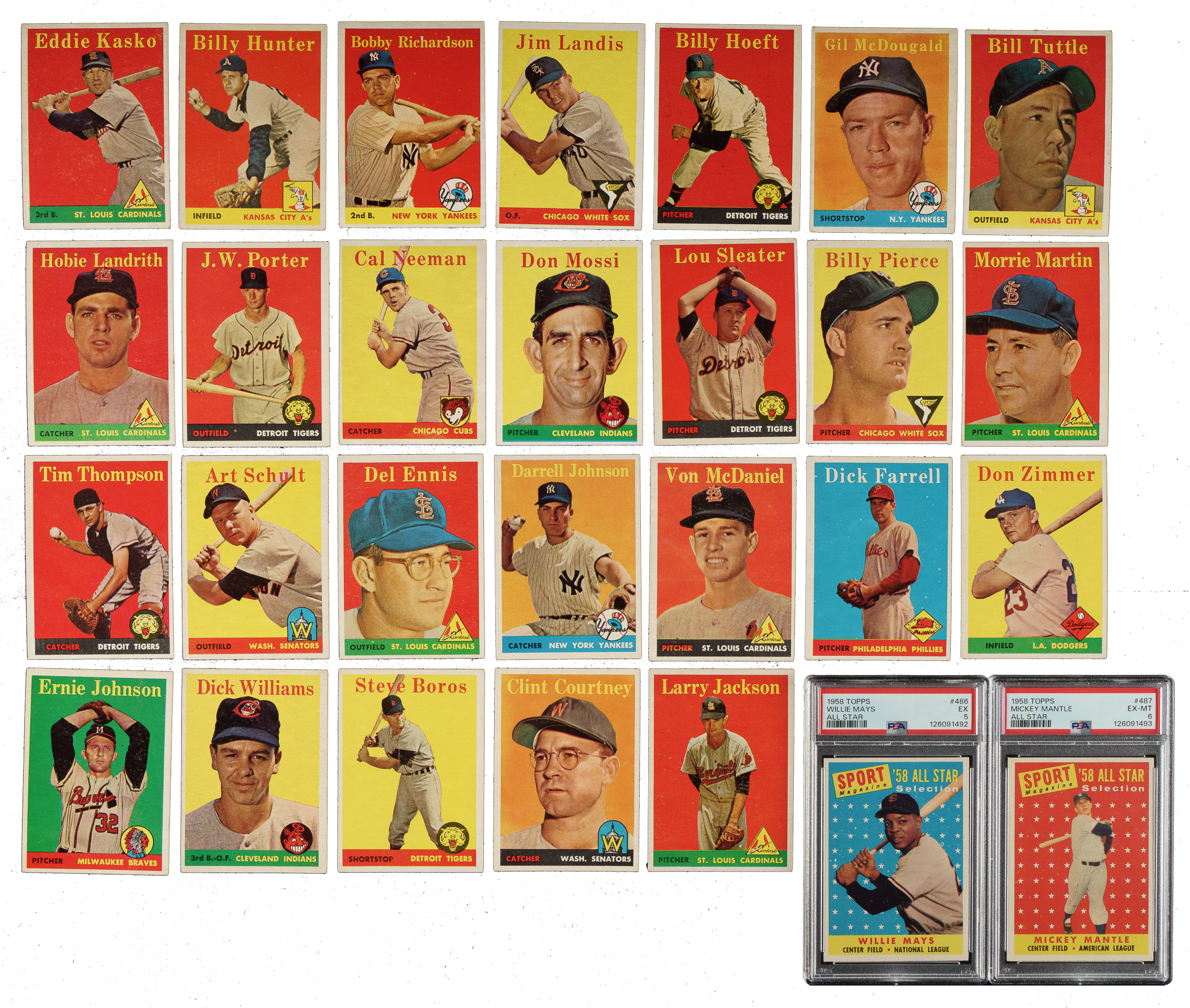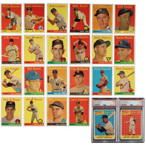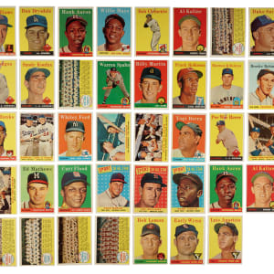 Presented is a complete set of 1958 Topps consisting of 494 different cards plus 32 different (out of 33) yellow-letter variations and all four team card variations. Missing only #11b Rivera for a complete yellow-letters subset. The classic 1958 Topps set features all the great stars of the era, in many cases more than once, as so many stars appear again on special multiplayer cards or in the All-Star series (#476-494). Condition is 45% Ex to Ex-Mt (including 2% Nr/Mt) and 55% Vg to Vg-Ex (including a few lesser and eight trimmed). Condition of the 26 non-key yellow letter variations ranges from Vg to Ex-Mt (averaging Vg-Ex+). We have selected four cards for grading and encapsulation by PSA. Keys: #1 Williams (Vg-Ex), 2b Lemon YL (Vg+), 5 Mays (Vg-Ex), 25 Drysdale (Vg-Ex+), 30a Aaron YL (Vg), 30b Aaron (Vg), 47 Maris RC (Vg), 52a Clemente YL (Vg+), 52b Clemente (Vg-Ex+), 70a Kaline YL (Vg-Ex+), 70b Kaline (Vg-Ex), 71 Dodgers Team (Vg), 85b Aparicio YL (Ex-Mt), 88 Snider (Vg-Ex+), 100b Wynn YL (Ex due to centering), 150 Mantle (VG-EX 4), 162 Hodges (Ex-Mt), 187 Koufax (Vg), 246 Yankees Team (95/5 L/R, otherwise Ex), 270 Spahn (Vg), 271 Martin (Ex), 285 F. Robinson (Vg-Ex+), 288 Killebrew (Ex+), 307 B. Robinson (90/10 T/B, otherwise Vg-Ex), 310 Banks (Vg-Ex), 314 Snider/Alston (Vg-Ex+), 320 Ford (Ex+), 321 Williams/Klu (Vg-Ex), 343 Cepeda RC (EX 5), 351 Braves' Fence Busters (Ex), 370 Berra (Vg), 375 Reese (Vg-Ex+), 377b Braves Team/numerical (Ex-Mt), 397b Tigers Team/numerical (Vg-Ex), 408b Orioles Team/numerical (Vg-Ex), 418 Mantle/Aaron (Vg-Ex), 428b Reds Team/numerical (Vg-Ex), 436 Mays/Snider (Vg-Ex), 440 Mathews (Ex), 464 Flood RC (Vg-Ex), 476 Musial AS (Ex), 485 T. Williams AS (Vg), 486 Mays AS (EX 5), 487 Mantle AS (EX-MT 6), and 488 Aaron AS (Vg-Ex). Very attractive mid-grade complete set highlighted by numerous Hall of Famers. Total: 530 cards (complete set of 494 plus 32 yellow-letter variations and four team card variations).