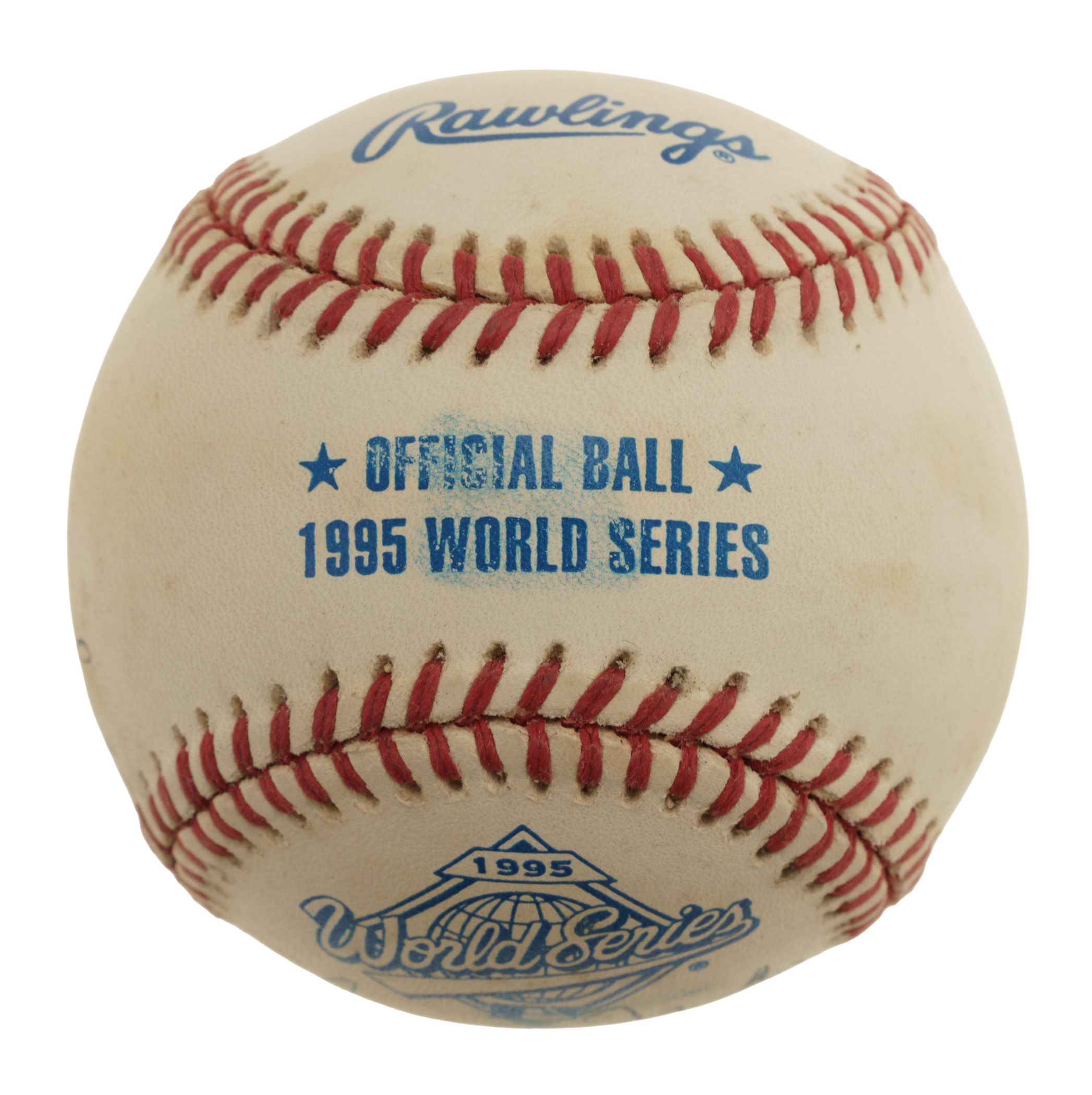 Official 1995 World Series baseball featuring the rare full-name signatures of Atlanta Braves Hall of Fame pitchers "Thomas Michael Glavine," "Gregory Alan Maddux," and "John Andrew Smoltz." Signed by each individual in blue ink. The ball displays scattered patches of light-to-moderate toning but is otherwise in Excellent to Near Mint condition overall. Full LOA from James Spence/JSA.