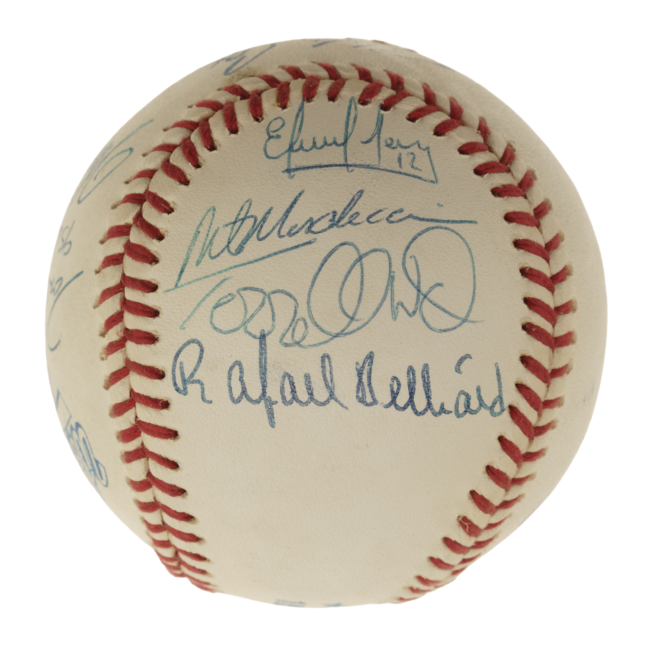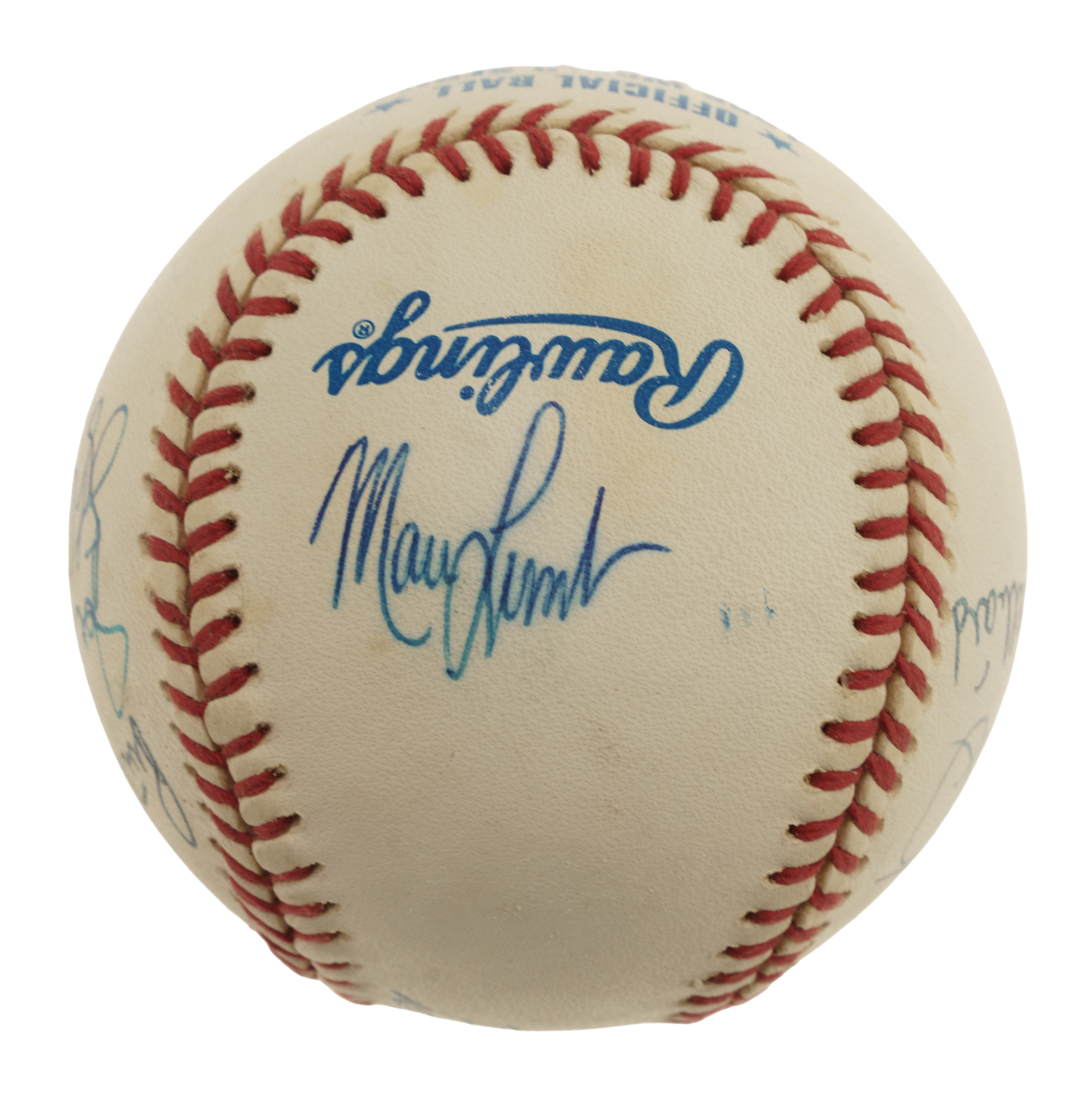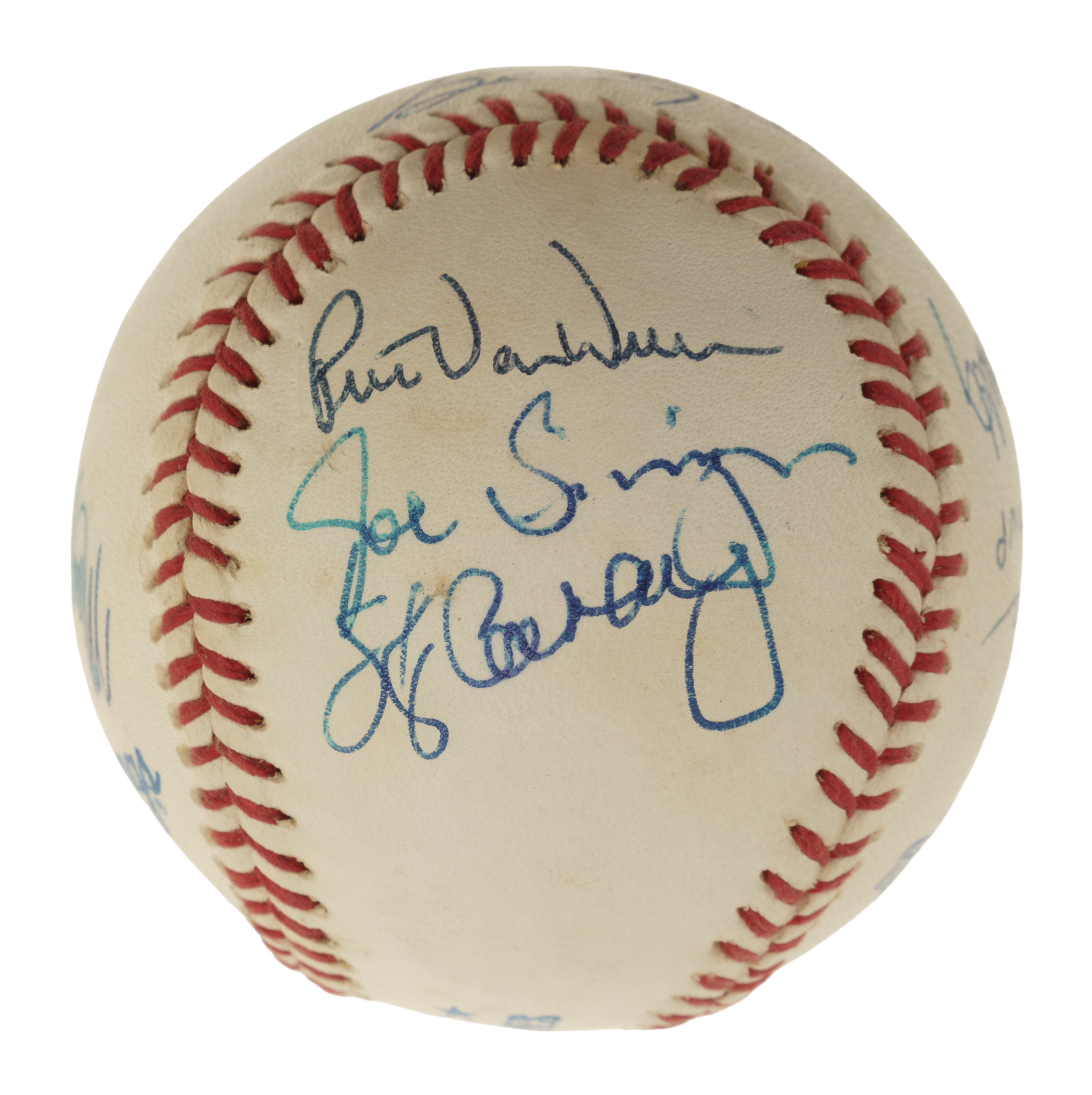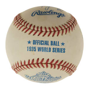 Official 1995 World Series baseball (Selig) signed in blue ink by eleven members of the 1995 World Champion Atlanta Braves, including three team broadcasters. Notable signatures include Cox (mgr., sweet spot), Glavine ('95 W.S. M.V.P.), Smoltz, Simpson (broadcaster), S. Caray (broadcaster), and Van Wieren (broadcaster). The ball displays a few spots of very light discoloration but is otherwise in Near Mint condition overall. Auction LOA from James Spence/JSA.