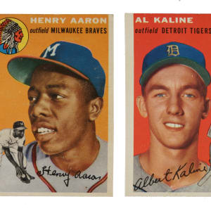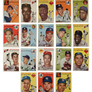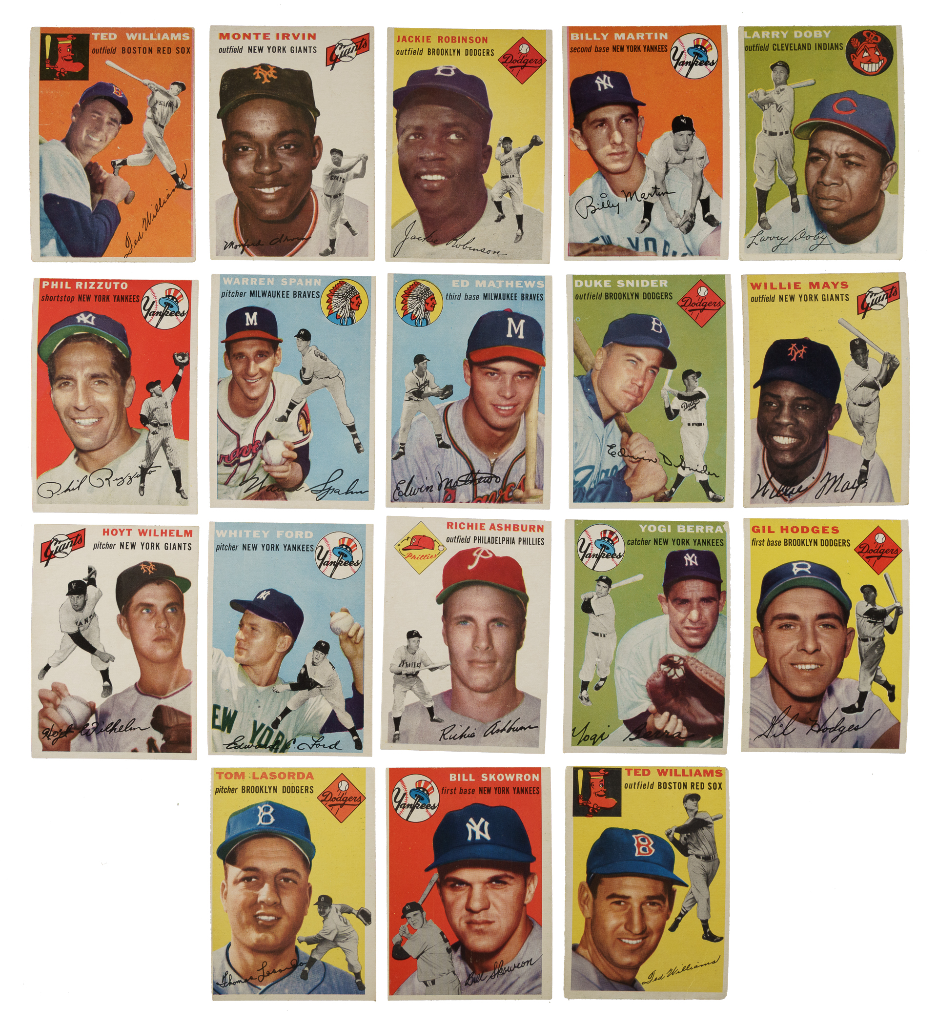 The 1954 Topps set has always been one of the most popular sets of the 1950s. Issued in the heart of the decade, the set features the rookie cards of Hank Aaron, Ernie Banks, and Al Kaline, along with many other Hall of Famers and stars, including two examples of Ted Williams (first and last cards in the set), all in brilliant color. Many of the cards in this set show faint evidence of one-time storage under corner mounts and have been slightly downgraded accordingly. Condition is 40% Ex to Ex-Mt (approximately two-thirds Ex), 51% Vg to Vg-Ex, and 9% lesser. Keys: #1 Williams (Gd), 3 Irvin (Vg), 10 Robinson (altered, otherwise Vg), 13 Martin (Ex), 17 Rizzuto (Ex), 20 Spahn (Ex), 30 Mathews (Vg-Ex), 32 Snider (Vg-Ex+), 36 Wilhelm (Gd due to spot of paper loss on reverse), 37 Ford (Ex), 45 Ashburn (Ex-Mt), 50 Berra (Fr-Gd), 70 Doby (Vg), 90 Mays (Vg), 94 Banks RC (2/98 T/B, otherwise Vg due to very small edge tear), 102 Hodges (Vg-Ex+), 128 Aaron RC (trimmed and color added on reverse, otherwise Vg), 132 Lasorda RC (10/90 L/R, otherwise Ex), 201 Kaline RC (100/0 L/R, otherwise Ex), 239 Skowron RC (10/90 L/R, otherwise Ex), and 250 Williams (Vg). Extremely attractive vintage sets that are in mid-grade condition are especially desirable, representing an exceptional collecting value. This is a beautiful yet still relatively affordable set of this classic early Topps issue, loaded with Hall of Famers and stars from the 1950s. Total: 250 cards.