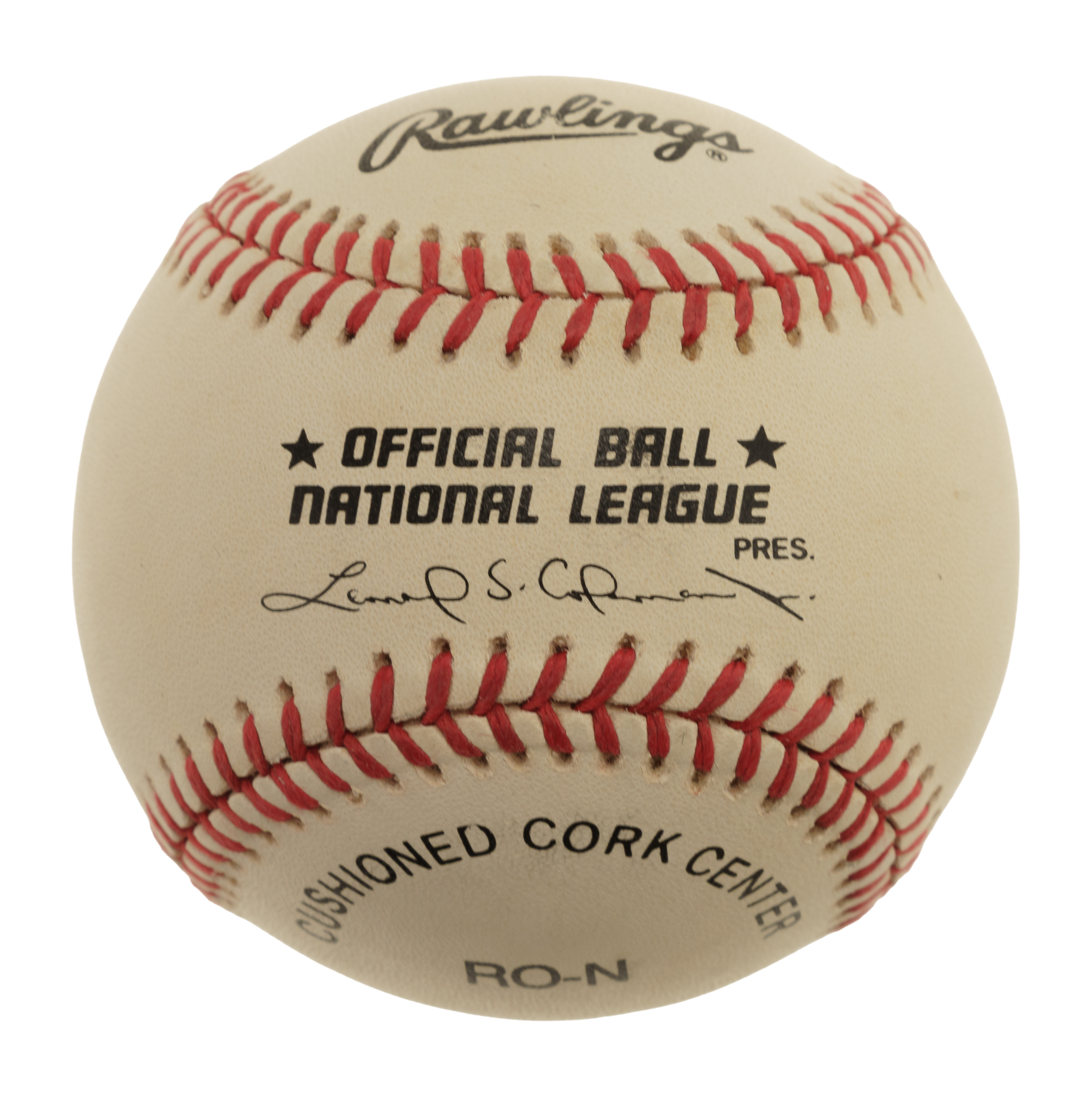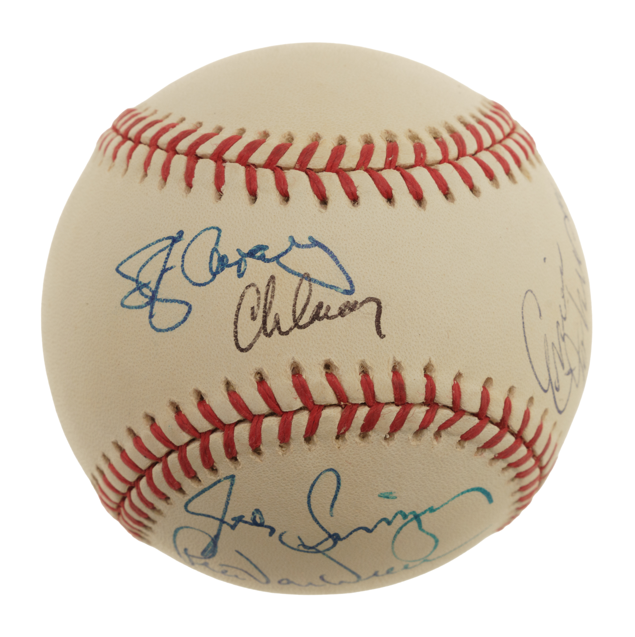 Official National League baseball (Coleman) signed in blue ink by the following four sports commentators: Skip Caray (sweet spot), Joe Simpson, Pete Van Wieren, and Ernie Johnson. Near Mint condition overall. Auction LOA from James Spence/JSA.