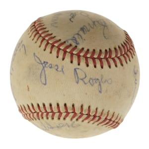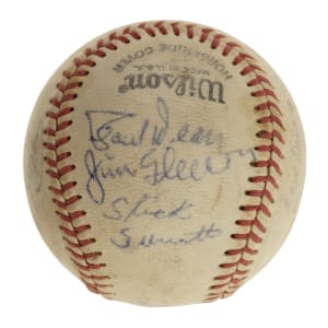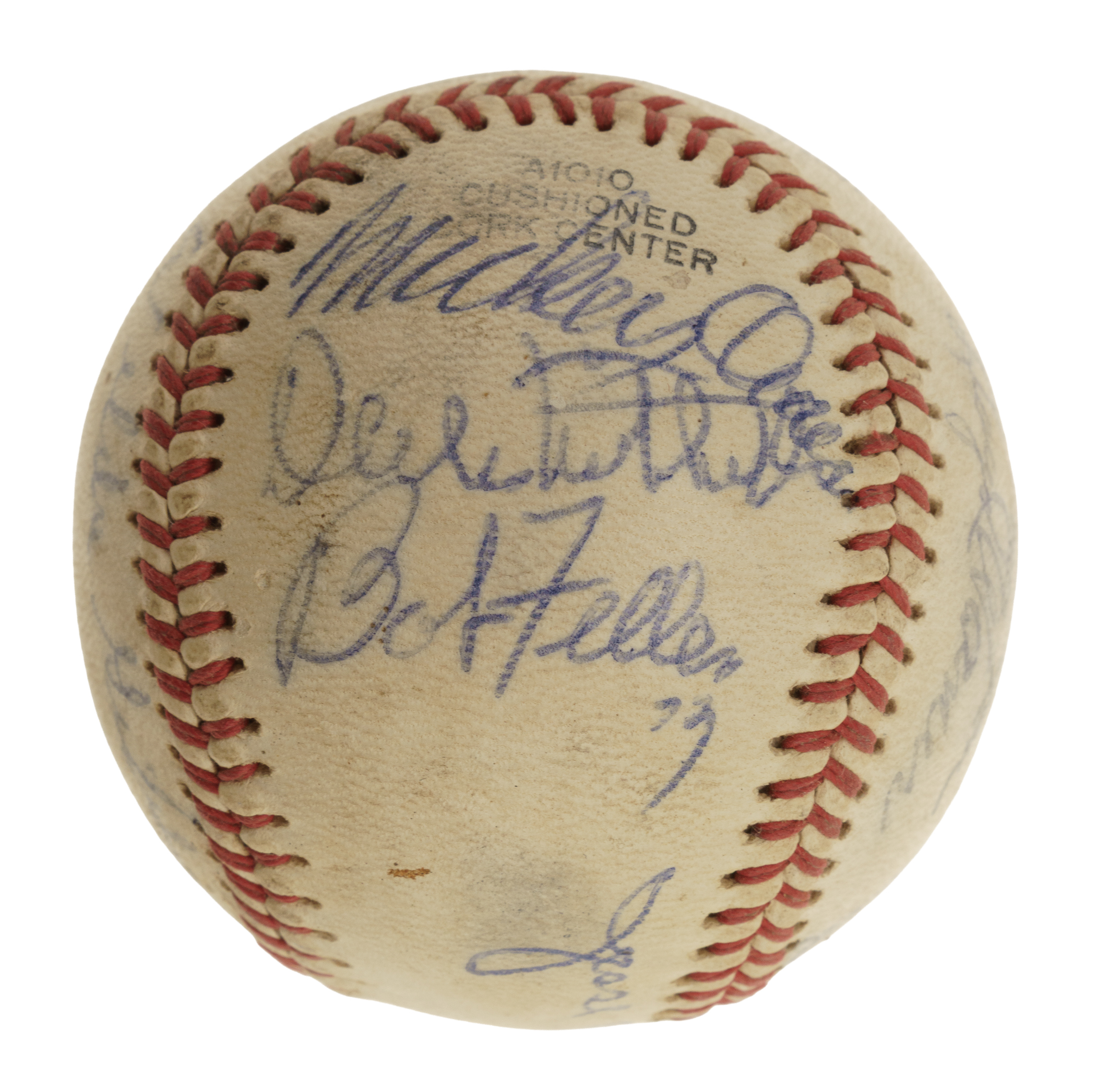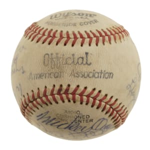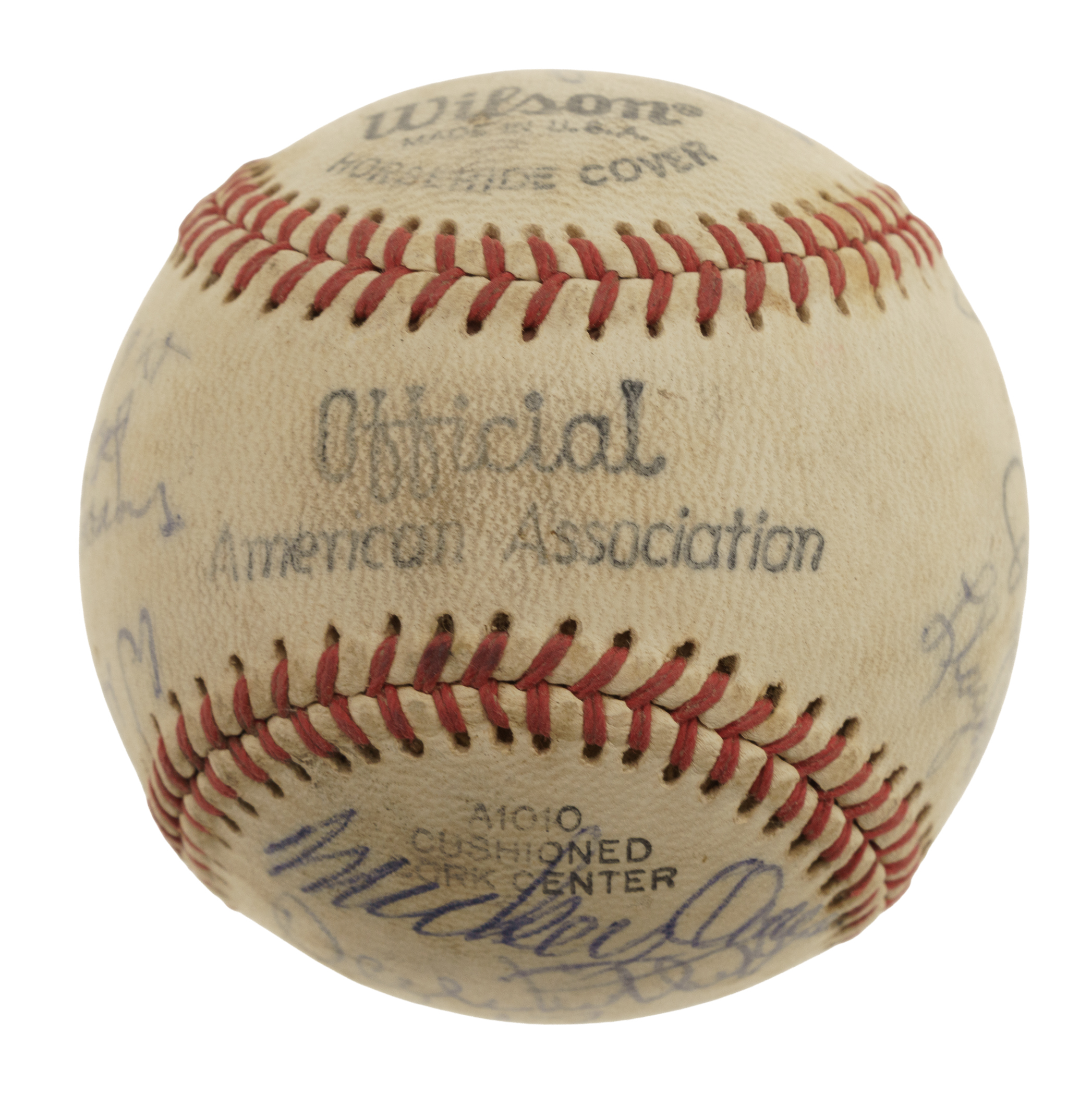 Wilson "Official American Association" baseball (Ryan) signed in blue ink by thirteen former players, including Bob Feller, Lloyd Waner, Paul Dean, Allie Reynolds, Mickey Owen, Bob Boyd, and Jim Gleeson. The ball displays light soiling and a few minor scuffs, otherwise in Excellent condition overall. Auction LOA from James Spence/JSA.