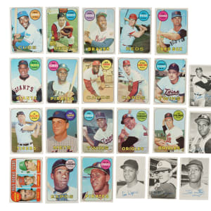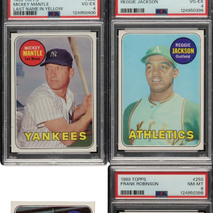 Crisp, clean, mid- to high-grade complete set of 1969 Topps, highlighted by the rookie cards of Oakland A's Hall of Famers Reggie Jackson and Rollie Fingers. Mantle, Clemente, Mays, Aaron, Rose, and other great stars of the era are also included. Also included is a complete 35-card master set of 1969 Topps Deckle Edge inserts. We have selected three cards for grading and encapsulation by PSA. This collection consists of the following: 1) 1969 Topps Complete Set (664) Plus Three Variations: Includes both variations of the following three cards: #49, 208, and 582. The condition of the set is 11% Nr/Mt to Nr/Mt-Mt (mostly Nr/Mt), 52% Ex to Ex-Mt, and 37% Vg to Vg-Ex (Including a couple lesser and a few miscut). Keys: #20 Banks (Ex-Mt), 50 Clemente (Vg-Ex+), 95 Bench (Ex), 100 Aaron (Ex-Mt), 120 Rose (slight trim, otherwise Vg-Ex), 130 Yastrzemski (Nr/Mt), 190 Mays (Vg-Ex), 200 Gibson (Ex), 208a Clendenon/Expos (Vg-Ex), 250 F. Robinson (NM-MT 8), 255 Carlton (Ex), 260 Jackson RC (VG-EX 4), 375 Killebrew (Ex+), 410 Kaline (Ex), 480 Seaver (70/30 T/B, otherwise Nr/Mt), 500 Mantle (VG-EX 4), 510 Carew (Vg+), 533 Ryan (PSA deemed Miscut, otherwise Vg-Ex+), 545 Stargell (Nr/Mt), 550 B. Robinson (Nr/Mt), 573 Palmer (Nr/Mt), and 597 Fingers RC (Vg-Ex). 2) 1969 Topps Deckle Edge Complete Master Set (35): Ranging from Vg to Nr/Mt (averaging Ex+), with most lesser graded due to centering. Keys: #11b Wynn (Nr/Mt), 21 Rose (Ex), 22b Foy (0/100 T/B, otherwise Ex-Mt), 27 Clemente (Ex due solely to centering), and 33 Mays (Vg-Ex+). This is an outstanding collection of 1969 Topps baseball highlighted by a very attractive mid- to high-grade complete set. Total: 702 cards (complete set of 664 plus 35-card deckle edge set and three variations).