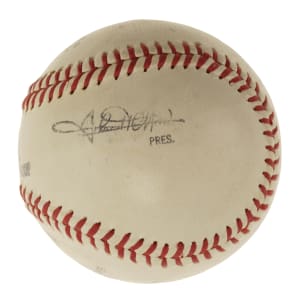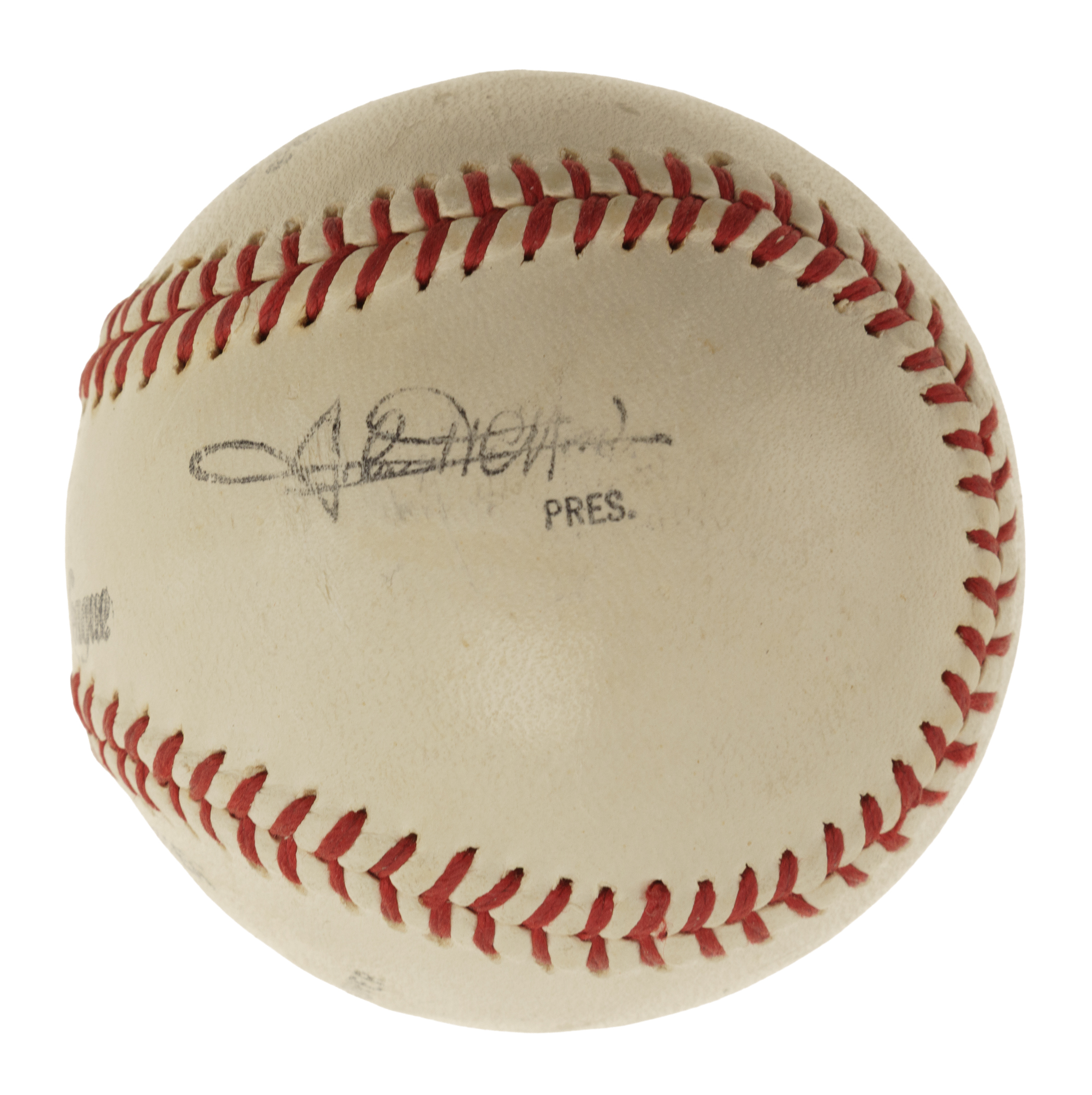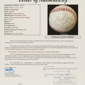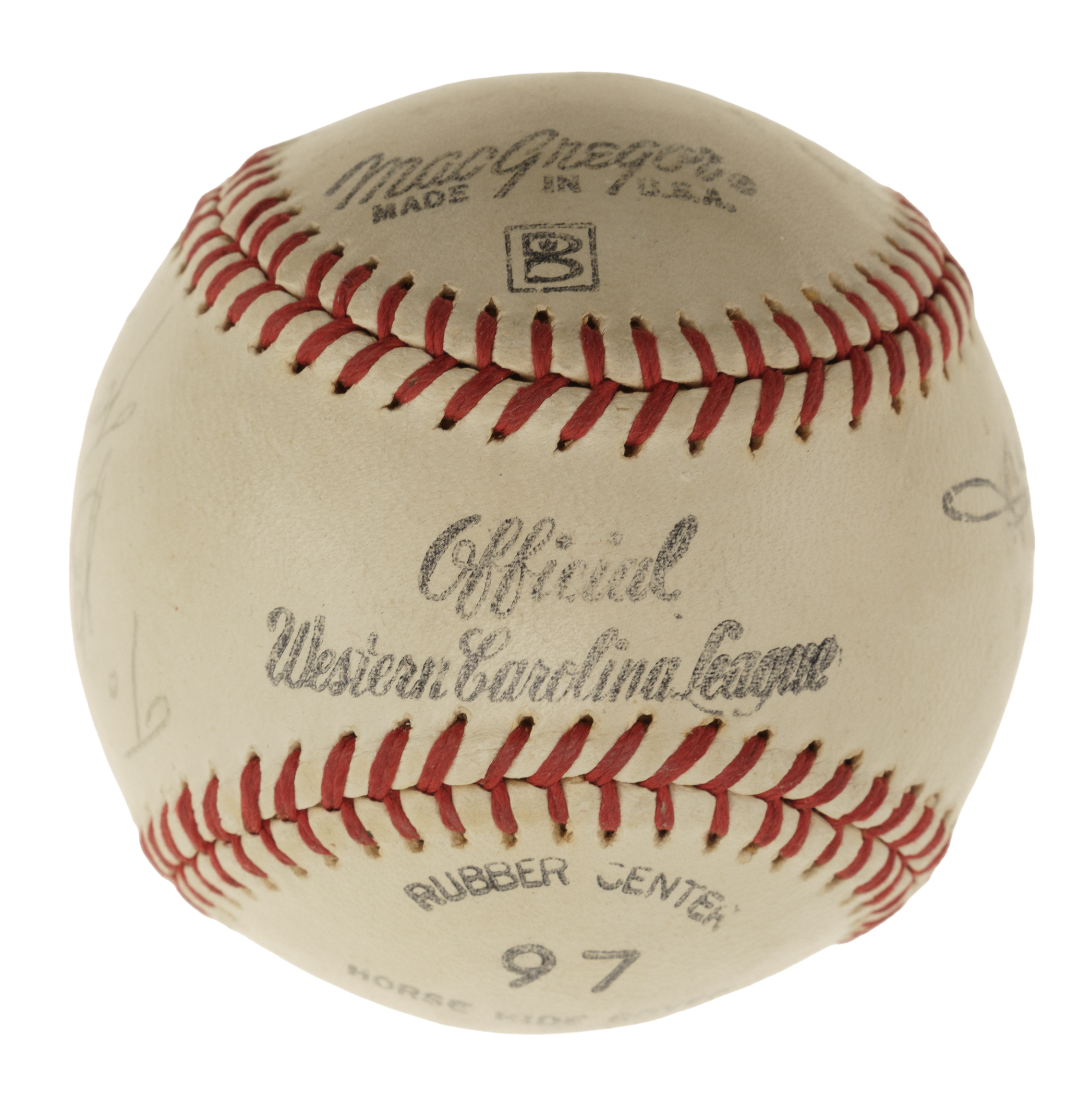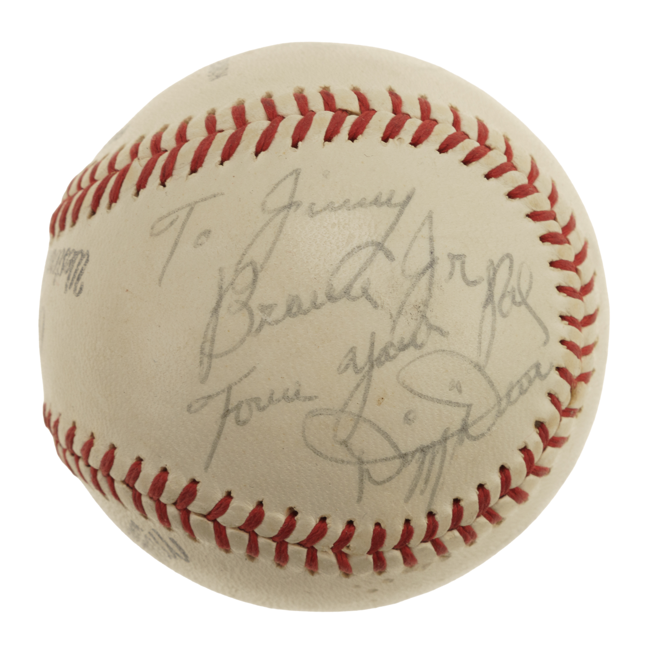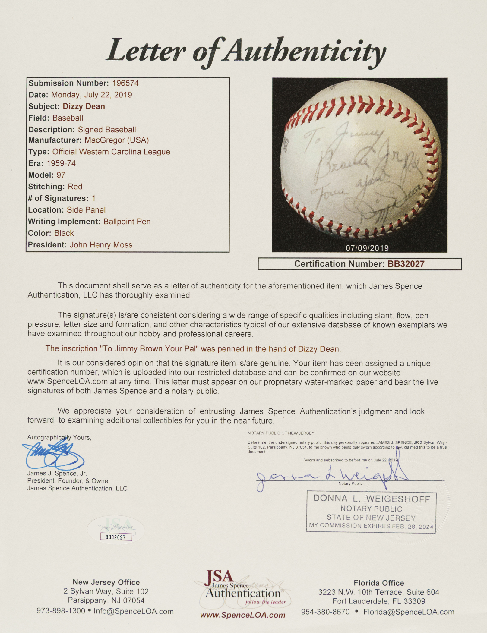 Official Western Carolina League baseball signed in black ballpoint pen on a side panel by Hall of Fame pitcher Dizzy Dean. Dean has inscribed the ball "To Jimmy Brown/Your Pal/Dizzy Dean." Dean died in 1974, before single-signed balls had become the ideal for most autograph collectors. As a result, Dean singles are scarcer than one would imagine. The ball has a few surface abrasions and is in Excellent condition overall.