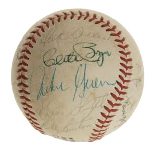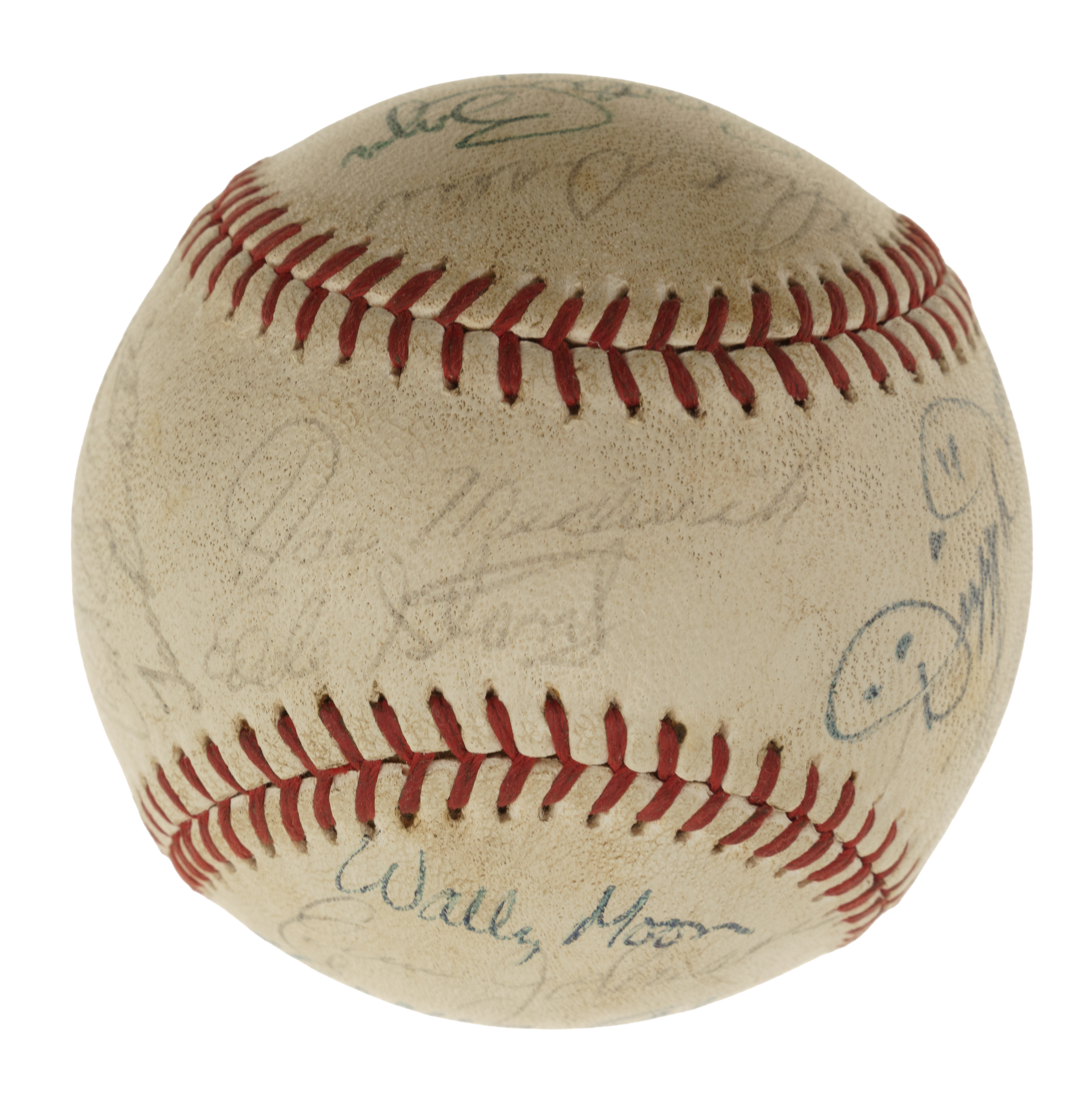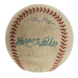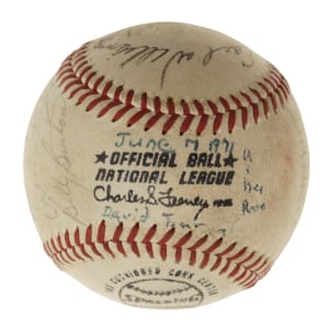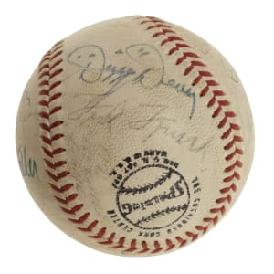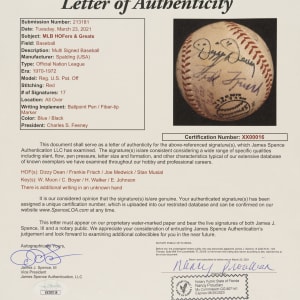Official National League baseball (Feeney) signed in blue and black ink by 17 Hall of Famers and stars. Notable signatures include Joe Medwick (sweet spot), Dizzy Dean, Frankie Frisch, Stan Musial, Wally Moon, Clete Boyer, and Harry Walker. Per James Spence/JSA, "there is additional writing in an unknown hand." The ball is lightly soiled throughout but is otherwise in Excellent condition overall. Full LOA from James Spence/JSA.
