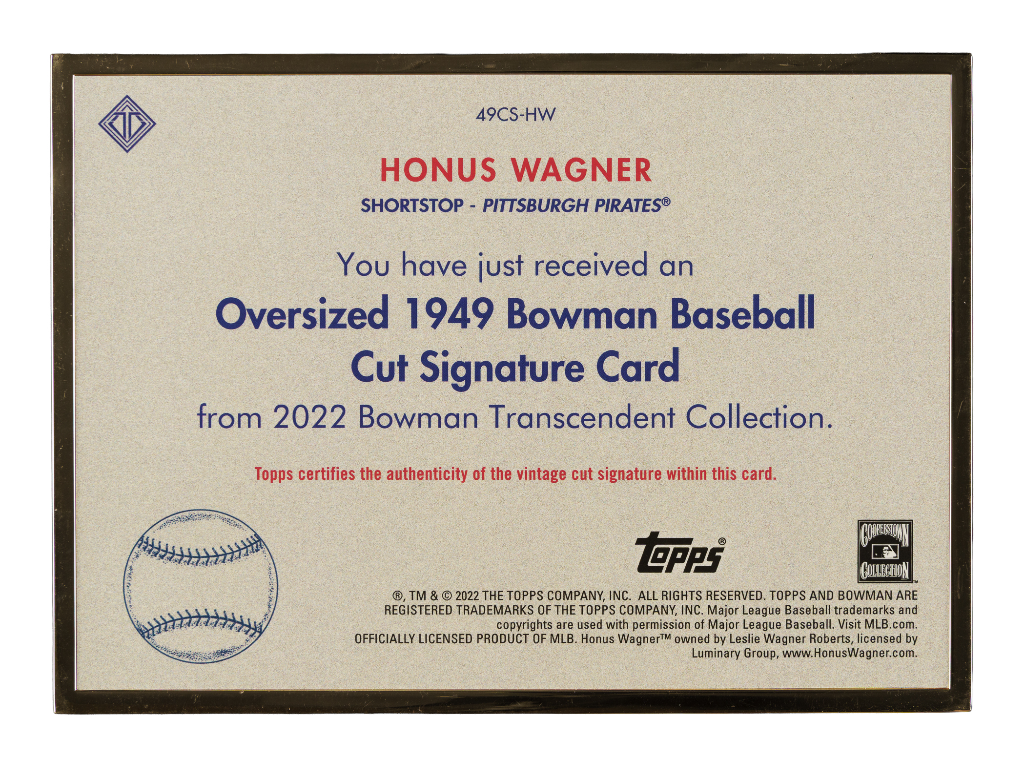 2022 Bowman Transcendent Collection oversized Bowman Baseball cut signature card of Pittsburgh Pirates Hall of Famer Honus Wagner. The limitation number "1/1" is printed on the front. Lettered "49CS-CHW" on the reverse. Wagner cut signature cards are considered by many collectors to be among the most desirable of all signature cards ever issued by Topps, which began the practice of randomly inserting signature and other chase cards into its products in the early 1990s and continues it to this day. Wagner has beautifully scripted in black fountain pen on a cut of lined paper, which is affixed along a partially obstructed 1980 Perez-Steele Wagner. The sizeable card (8 x 6.75 inches) features gold trim and accent. Near Mint condition. This is an outstanding high-grade example of this incredibly rare and desirable modern cut-signature card.