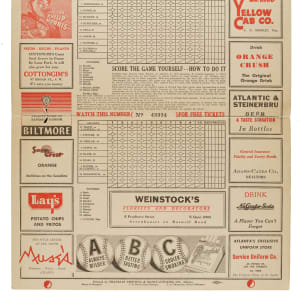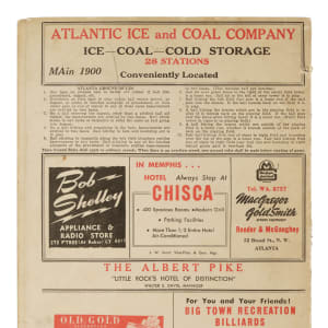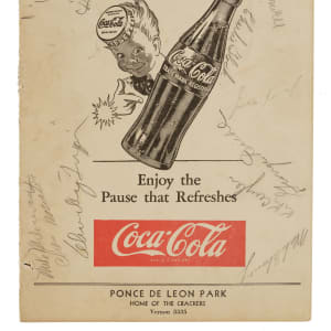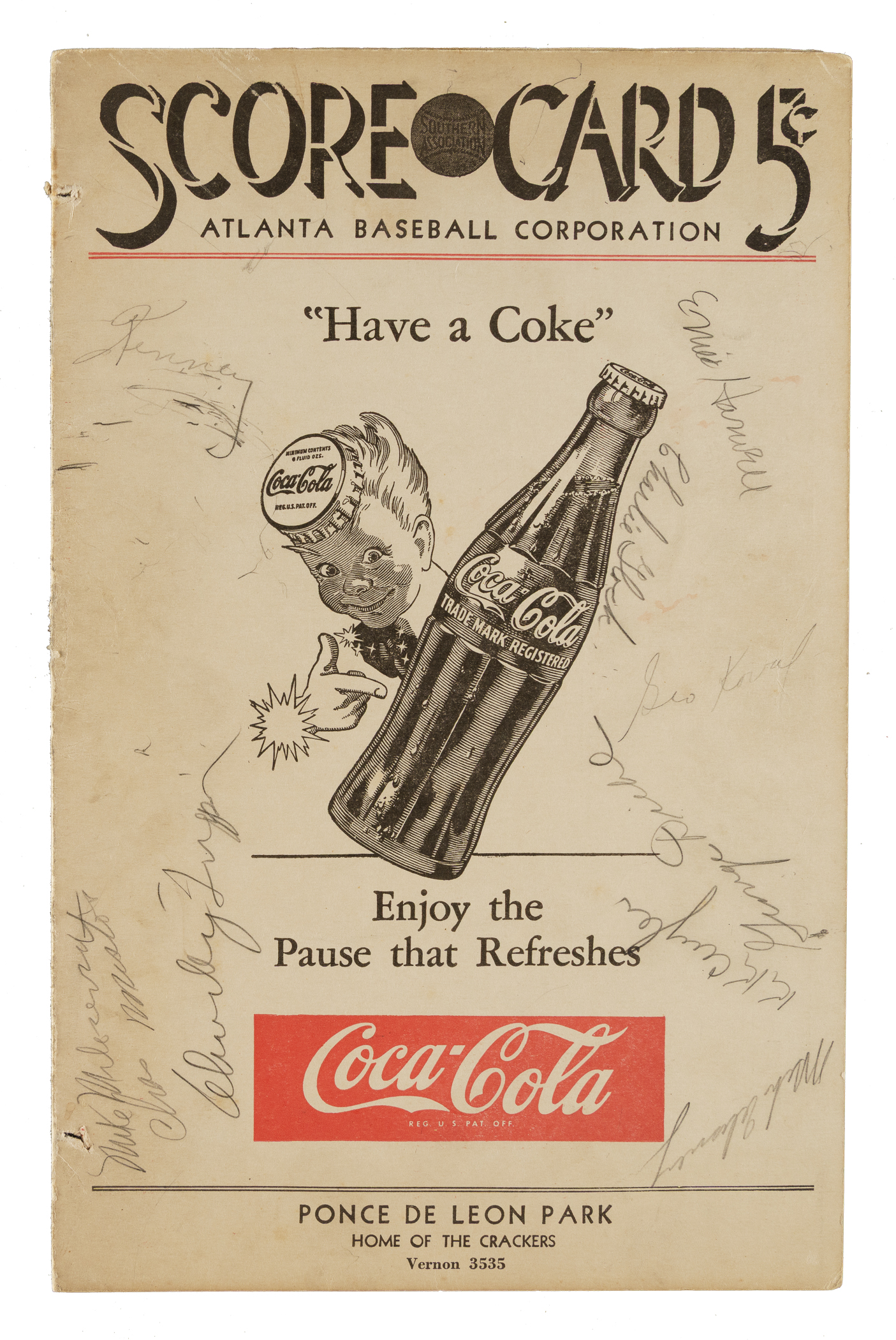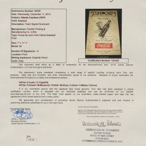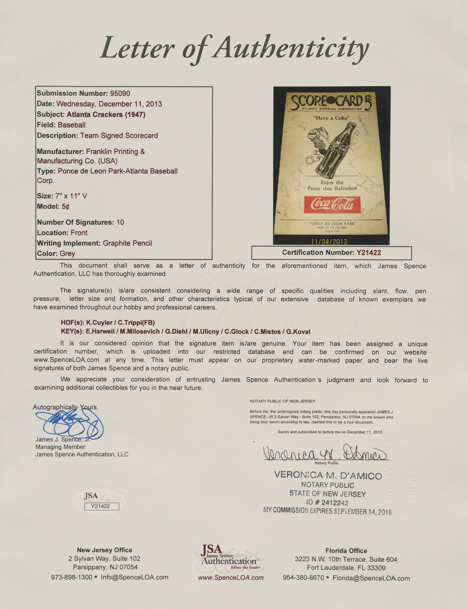 1947 Atlanta Crackers fold-over scorecard signed on the front by ten members of the team. Notable signatures include Kiki Cuyler (mgr.), Charley Trippi (football Hall of Famer), Ernie Harwell (team broadcaster), Mike Milosevich, George Diehl, Charles Klock, Charles Mistos, and George Koval. The program (7 x 11 inches) exhibits a pair of holes along the left edge and multiple stray marks along the reverse. Good condition overall. Full LOA from James Spence/JSA.