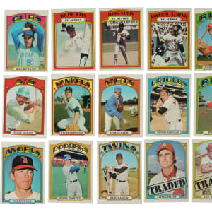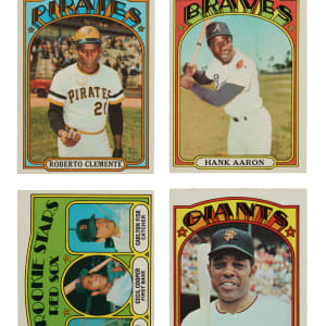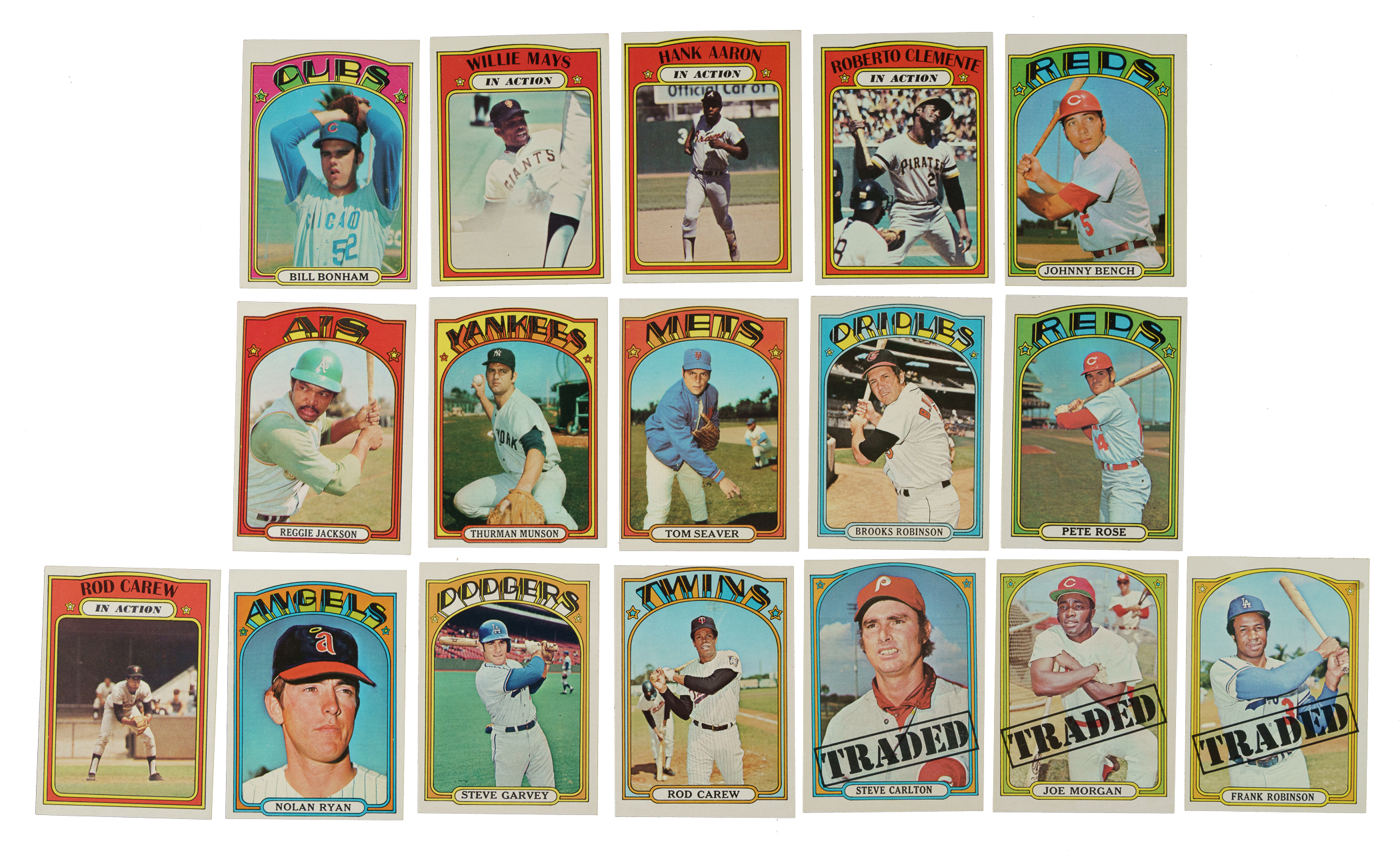 Crisp and clean complete set consisting of 787 cards from the 1972 Topps series, one of the most popular Topps sets of the decade. Condition is 22% Nr/Mt to Nr/Mt-Mt (approximately two-thirds Nr/Mt), 58% Ex to Ex-Mt, and 20% Vg to Vg-Ex (including a couple lesser). Keys: #29b Bonham/green under "C" and "S" (Ex+), 49 Mays (Ex), 50 Mays IA (Vg+), 79 Fisk RC (Ex), 299 Aaron (Vg-Ex), 300 Aaron IA (Ex), 309 Clemente (80/20 T/B, otherwise Nr/Mt), 310 Clemente IA (Nr/Mt), 433 Bench (15/85 L/R, otherwise Vg-Ex+), 435 Jackson (Ex), 441 Munson (Vg-Ex+), 445 Seaver (10/90 L/R, otherwise Ex), 550 B. Robinson (Ex), 559 Rose (Vg-Ex), 595 Ryan (Vg-Ex due to light moisture stain), 686 Garvey (Nr/Mt+), 695 Carew (5/95 T/B, otherwise Nr/Mt-Mt), 696 Carew IA (Ex), 751 Carlton Traded (Vg-Ex), 752 Morgan Traded (Ex due to centering), and 754 F. Robinson Traded (Ex). This is a very attractive mid- to high-grade set of one of the great Topps classics of the era! Total: 787 cards.