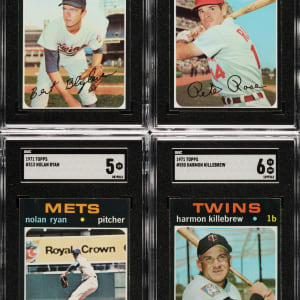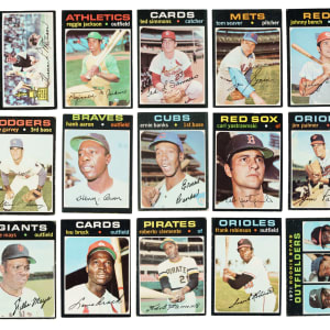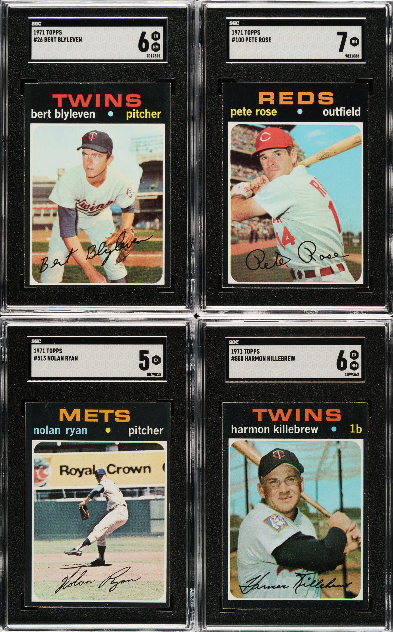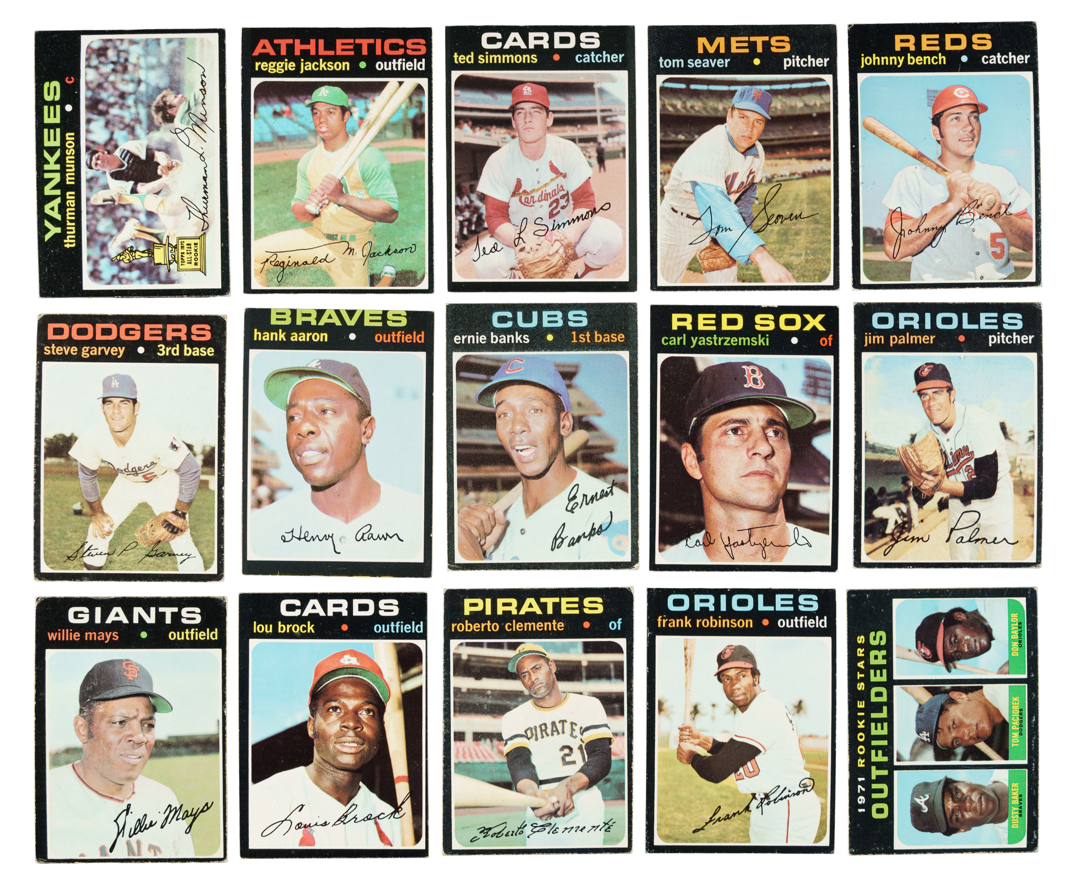 Crisp and clean 1971 Topps set. At 752 cards, the largest set of Topps cards issued up to that time. The black flush-to-the-border design of the 1971 Topps set makes this issue particularly challenging to collect in extremely high grade. Condition is 32% Nr/Mt to Nr/Mt-Mt (mostly Nr/Mt), 55% Ex to Ex-Mt, and 13% Vg to Vg-Ex (including a couple lesser, a few that measure small, and two with color added). We have selected four cards for grading and encapsulation by SGC. Keys: #5 Munson (Vg-Ex+), 20 Jackson (Ex+), 26 Blyleven RC (EX/NM 6), 100 Rose (NM 7), 117 Simmons RC (Vg-Ex), 160 Seaver (Ex), 250 Bench (Vg+), 341 Garvey RC (Vg), 400 Aaron (0/100 T/B, otherwise Ex), 513 Ryan (EX 5), 525 Banks (Vg), 530 Yastrzemski (Vg-Ex+), 550 Killebrew (EX/NM 6), 570 Palmer (Vg), 600 Mays (Vg), 625 Brock (85/15 L/R, otherwise Ex-Mt), 630 Clemente (Vg+), 640 F. Robinson (Ex), and 709 Baylor/Baker RC (Vg-Ex). Extremely attractive mid- to high-grade complete set. Total: 752 cards.