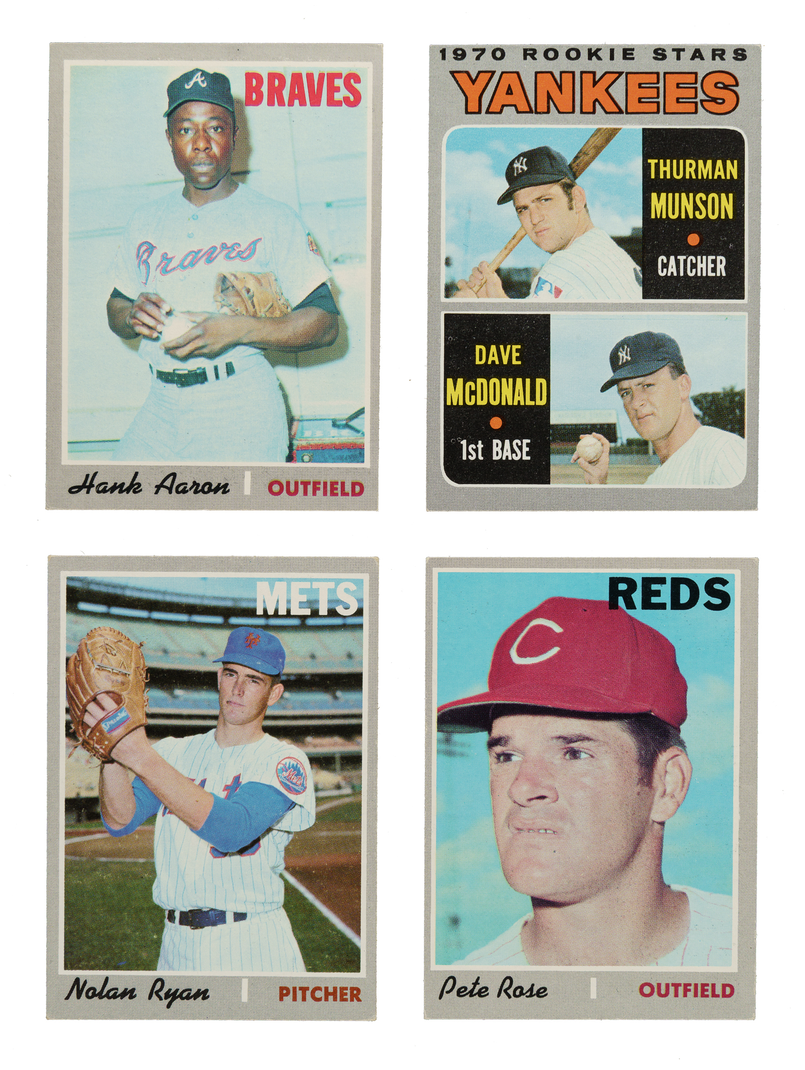 Very attractive complete 1970 Topps set. At 720 cards, the 1970 Topps set was the largest set of Topps cards issued to that date. Condition is 51% Ex-Mt to Nr/Mt (including some Nr/Mt-Mt), 39% Vg-Ex to Ex, and 10% Gd to Vg (including a few miscut and one that measures small). Keys: #1 Mets Team (0/100 L/R, otherwise Ex-Mt), 10 Yastrzemski (miscut centering on reverse, otherwise Ex-Mt), 140 Jackson (Vg), 150 Killebrew (Vg), 189 Munson RC (miscut centering on reverse, otherwise Ex), 290 Carew (Ex), 300 Seaver (slight tilt to picture, otherwise Ex-Mt), 350 Clemente (1/99 L/R, otherwise Vg-Ex+), 449 Palmer (Ex), 462 Aaron AS (miscut right edge, otherwise Ex+), 500 Aaron (Vg+), 530 Gibson (Ex-Mt), 580 Rose (Vg-Ex), 600 Mays (Ex+), 630 Banks (Ex), 640 Kaline (Ex), 660 Bench (Ex-Mt), 700 F. Robinson (Vg), and 712 Ryan (Vg-Ex+). Dating from when sets could not be purchased all at once and had to be assembled by series as they were released throughout the season, this 1970 Topps set includes a countless array of stars and Hall of Famers. This is a very attractive mid- to high-grade complete set of this classic 1970s Topps series. Total: 720 cards.