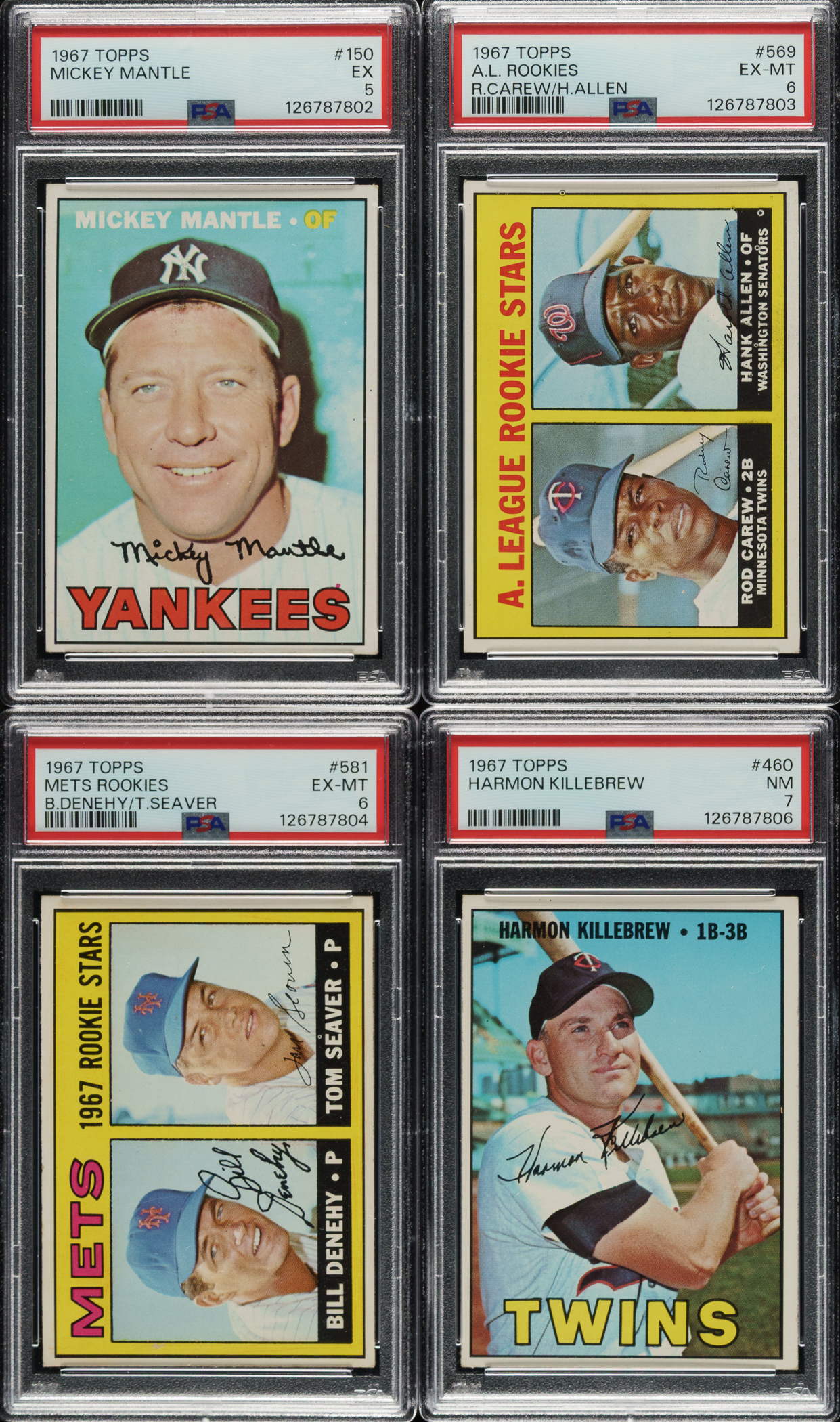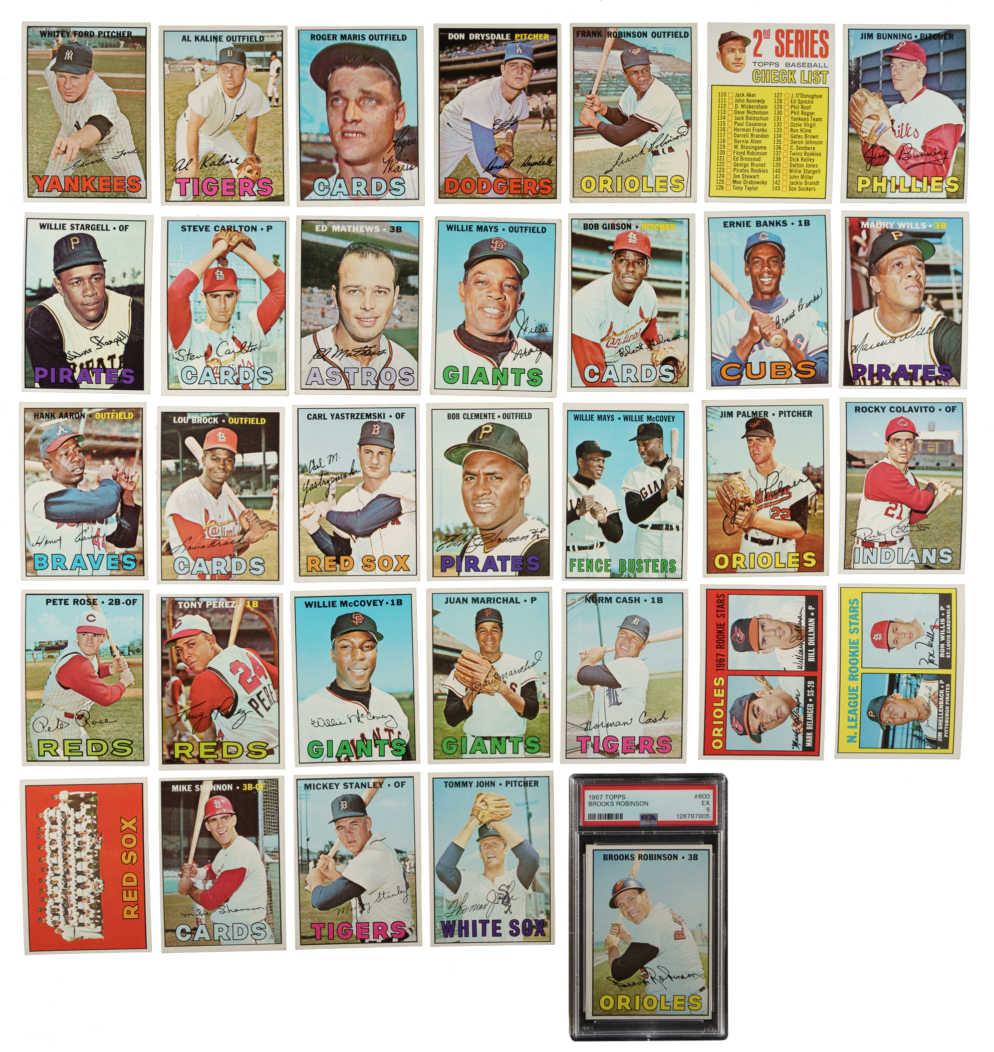 The 1967 Topps set has always been extremely popular, featuring scores of stars and Hall of Famers from what is now fondly remembered by many baby boomers as the Golden Age of baseball cards. This set includes legends such as Mantle, Mays, Aaron, and Clemente, from an era before big money ruled the game, and when the summer All-Star contests were composed almost exclusively of first-rate Hall of Famers. Condition is 17% Ex-Mt to Nr/Mt (approximately two-thirds Ex-Mt), 62% Vg-Ex to Ex, and 21% Gd to Vg (including a few lesser and a few with a slight miscut). We have selected five cards for grading and encapsulation by PSA. Keys: #5 Ford (Vg-Ex), 30 Kaline (Ex), 45 Maris (Vg-Ex+), 55 Drysdale (Vg-Ex), 100 F. Robinson (Vg), 103 Checklist - Mantle (Vg-Ex+), 140 Stargell (Fr due to pinhole), 146 Carlton (Ex), 150 Mantle (EX 5), 166 Mathews (Vg+), 200 Mays (Vg+), 210 Gibson (Ex-Mt), 215 Banks (Ex-Mt+), 250 Aaron (Ex), 285 Brock (Vg-Ex+), 355 Yastrzemski (Ex), 400 Clemente (Vg), 423 Fence Busters (Ex), 430 Rose (Ex), 460 Killebrew (NM 7), 475 Palmer (Vg-Ex+), 476 Perez (Ex), 480 McCovey (Ex+), 500 Marichal (Vg), 540 Cash (Ex-Mt), 558 Belanger RC (Vg-Ex+), 560 Bunning (Ex-Mt), 569 Carew RC (EX-MT 6), 570 Wills (Vg-Ex+), 580 Colavito (Ex+), 581 Seaver RC (EX-MT 6), 592 NL Rookies (Vg+), 600 B. Robinson (EX 5), 604 Red Sox Team (Ex), 605 Shannon (Ex), 607 Stanley (Ex), and 609 John (Vg-Ex). Also included is a complete set of thirty-two 1967 Topps Pin-Ups, highlighted by seventeen Hall of Famers, including Aaron, Clemente, Mantle, and Mays. The pin-ups offer a very presentable appearance from the fronts, but technically grade very modestly due to glue residue on the backs. Very attractive mid- to high-grade complete set with numerous highlights. Total: 609 cards and 32 pin-ups.