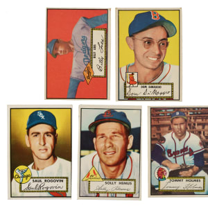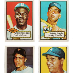 Complete 402-card set of 1983 Topps Archives "1952 Reprint" baseball cards. Condition ranges from Ex-Mt to Mint (averaging Nr/Mt+), with a few slightly lesser. Key: #311 Mantle (Nr/Mt). Included are the following five authentic 1952 Topps cards (the five cards that were not allowed to be re-printed in 1983): #20 Loes (trimmed, otherwise Vg, black back), 22 D. DiMaggio (trimmed, otherwise Gd+), 159 (trimmed, otherwise Vg due to 100/0 L/R centering), 196 (trimmed, otherwise Vg), and 289 (trimmed, otherwise Vg-Ex). Total: 407 cards.
