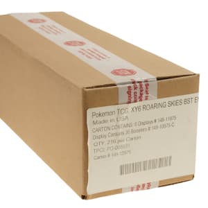 Extremely desirable factory-sealed booster box case from the 2015 Pokémon XY Roaring Skies series. The case contains six unopened boxes, with 36 packs per box for a total of 216 packs. The 110-card Evolving Skies set is particularly significant in the Pokémon community as it features the iconic Shaymin EX and M Rayquaza EX. Other notable Pokémon with desirable cards in the series include Rayquaza, Latios, and Latias. The original outer case displays minimal wear. The size/weight of this item requires that there will be an additional shipping charge for this lot.
