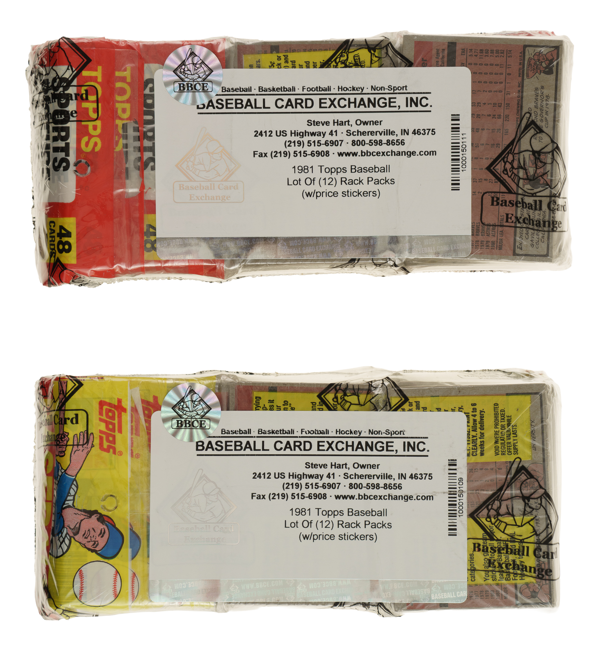 Collection of twenty-four 1981 Topps baseball unopened rack packs. The rack packs, which feature price stickers, come shrink-wrapped by Baseball Card Exchange (owned by Steve Hart, the foremost expert on unopened material) in 12-count groups. Total: 24 rack packs.