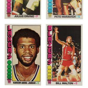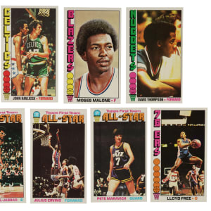 Presented is a complete 144-card set of 1976-1977 Topps basketball cards highlighted by numerous Hall of Famers, including Julius Erving, Kareem Abdul-Jabbar, David Thompson (rookie), and Pete Maravich. Condition is 35% Nr/Mt to Nr/Mt-Mt, 53% Ex to Ex-Mt, and 12% Vg to Vg-Ex. Keys: #1 Erving (Vg), 57 Walton (Ex-Mt), 60 Maravich (Nr/Mt), 90 Havlicek (Nr/Mt), 100 Abdul-Jabbar (Ex due to centering), 101 Malone (Ex-Mt), 110 Thompson RC (Nr/Mt), 126 Abdul-Jabbar AS (Nr/Mt+), 127 Erving AS (Vg-Ex), 130 Maravich AS (Nr/Mt), and 143 Free RC (Ex). A very attractive mid- to high-grade complete set of this popular 1970s issue! Total: 144 cards.