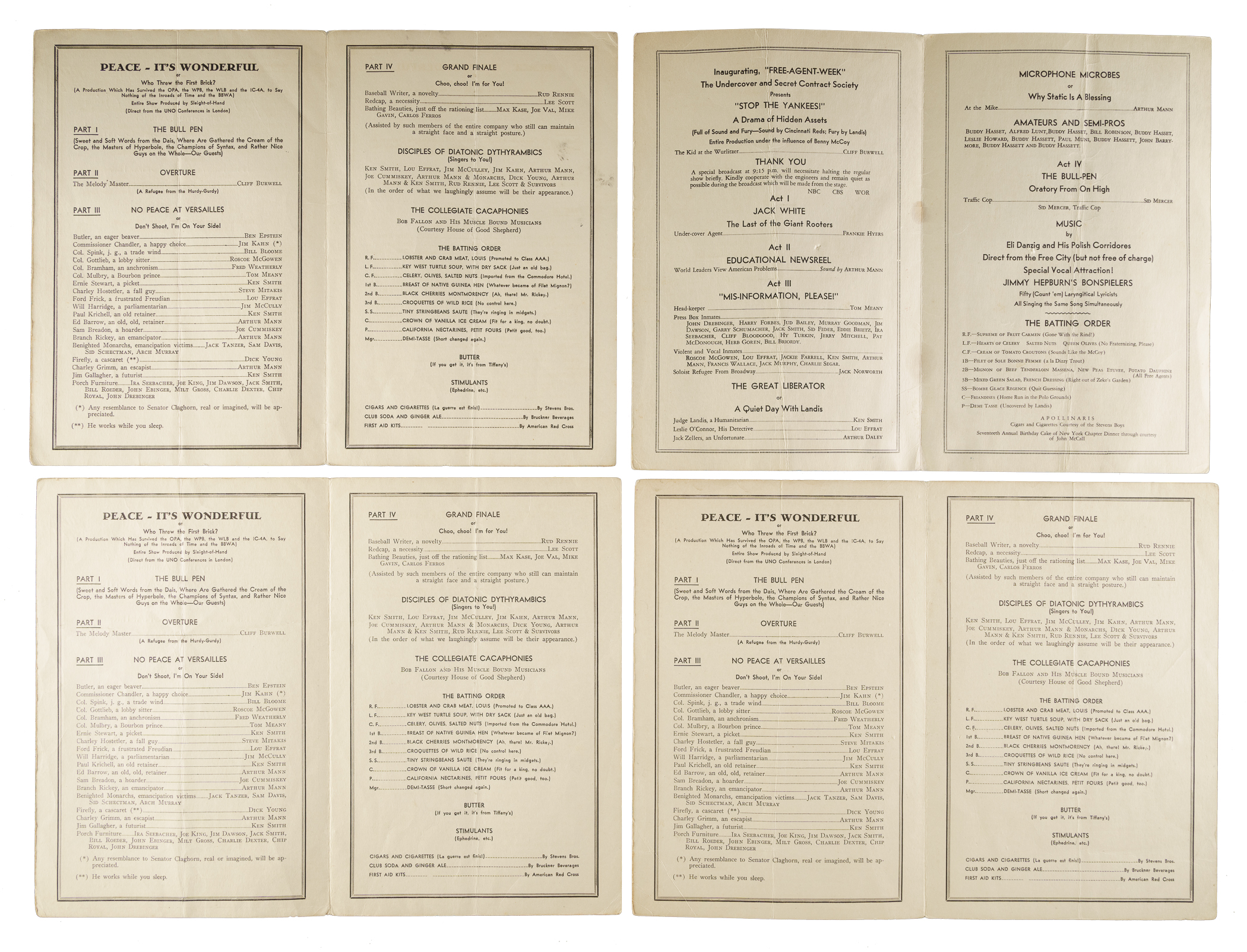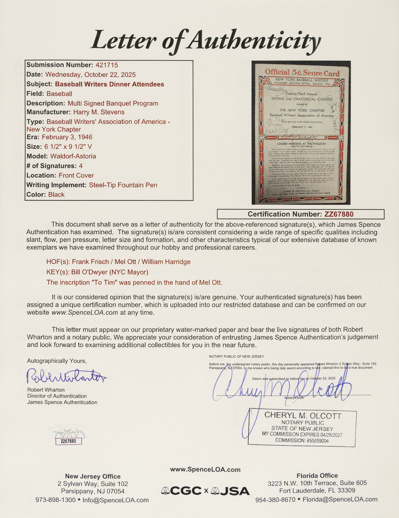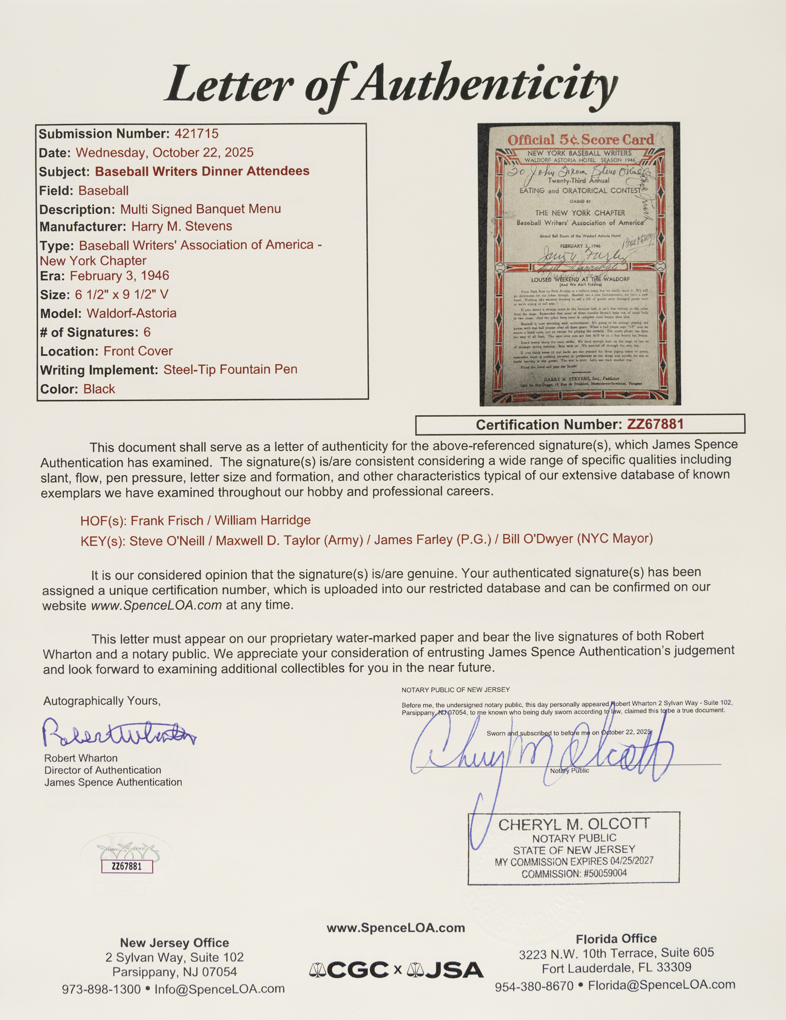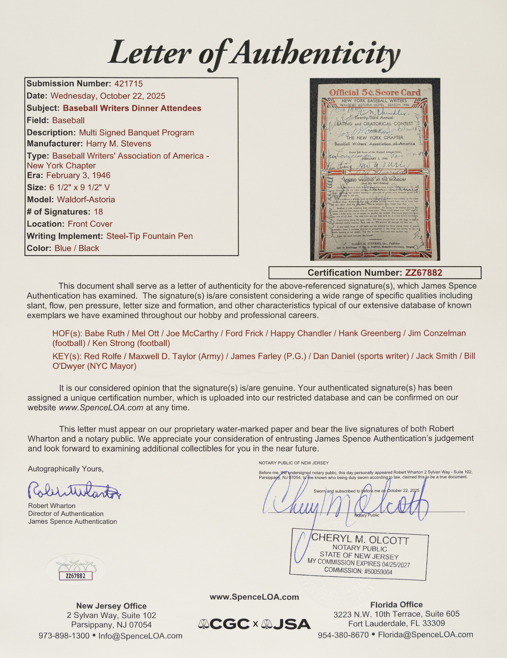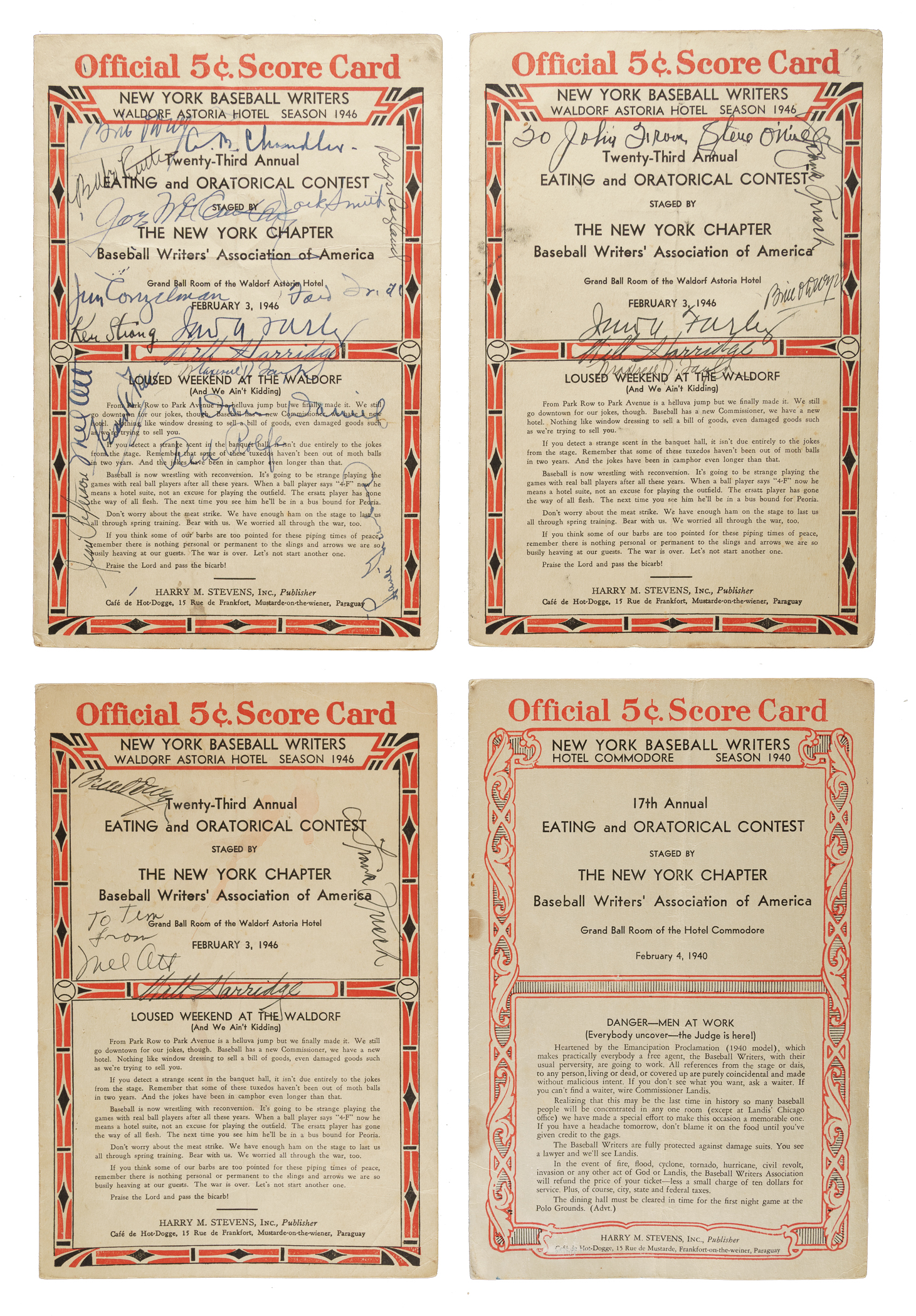 Presented is a collection of three 1946 New York Baseball Writers' 23rd Annual Dinner itineraries (designed as a fold-over scorecard), each signed on the front cover by a number of different notables, highlighted by 20 baseball Hall of Famers, including Babe Ruth, Mel Ott, Frank Frisch, and Hank Greenberg. The signatures are all penned on the front covers in either blue or black ink. 1) First example has 18 signatures including Babe Ruth, Mel Ott, Hank Greenberg, Happy Chandler, Ford Frick, Joe McCarthy, Will Harridge, Red Rolfe, Ken Strong (football Hall of Famer), Jim Peterson, Jack Smith, Dan Daniel (sportswriter), and James A. Farley (US postmaster general). 2) Second example has four signatures (personalized "To Tim/from"): Mel Ott, Frank Frisch, Will Harridge, and Bill Veeck. 3) Third example has six signatures (personalized "To John/From"): Frank Frisch, Will Harridge, Bill Veeck, Steve O'Neill, James A. Farley (US postmaster general), and one we could not identify. Also included is an unsigned 1940 New York Baseball Writers' 17th Annual Dinner itinerary. All the itinerary "Score Cards" are in Fair condition. Total: 4 items (three signed). Full LOA from James Spence/JSA.