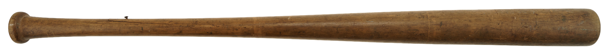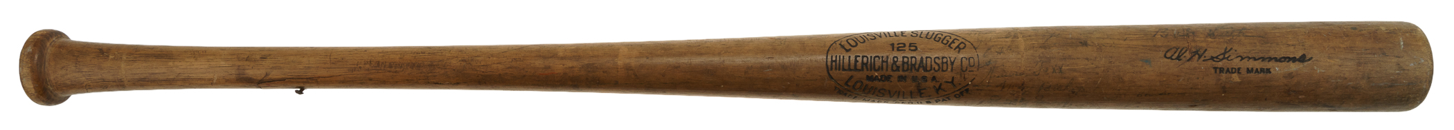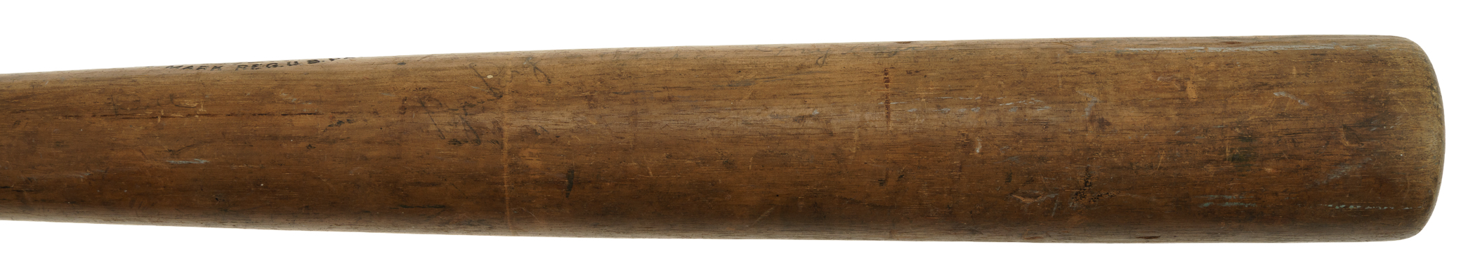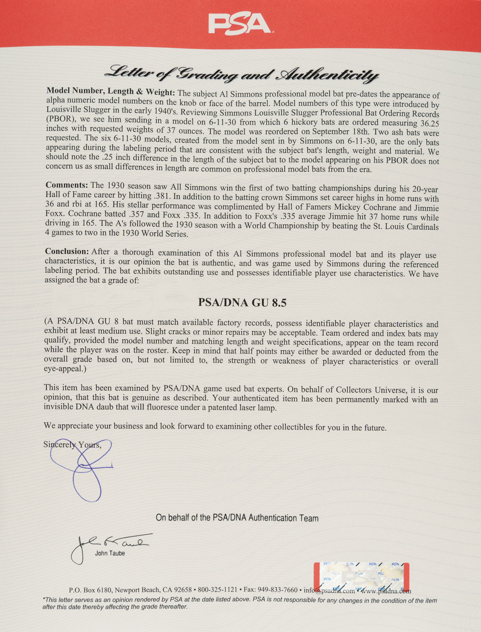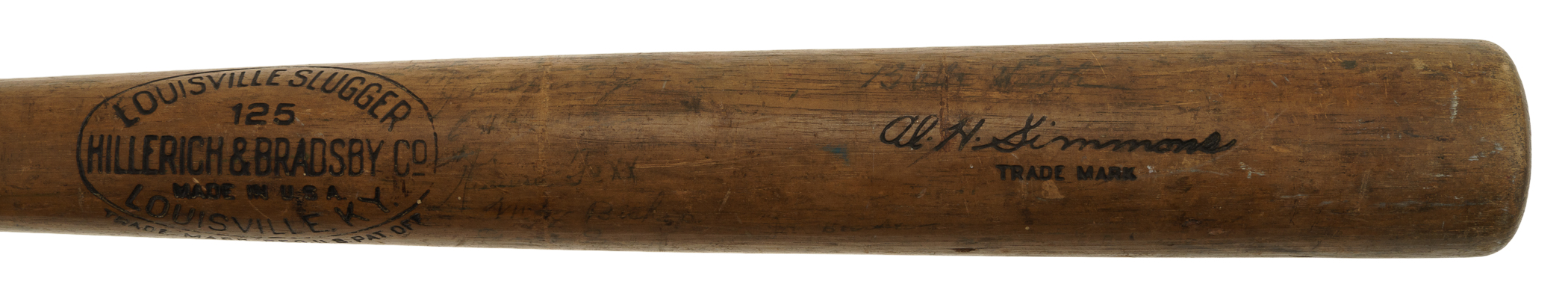 Extraordinary Al Simmons H&B signature-model "6-11-30" bat dating from the Hall of Famer outfielder's magical 1930 season in which he won the American League batting title and finished second in league MVP voting. Graded GU 8.5 by PSA. Adding to the bat's significance is that it has been signed by 12 of Simmons' contemporaries who played for either the Philadelphia Athletics or New York Yankees in 1930. The bat is signed by Babe Ruth, Tony Lazzeri, Jimmie Foxx, Mickey Cochrane, Lou Gehrig, Chas "Red" Ruffing, Bill Dickey, Lyn Lary, Max Bishop, Cy Perkins, Mule Haas, and Joe Boley. (According to the letter from JSA, the signature of Babe Ruth has been enhanced in an unknown hand.) Vintage signatures on a pro-model bat are extremely desirable because they undeniably place the bat in that particular player's hands during a narrowly defined period of his career. There is a strong likelihood this bat was signed before or after one of the 22 games the teams played that season. The bat, which is cracked and has been secured with a single nail, displays outstanding use along its entire length, including ball marks and green bat rack streaks on the barrel. Simmons enjoyed arguably the finest season of his career in 1930, finishing with a league-leading .381 batting average and 152 runs scored to go with a career high 36 home runs and 165 RBI. Simmons continued his torrid hitting during the World Series against the St. Louis Cardinals, batting .364 with two home runs and eight RBI. His defining moment came in Game 6, as his go-ahead home run in the third inning provided the deciding run that clinched the Athletics' second straight championship. Simmons retired in 1944 with a .334 career batting average, 307 home runs, and 1,827 RBI. He was elected to the Hall of Fame in 1953. Length: 36.5 inches. Weight: 36.6 ounces. Full LOA from John Taube of PSA/DNA (bat only, corresponding sticker affixed to the handle). Full LOA from James Spence/JSA (autographs only). The size/weight of this item requires that there will be an additional shipping charge for this lot.