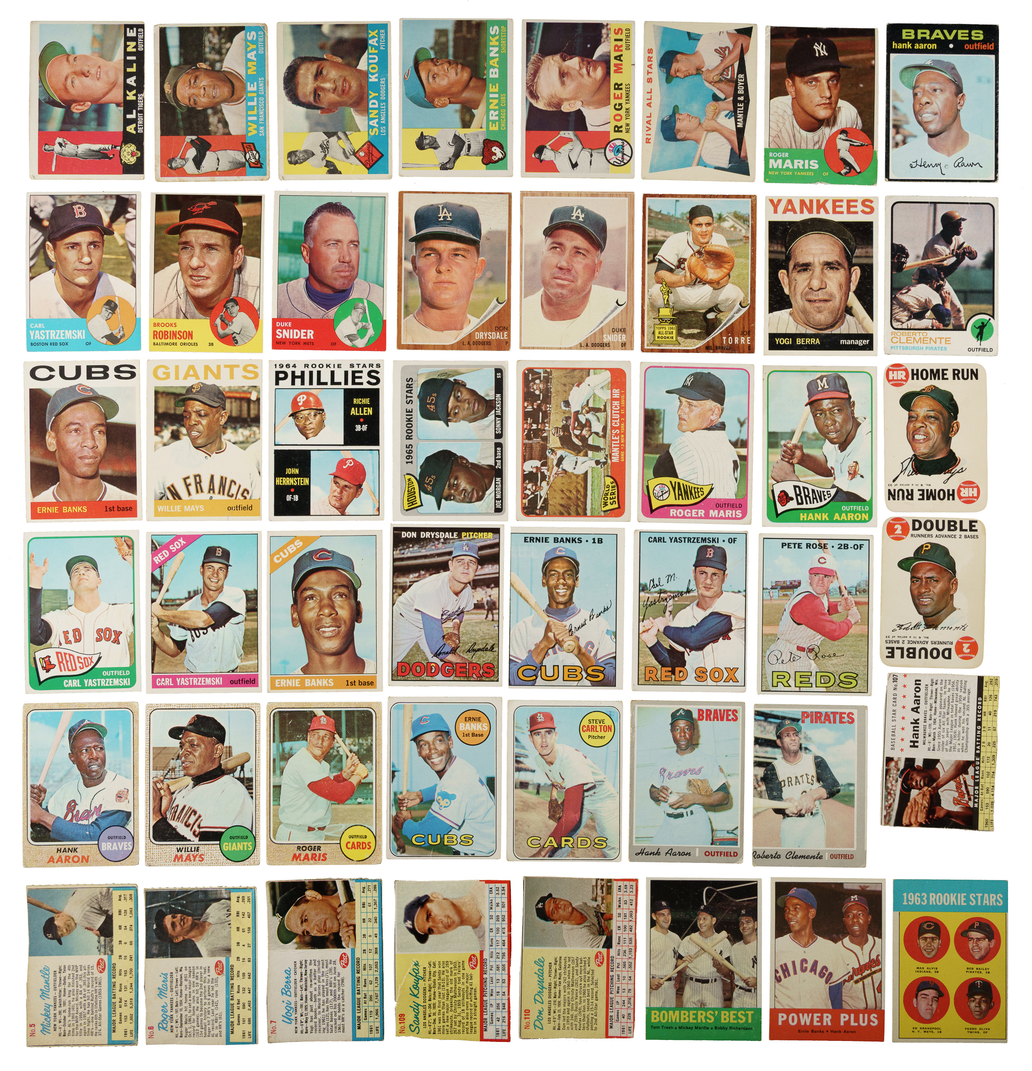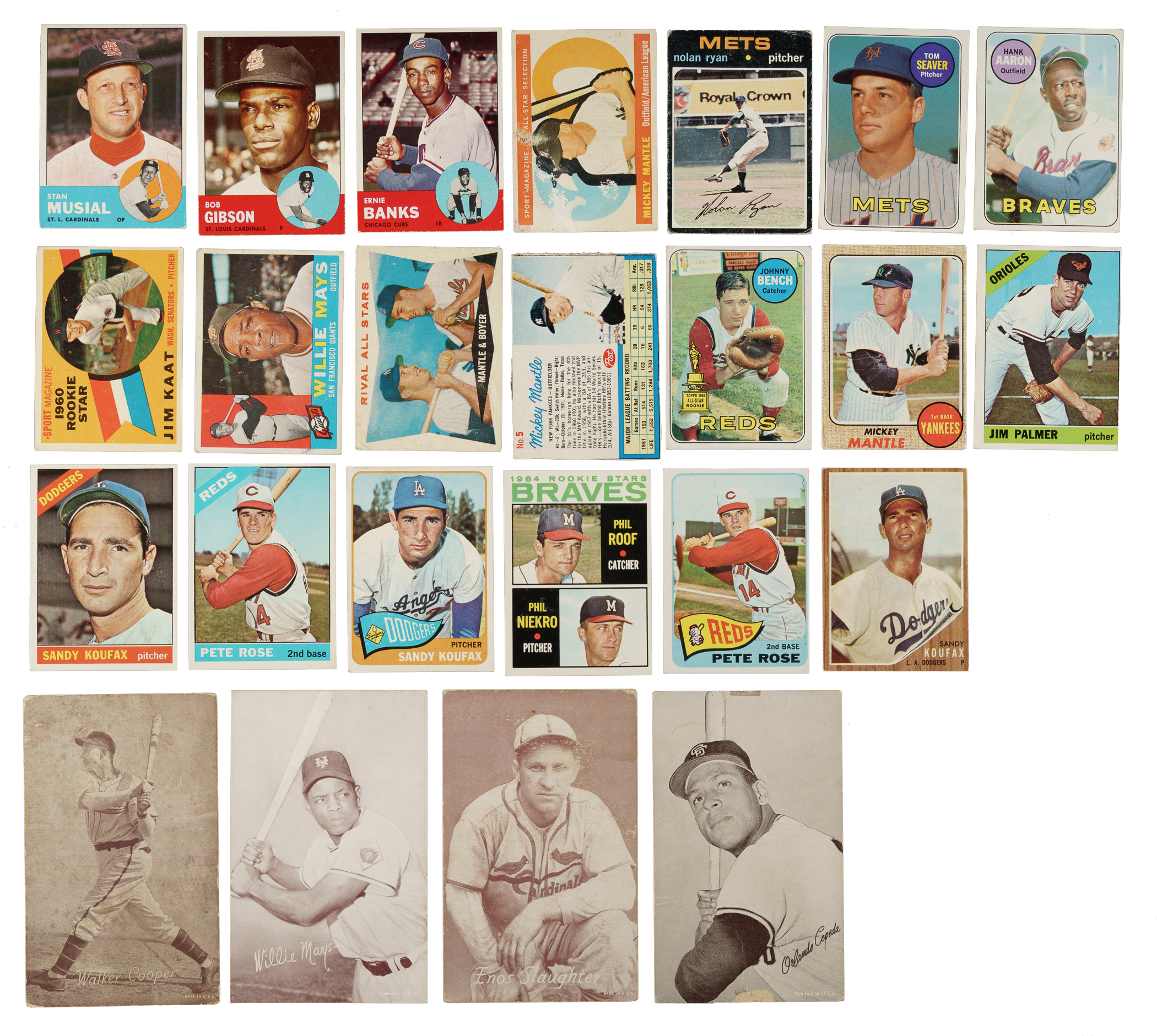 Shoebox collection of 756 baseball cards, including Topps, Fleer, Leaf, Post Cereal, and Exhibit issues, spanning the years 1960 to 1975. The collection is highlighted by 262 Hall of Famers, including Mickey Mantle, Willie Mays, Hank Aaron, Roberto Clemente, and Sandy Koufax. We have selected four cards for grading and encapsulation by SGC. This collection consists of the following: 1) 1947-66 Exhibits (3 cards): W. Cooper/"Made in U.S.A." (Pr-Fr), Mays/batting, "Printed in U.S.A." (Vg), and Slaughter (Pr-Fr). 2) 1960 Topps (65 cards): Condition ranges from Pr to Vg (averaging Fr-Gd). Keys: #1 Wynn (Pr), 7 Mays/Rigney (Fr), 10 Banks (Vg), 28 B. Robinson (Fr-Gd), 35 Ford (Vg), two 50 Kaline (100/0 T/B, otherwise Vg and Pr), 100 Fox, 136 Kaat RC (Vg+), two 160 Mantle/Boyer (Fr and ink marks on reverse, otherwise Gd), 173 Martin, 188 D. Williams, two 200 Mays (Fr and Pr), 212 Alston, 227 Stengel (Gd), two 240 Aparicio, 295 Hodges, 305 Ashburn, 343 Koufax (Fr), 365 Minoso, 377 Maris (Gd), 395 Wilhelm, 450 Cepeda, 475 Drysdale (Gd), 480 Berra (Fr), 490 F. Robinson (Vg), 502 Bunning, 505 Kluszewski, and 563 Mantle AS (Pr). 3) 1960 Leaf (1 card): #126 (Fr). 4) 1960 Fleer Baseball Greats (1 card): #62 Wagner (Pr). 5) 1961 Topps (12 cards): Condition ranges from Pr to Vg (averaging Fr-Gd). Includes: #19, 41 NL Batting Ldrs (Gd), 49 NL K Ldrs, 133, 168, 185, 318, 320, 330, 345, 385, and 513. 6) 1961 Fleer Baseball Greats (2 cards): #34 Gomez (Gd) and 76 Sewell (Fr). 7) 1961 Post Cereal (37 cards): Without respect to the neatness of the hand cuts, the condition ranges from Pr to Vg (averaging Gd), with a couple Vg-Ex. Keys: #19 Aparicio (Gd), 20 Fox (Gd), 25 Minoso (Gd+), 35 Kaline (Pr), 92 Killebrew (Fr), 107 Aaron (Fr), and 144 Cepeda (Vg). 8) 1962 Statistic Back Exhibits (1 card): Cepeda (Pr). 9) 1962 Post Cereal (9 cards): #5a Mantle (Gd, from box), 5b Mantle (Fr, from Life Magazine), 6b Maris (Fr, from Life Magazine), 7 Berra (Gd), 12 Arroyo SP (Vg), 49 Aparicio (Gd), 109a Koufax/blue lines (Pr), 110 Drysdale (Vg), and 122 F. Robinson (Fr). The preceding are graded without respect to the neatness of the hand cuts. 10) 1962 Topps (47 cards): Condition ranges from Pr to Ex (averaging Vg). Keys: #5 Koufax (Vg-Ex), 52 NL Batting Ldrs, 53 AL HR Ldrs (Pr), 54 NL HR Ldrs, 100 Spahn (10/90 T/B, otherwise Ex), nine assorted Babe Ruth Specials (#135-144), 139d Babe Hits 60/no pole in background (Vg-Ex), 140 Gehrig/Ruth (Gd), 167 McCarver RC (Vg-Ex+, green tint), 208 Martin, 218 Torre RC (Vg-Ex+), 340 Drysdale (Vg+), 350 F. Robinson (Vg), 353 Mazeroski (Ex), 387 Brock RC (VG/EX+ 4.5), 401 Maris/Cepeda (Vg-Ex+), and 500 Snider (Ex). 11) 1963 Topps (130 cards): Condition ranges from Pr to Ex (Vg-Ex), with a few Ex-Mt. Keys: #1 NL Batting Ldrs, 2 AL Batting Ldrs, 3 NL HR Ldrs, 5 NL ERA Ldrs, 9 NL K Ldrs, 18 Buc Blasters (Vg), 25 Kaline (Ex), 54b DeBusschere RC/1963, 68 Friendly Foes (Vg-Ex+), 108 Wilhelm, 115 Yastrzemski (Ex), 120 Maris (Pr), two 125 Roberts, 126 Uecker (Vg-Ex+), two 135 Ashburn, 138 Mays/Musial (Vg-Ex), 142 WS Gm. 1 - Ford, 144 WS Gm. 3 - Maris, 154 Alston, 169 Perry (Ex), 173 Bombers' Best with Mantle (Ex), 190 Minoso, 205 Aparicio, 228 Oliva RC (Vg+), 233 Stengel, 242 Banks/Aaron (Ex), 245 Hodges, 250 Musial (Vg-Ex), 252 Santo (Ex), 275 Mathews (Ex), 320 Spahn (Vg-Ex), 323 Mazeroski (Vg+), 345 B. Robinson (Ex), 353 B. Williams, 365 Bunning, 380 Banks (Ex), 400 F. Robinson (Gd), 412 Dodgers' Big Three (Ex), 415 Gibson (Ex), 440 Marichal (Ex), 473 Mets Team, 490 McCovey (Vg-Ex+), 500 Killebrew (Ex), 525 Fox, two 544 Staub RC (both Ex), 550 Snider (Ex), and 562 McNally RC (Vg-Ex). 12) 1963 Fleer (32 cards): Condition ranges from Pr to Ex (averaging Vg). Keys: #4 B. Robinson (Vg-Ex+), 8 Yastrzemski (Ex), two 32 Santo (both Vg-Ex), 41 Drysdale (Pr due to tape remnants), 42 Koufax (EX/NM 6), 59 Mazeroski (Ex), 61 Gibson (Ex), and 64 Cepeda (Fr). 13) 1964 Topps (165 cards): Condition is 10% Ex, 16% Vg to Vg-Ex, and 74% lesser (mostly due to pencil or partially erased pencil on the reverses). Keys: #5 NL K Ldrs, 7 NL Batting Ldrs, 9 NL HR Ldrs, 11 NL RBI Ldrs, 21 Berra (Vg+), 29 Brock (Ex+), two 35 Mathews (Vg-Ex+ and pencil on reverse, otherwise Ex), two 55 Banks (pencil on reverse, otherwise Ex and Vg+), 70 Torre, two 81 Fox/Killebrew, two 102 Floodr, two 116 Oliva (partially erased pencil on reverse, otherwise Ex+ and Fr), two 120 Drysdale (both with partially erased pencil on reverse, otherwise Vg-Ex), 136 Koufax WS Gm. 1 (partially erased pencil on reverse, otherwise Vg), 146 John RC (Vg), 150 Mays (Pr), 155 Snider (Vg), 167 Piniella RC, two 175 B. Williams, 177 Killebrew (pencil on reverse, otherwise Vg-Ex+), 182 Yaz/Schilling, 200 Koufax (EX 5), 205 Fox, two 210 Yastrzemski (both Ex), 225 Maris (Vg-Ex), 230 B. Robinson (pencil on reverse, otherwise Ex), 243 Allen RC (Vg-Ex), 250 Kaline (Ex+), two 260 F. Robinson (Ex+ and partially erased pencil on reverse, otherwise Ex+), 265 Bunning, two 280 Marichal, 287 T. Conigliaro RC, 306 Mays/Cepeda (pencil on reverse, otherwise Vg-Ex+), two 324 Stengel, 342 Stargell (partially erased pencil on reverse, otherwise Vg), 350 McCovey (partially erased pencil on reverse, otherwise Vg-Ex+), 375 Santo, 380 Ford (partially erased pencil on reverse, otherwise Ex), 390 Cepeda, two 400 Spahn (Gd and pencil on reverse, otherwise Ex-Mt), 423 Aaron/Mays (partially erased pencil on reverse, otherwise Vg-Ex), 433 Yankees Team, two 460 Gibson (partially erased pencil on reverse, otherwise Ex-Mt and Vg-Ex), 468 Perry, 540 Aparicio, 541 Niekro RC (Ex), 538 Minoso, 543 Uecker, 550 Hubbs Memorial, and 570 Mazeroski. 14) 1965 Topps (91 cards): Condition ranges from Pr to Ex (averaging Vg), with a couple miscut. Keys: #3 AL HR Ldrs, 4 NL HR Ldrs, two 5 AL RBI Ldrs, 6 NL RBI Ldrs, 8 NL ERA Ldrs, 16 Morgan RC (Vg+), 20 Bunning (Pr), 50 Marichal, 62 Kaat, two 95 Mazeroski, 120 F. Robinson (miscut right edge, otherwise Vg+), 130 Kaline (Ex+), 134 Mantle WS (Gd+), 138 Gibson 