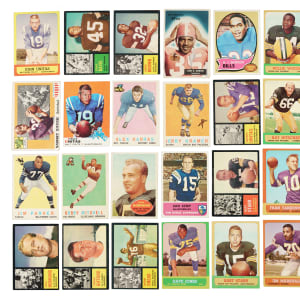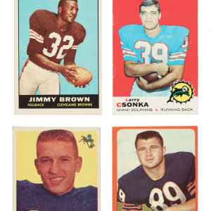 Collection of 156 assorted Bowman, Fleer, and Topps football cards spanning the years 1948 to 1970, including eighty-five Hall of Famers. This collection is highlighted by multiples examples each of Jim Brown, Johnny Unitas, and Bart Starr, plus rookie cards of Ernie Davis, Larry Csonka, Bobby Mitchell, and Ray Nitschke. This collection consists of the following: 1) 1948 Bowman (1 card): #10 (Pr). 2) 1950 Bowman (1 card): #3 (Pr). 3) 1954 Bowman (1 card): #128 Lattner (Fr). 4) 1955 Topps All-American (2 cards): #20 Baugh (Fr) and 46 (Gd). 5) 1955 Bowman (3 cards): #24 (Gd+), 42 Johnson RC (Fr), and 65 (Fr). 6) 1956 Topps (4 cards): #11 Blanda (0/100 L/R, otherwise Gd), 18 (Gd+), 50 McElhenny (Fr), and 108 (Pr-Fr). 7) 1957 Topps (6 cards): #6 Nomellini (Vg+), 11 R. Brown (Gd), 32 Layne (Pr-Fr), 49 Bednarik (Vg), 116 (Pr), and 126 (Vg). 8) 1958 Topps (6 cards): #5 (Gd+), 7 (Vg+), 15 Robustelli (Vg), 57 Morrall (Vg), 102 R. Brown (Gd+), and 127 Matson (Pr). 9) 1959 Topps (24 cards): Condition ranges from Pr to Vg-Ex, averaging Gd. Includes: #1 Unitas (Gd), 7, 20 Gifford (Pr), 40 Layne (Gd), 41 Summerall, 50 Matson (Pr), 51 Huff RC (Pr), 60 Groza, 65 Conerly, 82 Hornung (Pr due to pinholes), 88, 91, 96 Jones, 99, 100 Moore (Vg-Ex), 103 Karras RC (Vg-Ex+), 114 R. Brown, 116 Kramer RC (Pr), 130 Tittle (Vg+), 132 Parker RC (Vg+), 140 Mitchell RC (Vg), 147 Robustelli, 168, and 176 Tracy RC (Pr-Fr). 10) 1960 Topps (10 cards): Condition is Ex, three Vg-Ex, two Vg, Gd, and three Pr. Includes: Two #10, 52 Taylor (Vg), 54 Hornung (Vg-Ex+), 65, 74 Gifford (Pr due to pinholes), 75, 77, 113 Tittle (Vg-Ex), and 121 Nomellini (Vg-Ex+). 11) 1960 Fleer (3 cards): #7 Gillman (Gd+), 55 Saban (Fr), and 66 (Fr). 12) 1961 Topps (21 cards): Condition ranges from Pr to Vg-Ex (averaging Gd/Vg), with one Ex. Includes: #38 Hornung HL (1/99 L/R, otherwise Vg), 43, 58 Tittle (100/0 T/B, otherwise Vg+), 70 Mitchell (Vg+), 71 Jim Brown (Vg, with coin-rubbed reverse), 85 Conerly, 88 R. Brown, 91 Huff (5/95 L/R, otherwise Vg-Ex), 106, 140, 142, 145 Blanda (Vg), two 146, 149, 159, two 172, 190 L. Taylor RC (Pr-Fr), 193, and 194. 13) 1961 Fleer (4 cards): #108 (Vg-Ex), 160 (measures small, otherwise Ex), 162 Mix (Vg), and 203 (Vg+). 14) 1962 Topps (23 cards): Condition ranges from Vg to Ex (averaging Vg/Vg-Ex), with a couple lesser. Includes: #1 Unitas (Vg-Ex), 2 Moore (Ex), 18 S. Jones (Ex), 23, 28 Jim Brown (2/98 L/R, otherwise Vg-Ex), 32 Groza, 36 Davis RC (Vg-Ex), 38, 39 Meredith (Vg-Ex), 58 Karras, 63 Starr (Vg-Ex+), 64 Hornung (Vg-Ex), 88 Gabriel RC (Vg-Ex+), 103, 104 Gifford (Gd), 116 McDonald, 127 Layne (Ex), 133, 151 Kilmer RC (Vg-Ex+), 164 Snead RC (Ex), 165, 166 Mitchell (Pr), and 175. 15) 1962 Fleer (10 cards): Condition ranges from Gd to Ex, averaging Vg-Ex. Includes: #3 Cappelletti RC (Ex), 25, 36 L. Taylor, 46 Blanda (100/0 L/R, otherwise Ex), 47, 48, 57, 59 Maynard (Vg-Ex), 68 Flores (Gd), and 79 Kemp (Ex). 16) 1963 Topps (29 cards): Condition ranges from Vg to Ex (averaging Vg-Ex), with a few lesser. Includes: #1 Unitas (Vg-Ex+), 2 Moore, 4 Berry, 8 Marchetti, 19 Groza (Pr-Fr), 32 Lane, 33 Lary, 35 Schmidt, 37 Gabriel, 44 D. Jones RC (Ex), 49 Tittle (next card showing, otherwise Ex), 51, 56, 59 Huff, 62 Ditka (Ex), 71, 74 Meredith (pencil mark on reverse, otherwise Ex), 86 Starr (Ex), 87 J. Taylor, 89 Gregg, 91 Ringo, 95 Wood RC (Vg-Ex+), 96 Nitschke RC (Ex), 98 Tarkenton (Vg-Ex), 107 Marshall RC (Vg+), 110 Jurgensen (Ex), 112 McDonald, 123 Johnson, and 136 Kilmer. 17) 1964 Philadelphia (1 card): #185 Huff (Ex due to centering). 18) 1967 Topps (1 card): #24 Kemp (Gd+). 19) 1969 Topps (5 cards): #25 Unitas (Ex+), 35 (Vg-Ex), 92 (Ex), 93 (Ex), and 120 Csonka RC (Vg-Ex). 20) 1970 Topps (1 card): #90 Simpson RC (Pr-Fr). This is truly a collection unto itself, with numerous highlights and key cards, and obviously with substantial break value. Total: 156 cards.