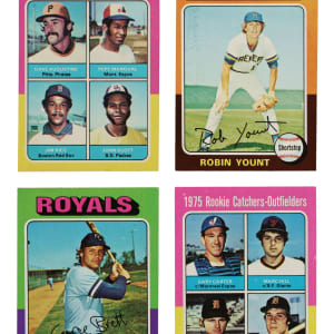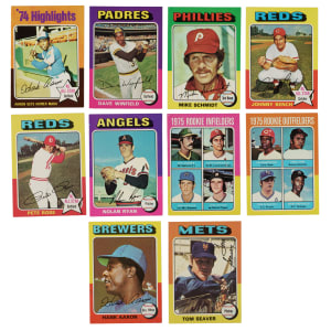 The rookie cards of Hall of Famers George Brett, Robin Yount, Gary Carter, and Jim Rice highlight the 1975 Topps issue, one of the most popular and unusual sets of the 1970s. The colored flush-to-the-border design of the 1975 Topps set makes this issue particularly challenging to collect in extremely high grade. Condition is 70% Nr/Mt to Nr/Mt-Mt and 30% Ex to Ex-Mt (including 3% slightly lesser). Keys: #1 Aaron HL (Ex), 61 Winfield (Nr/Mt-Mt), 70 Schmidt (Nr/Mt+), 223 Yount RC (30/70 L/R, otherwise Nr/Mt+), 228 Brett RC (Nr/Mt+), 260 Bench (Nr/Mt), 320 Rose (Ex-Mt), 370 Seaver (Nr/Mt-Mt), 500 Ryan (Ex), 616 Rice RC (Nr/Mt), 620 Carter RC (Nr/Mt), 622 Lynn RC (Nr/Mt-Mt), 623 Hernandez RC (Ex-Mt), and 660 Aaron (measures a bit narrow, otherwise Vg-Ex+). This is a very attractive high-grade set loaded with Hall of Famers and stars from the 1970s. Total: 660 cards.