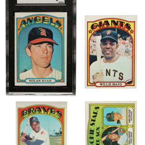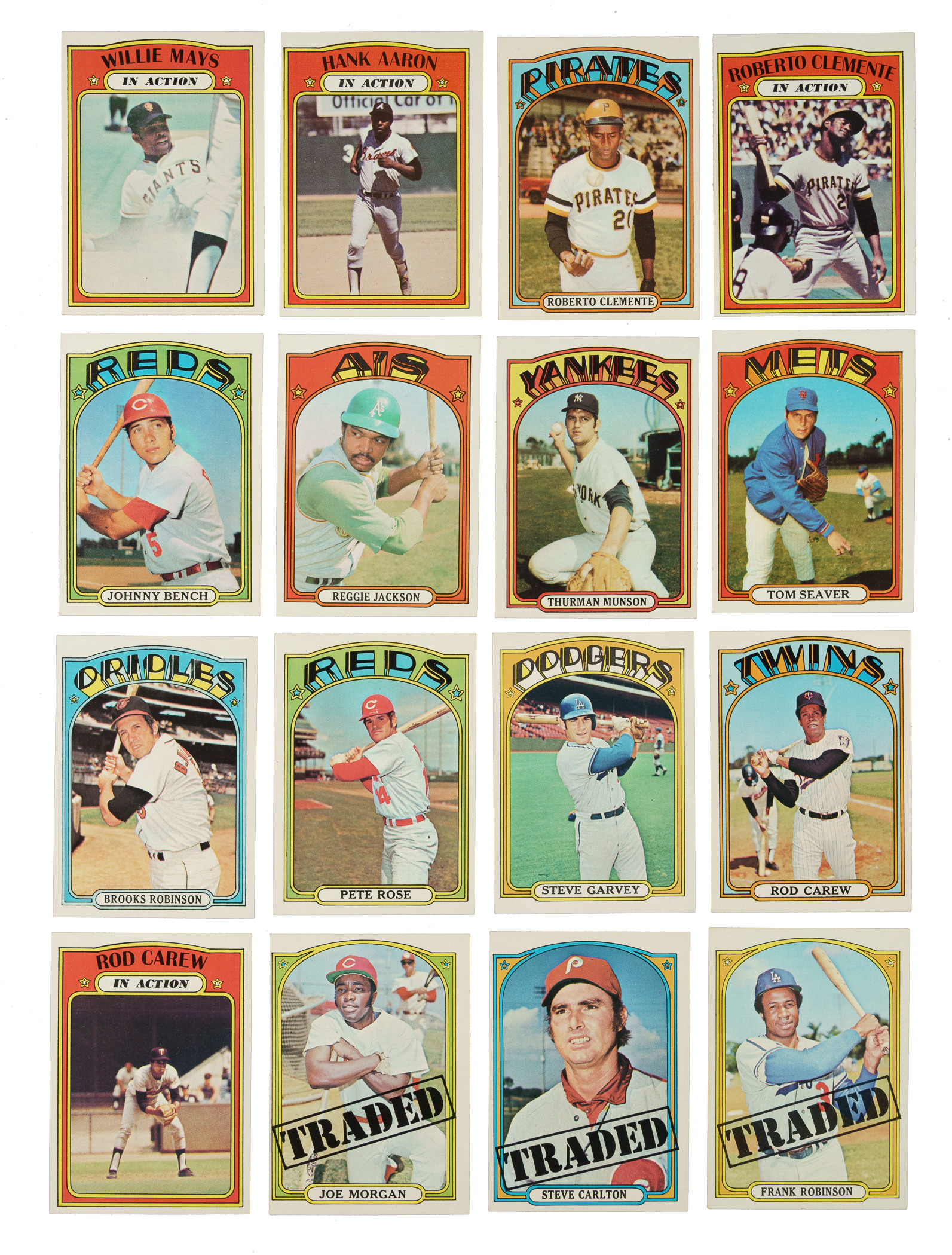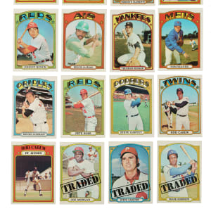 Presented is a complete set consisting of 787 cards from the 1972 Topps series, one of the most popular Topps sets of the decade. Condition is 13% Ex-Mt to Nr/Mt (including a few better), 63% Vg-Ex to Ex, and 24% Gd to Vg (including a couple lesser). Keys: #49 Mays (Ex), 50 Mays IA (Vg-Ex+), 79 Fisk RC (Vg-Ex), 299 Aaron (Vg-Ex+), 300 Aaron IA (15/85 L/R, otherwise Ex), 309 Clemente (Vg), 310 Clemente IA (Ex due to centering), 433 Bench (Vg-Ex+), 435 Jackson (Ex), 441 Munson (Ex-Mt), 445 Seaver (Vg-Ex), 550 B. Robinson (Ex-Mt), 559 Rose (Ex), 595 Ryan (SGC NM 7, submitted by REA), 686 Garvey (Ex-Mt due to centering), 695 Carew (30/70 T/B, otherwise Ex-Mt), 696 Carew IA (Ex-Mt), 751 Carlton Traded (Ex due to centering), 752 Morgan Traded (10/90 L/R, otherwise Nr/Mt+), and 754 F. Robinson Traded (Vg+). This is a very attractive mid-grade complete set of one of the great Topps classics of the era! Total: 787 cards.