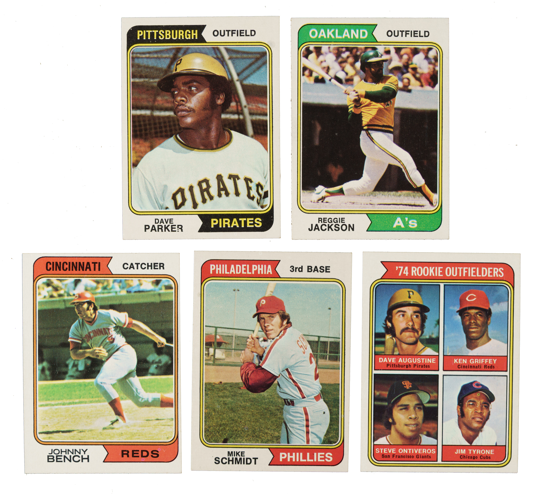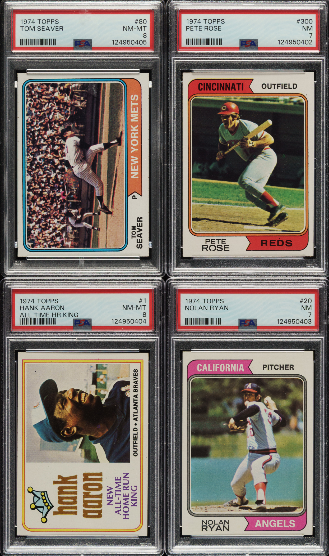Presented is a very attractive mid- to high-grade collection of 1974 Topps baseball cards consisting of a near-complete set of 649 different basic cards (out of 660), a complete Traded set of forty-four cards, and a complete Team Checklist set of twenty-four cards. Missing the following eleven cards for completion: #9, 52, 69, 131, 132, 189, 220 Sutton, 408, 456 Winfield, 530, and 571. Condition is 41% Nr/Mt to Nr/Mt-Mt, 50% Ex to Ex-Mt, and 9% Vg to Vg-Ex. We have selected four cards for grading and encapsulation by PSA. Keys: #1 Aaron (NM-MT 8), 10 Bench (Vg-Ex), 20 Ryan (NM 7), 80 Seaver (NM-MT 8), 130 Jackson (Ex+), 252 Parker RC (Ex-Mt+), 283 Schmidt (Ex-Mt), 300 Rose (NM 7), and 598 Griffey Sr. RC (Nr/Mt). Condition of the Traded set ranges from Ex to Nr/Mt-Mt (averaging Ex-Mt), with a couple slightly lesser. Condition of the team checklists ranges from Ex to Nr/Mt (averaging Ex/Ex-Mt), with a couple slightly lesser. This is a very impressive, mostly high-grade 1974 Topps collection with several notable highlights. Total: 717 cards (near set of 649 plus traded series of 44 and 24 team checklists).