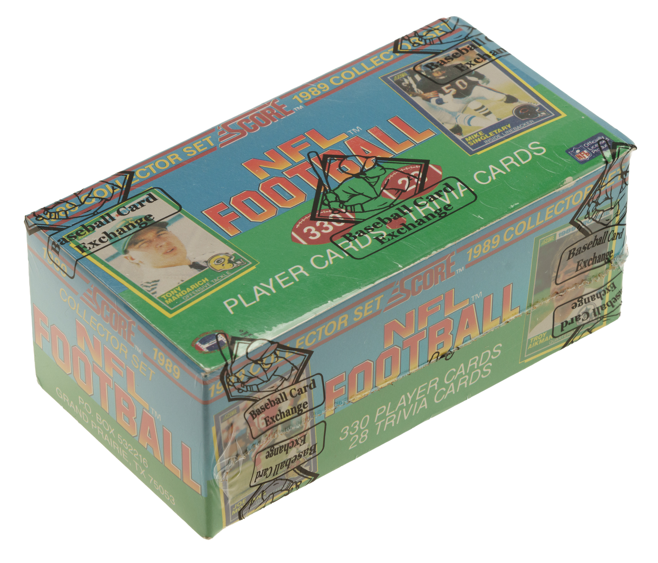 Unopened factory box set of the 1989 Score football series containing a complete 330-card set. The 1989 Score football set is highlighted by the rookie cards of Hall of Famers Barry Sanders, Troy Aikman, Derrick Thomas, Cris Carter, Tim Brown, Michael Irvin, Thurman Thomas, and Deion Sanders. The box comes shrink-wrapped by Baseball Card Exchange (owned by Steve Hart, the foremost expert on unopened material).