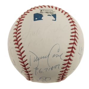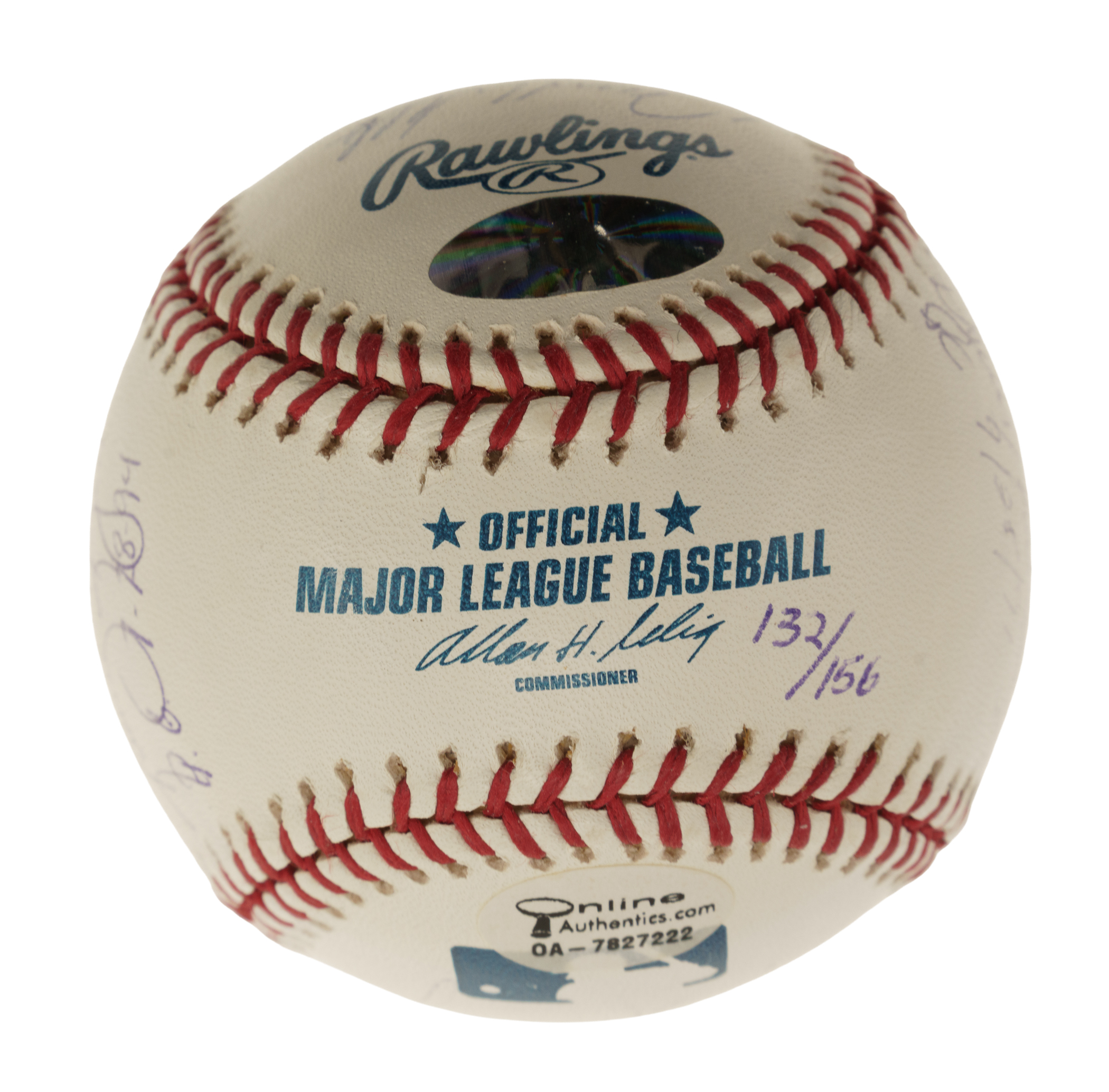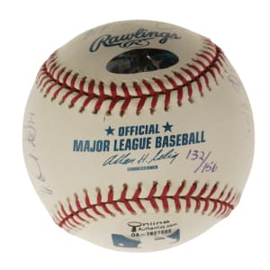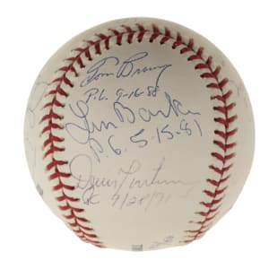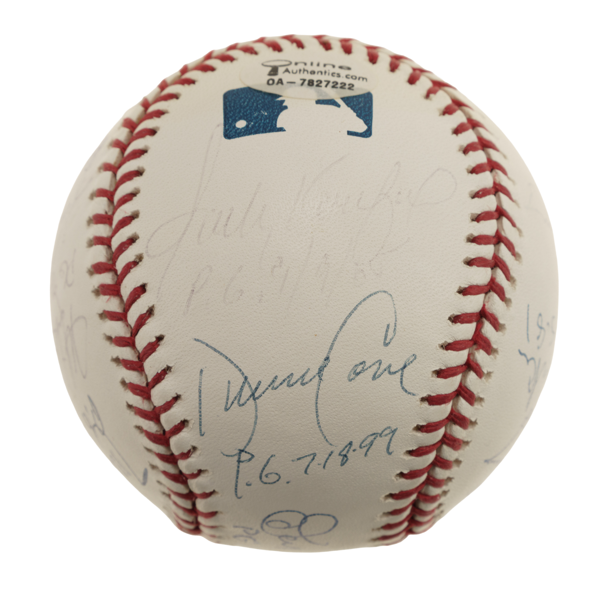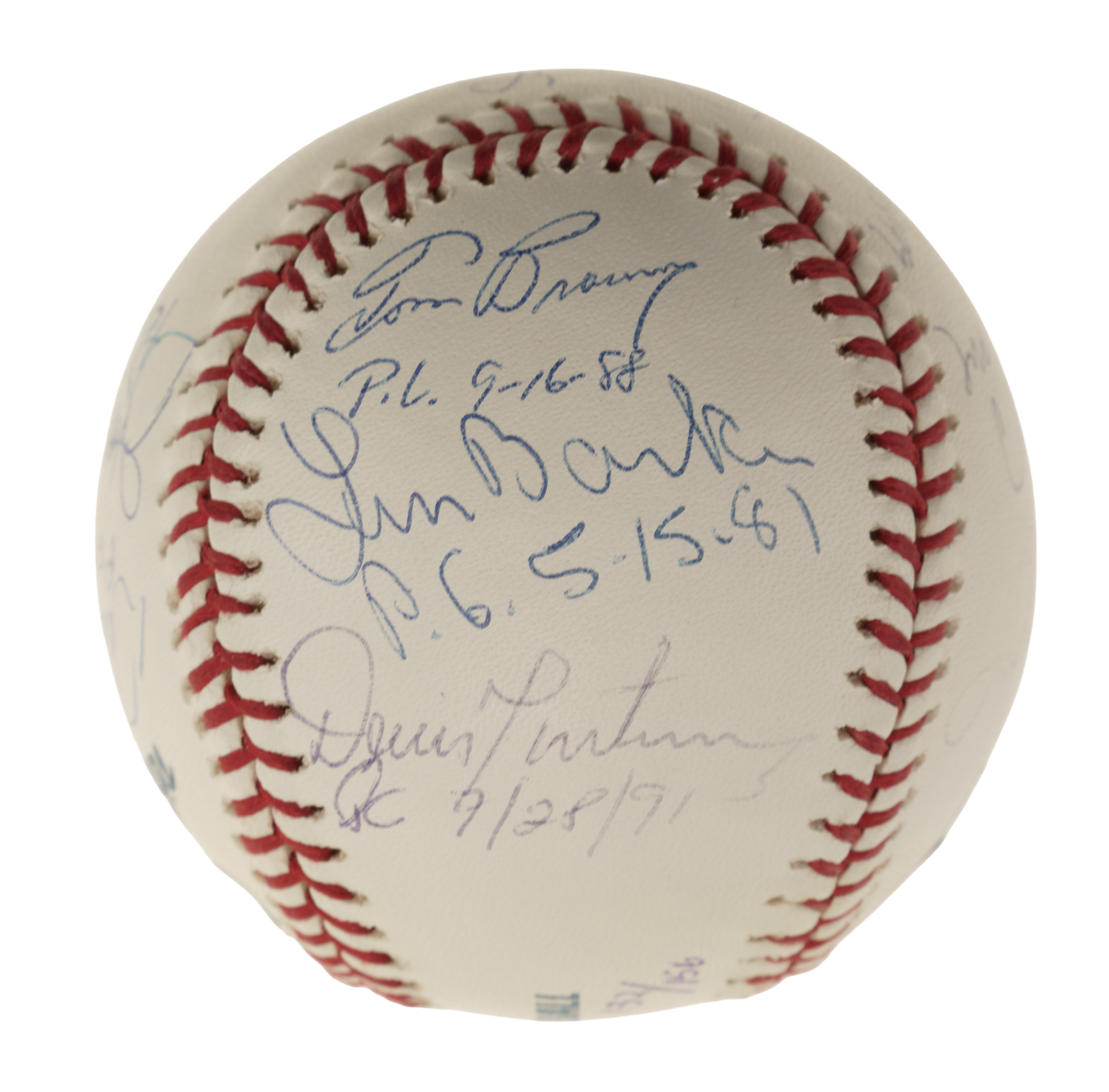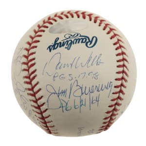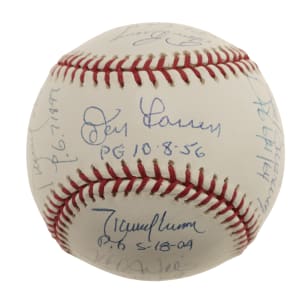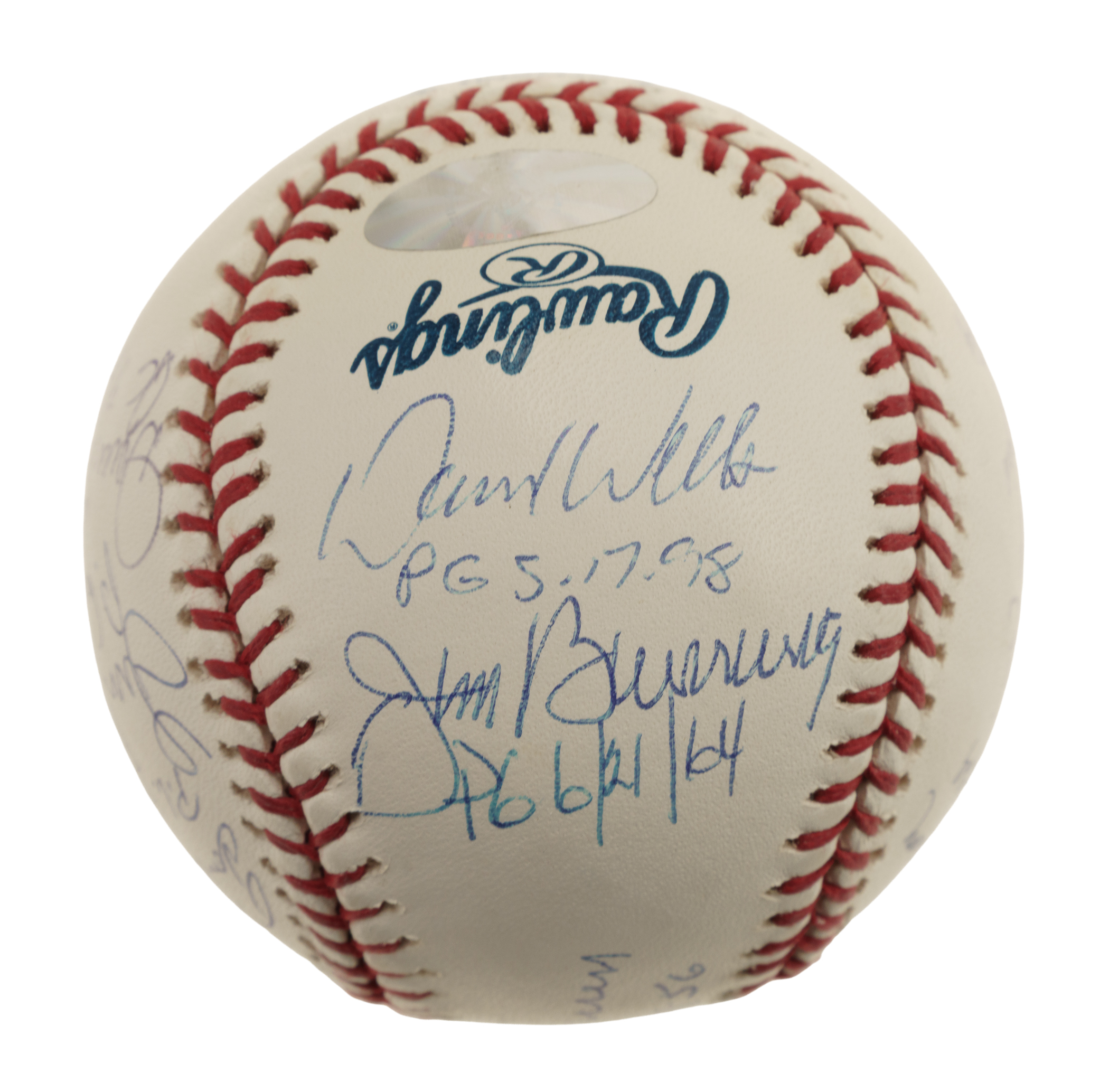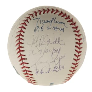 Official Major League baseball (Selig) signed in blue ink by eleven pitchers who have thrown a perfect game. A perfect game is perhaps the most difficult feat in all of baseball. To put the accomplishment in proper perspective, in the history of the game only twenty-four pitchers have been officially credited with achieving perfection on the mound. This ball has the signatures of the following eleven members of that elite club: Don Larsen (sweet spot), Sandy Koufax (signature is faded), Jim Bunning, David Cone, Mike Witt, David Wells, Dennis Martinez, Len Barker, Kenny Rogers, Tom Browning, and Randy Johnson. Each player has included the date of his perfect game below his signature. The ball, which is hand numbered 132/156, remains in Near Mint condition. Auction LOA from James Spence/JSA.