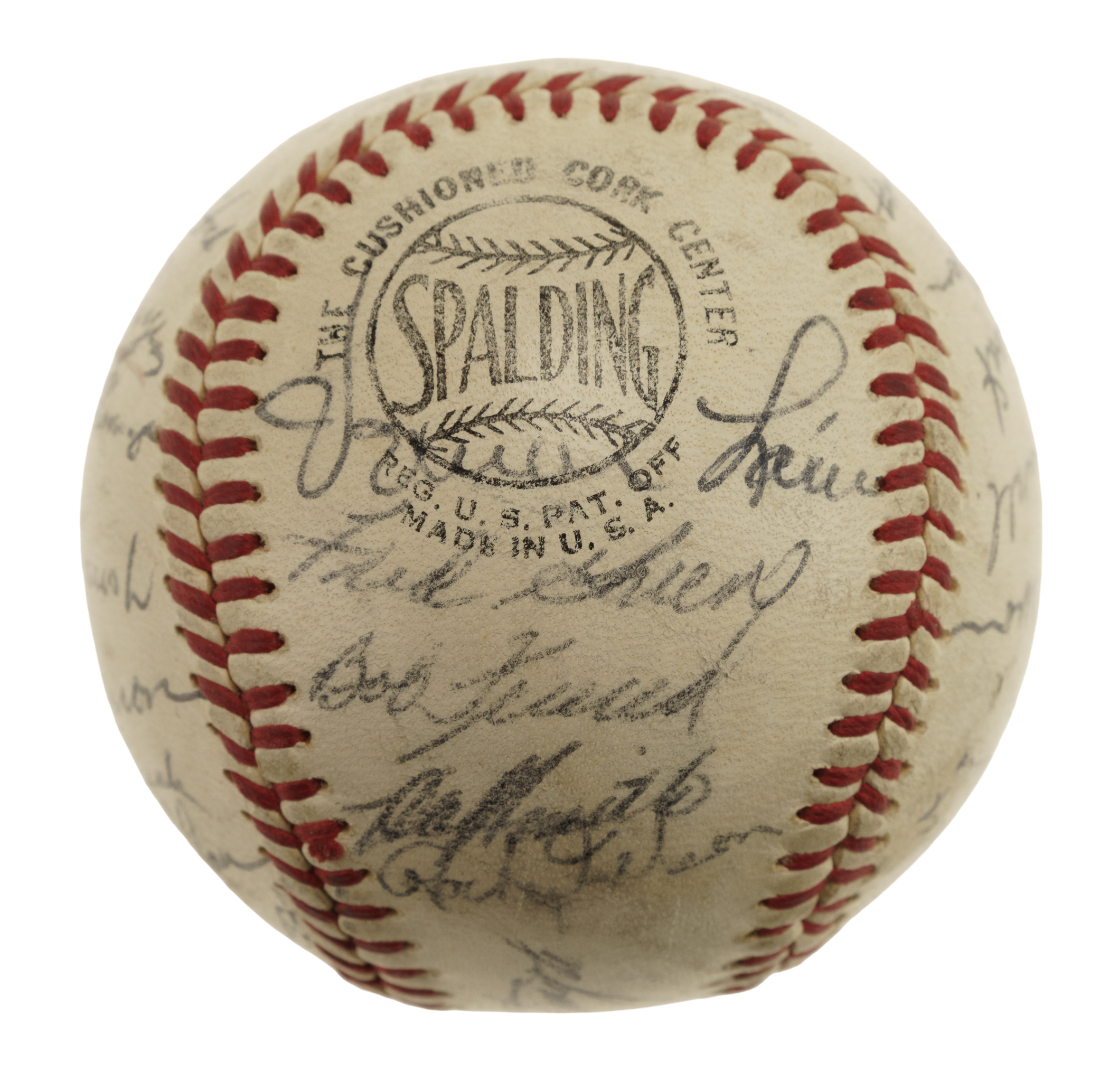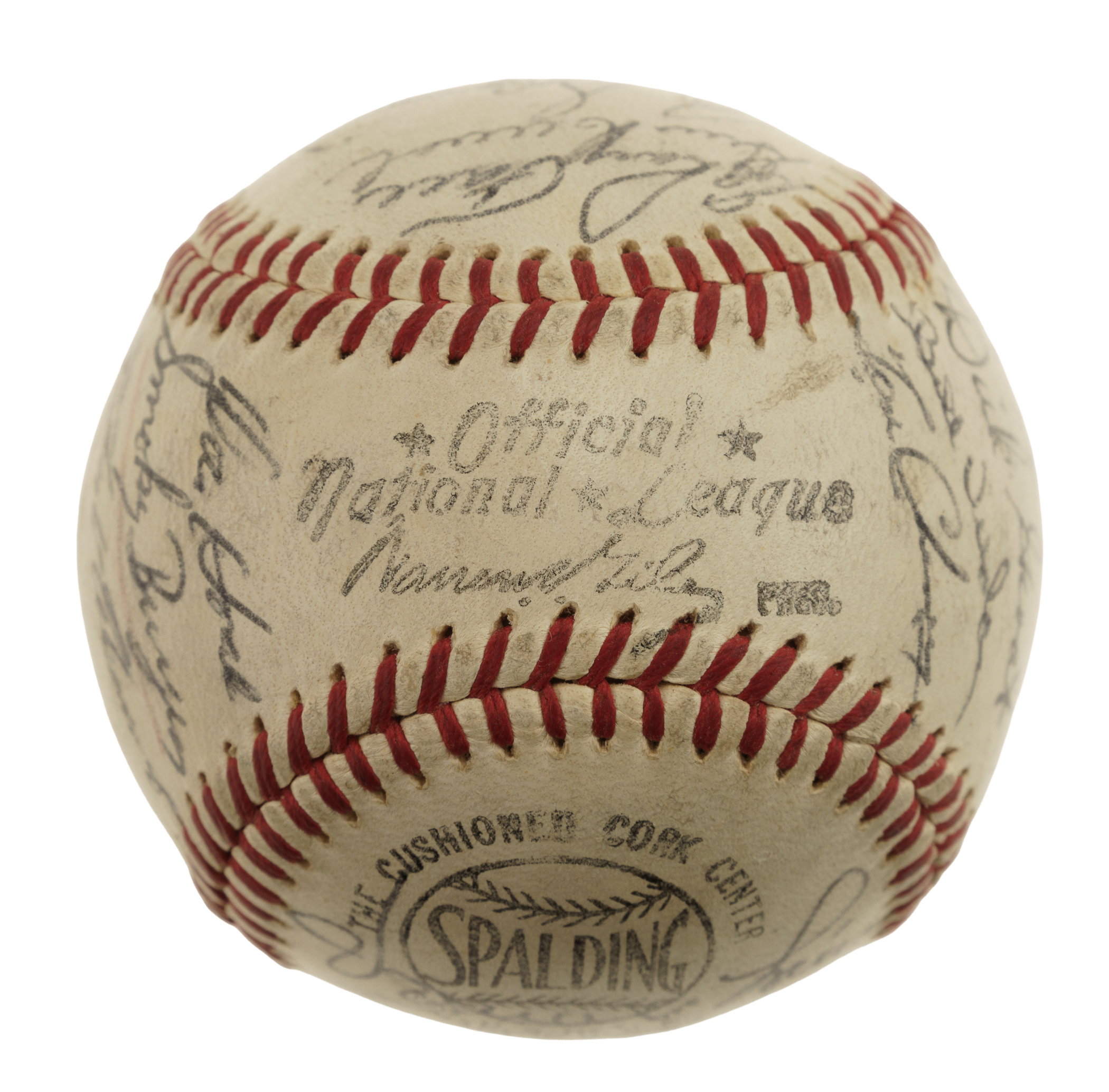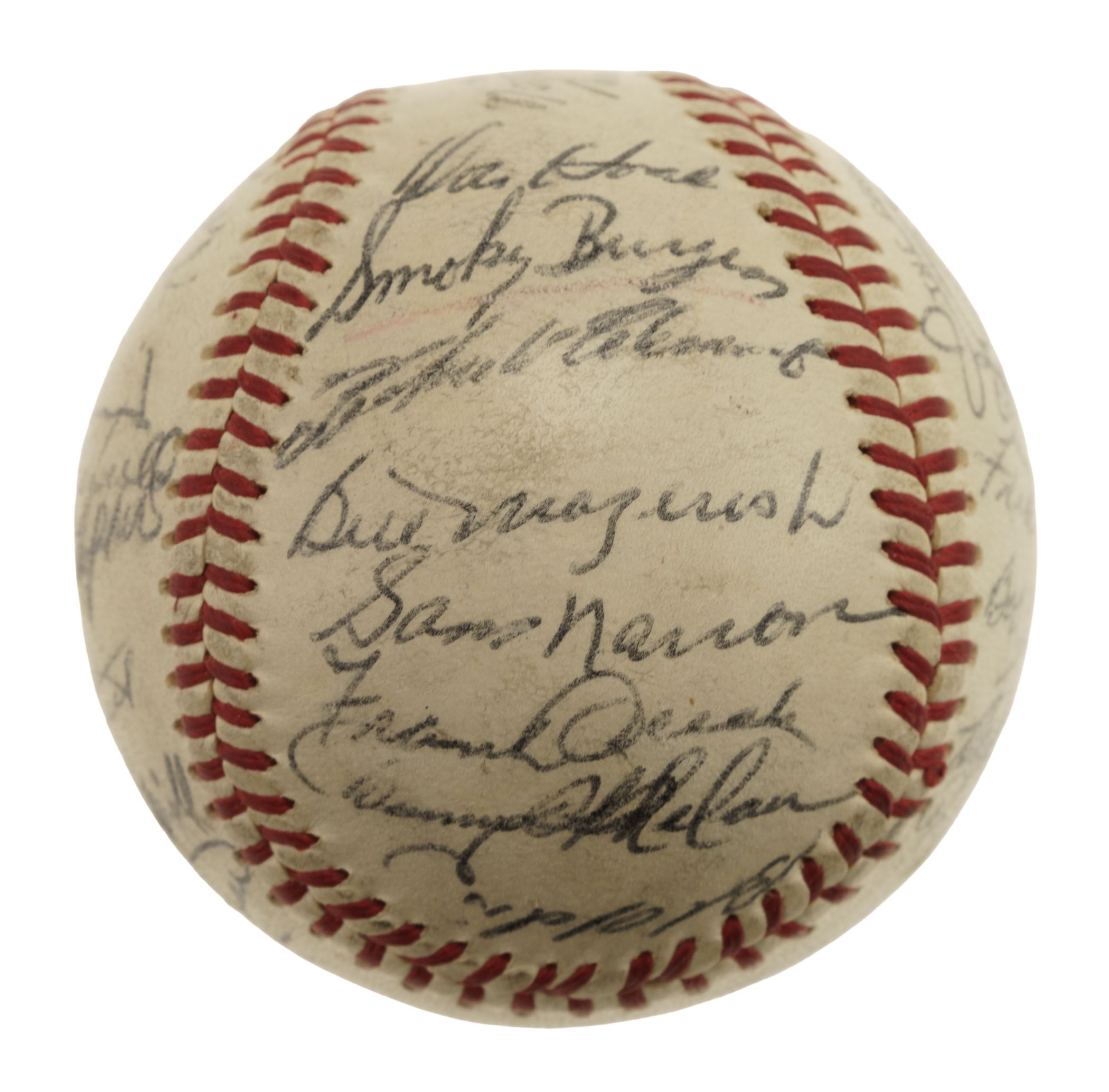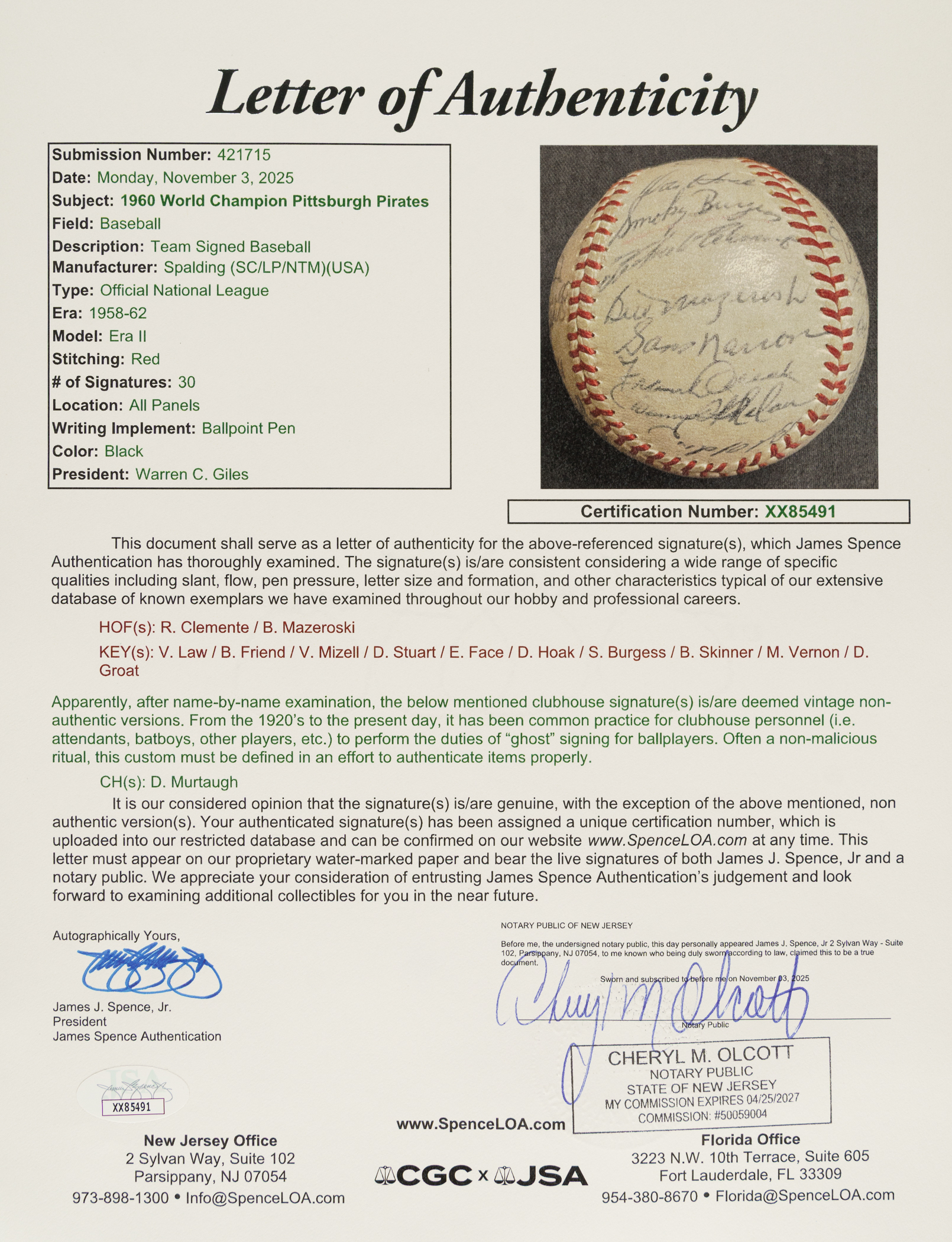 Official National League baseball (Giles) signed in blue ink by 30 members of the 1960 World Champion Pittsburgh Pirates, including Clemente, Hoak, Burgess, Mazeroski, Narron (coach), Oceak (coach), Oldis, Baker, Francis, Gibbon, Vernon, Burwell (coach), Groat, Virdon, Cheney, Law, Green, Friend, Nelson, Face, Cimoli, Skinner, Schofield, Christopher, Haddix, Mizell, and Witt. (Please note the signature of Murtaugh has been deemed a clubhouse example by JSA.) The ball remains in Excellent condition overall. Full LOA from James Spence/JSA.