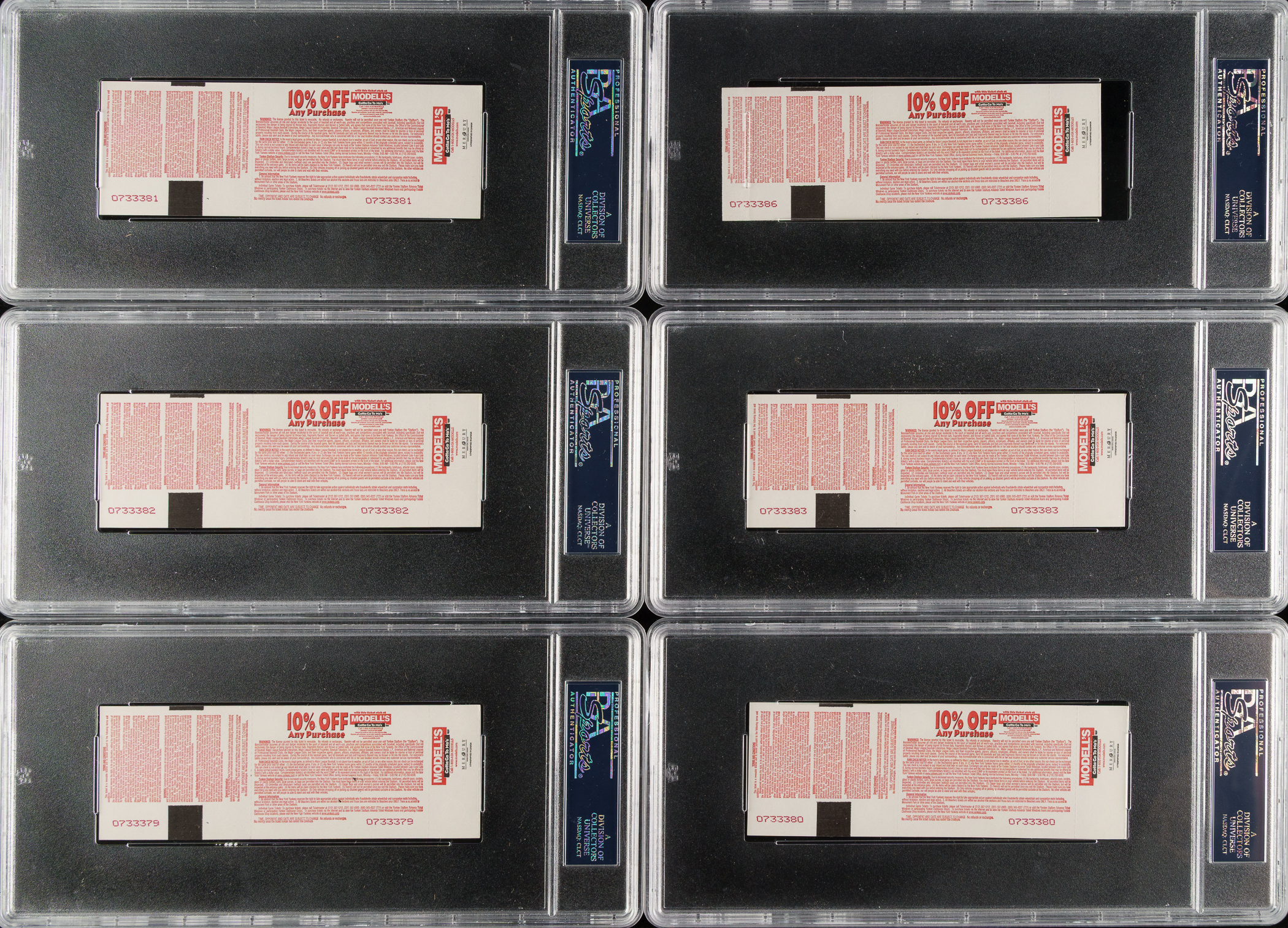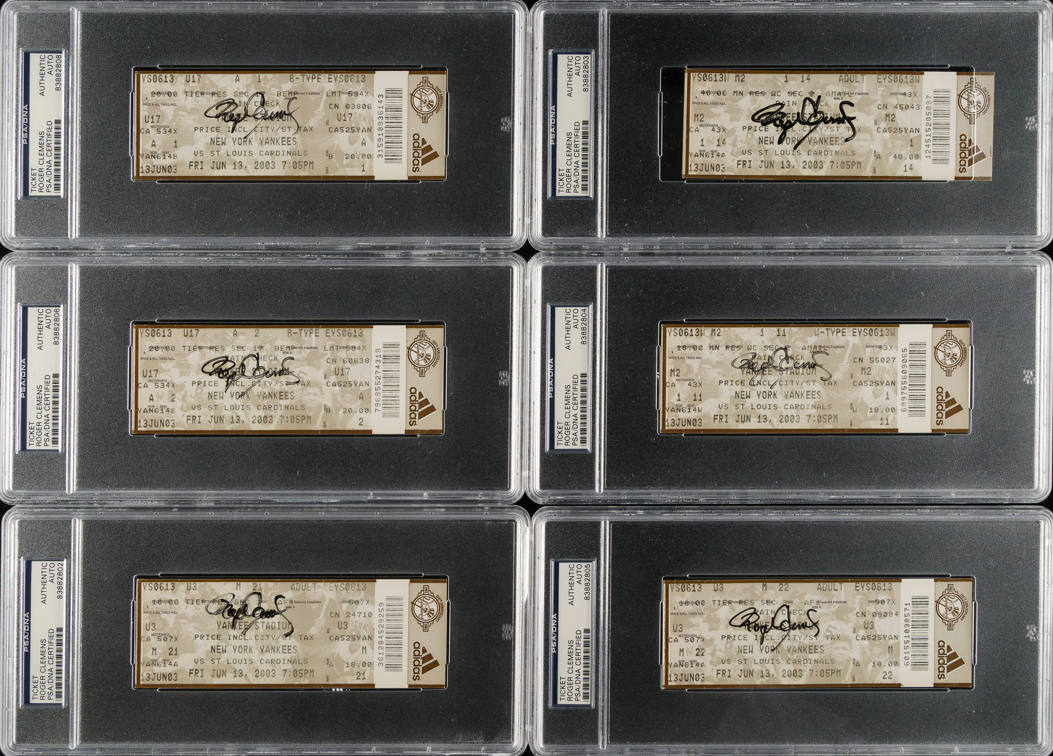 Collection of six full tickets to the game Roger Clemens reached 300 wins and 4,000 strikeouts, each signed by Clemens in black marker on the front. PSA/DNA has encapsulated the tickets, certifying each ticket and signature as "Authentic." This historic game took place on June 13, 2003, in front of a sellout crowd of 55,214 fans at Yankee Stadium in a contest against the St. Louis Cardinals. Clemens became the 21st member of the famed 300-win club and just the third pitcher to reach 4,000 strikeouts. Total: 6 signed tickets.
