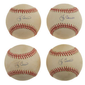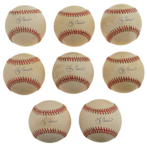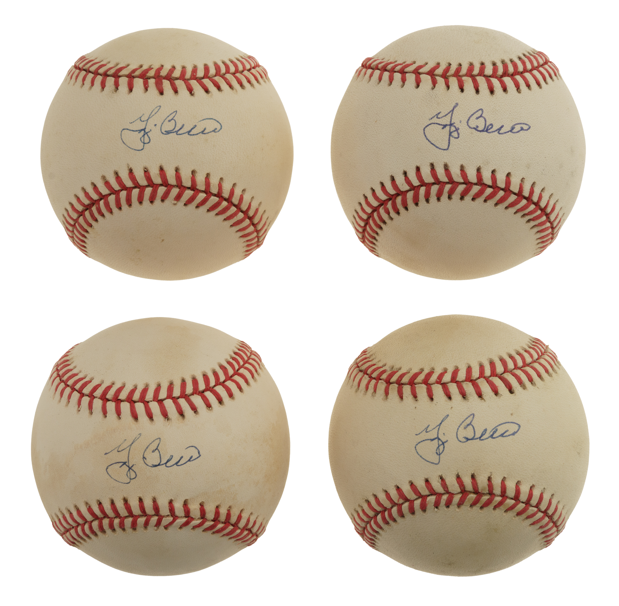 Collection of 12 Yogi Berra single-signed baseballs. Each Official American League baseball (Budig) is signed by Berra in blue ink along the sweet spot. Some of the balls have varying degrees of age toning. Otherwise, all are in Near Mint condition overall. Each ball is accompanied by a COA from PSA/DNA. Corresponding stickers from PSA/DNA are affixed to each ball. Total: 12 signed baseballs. The size/weight of this item requires that there will be an additional shipping charge for this lot.