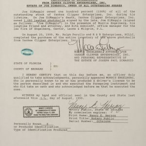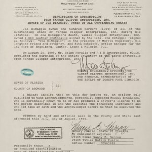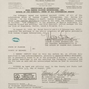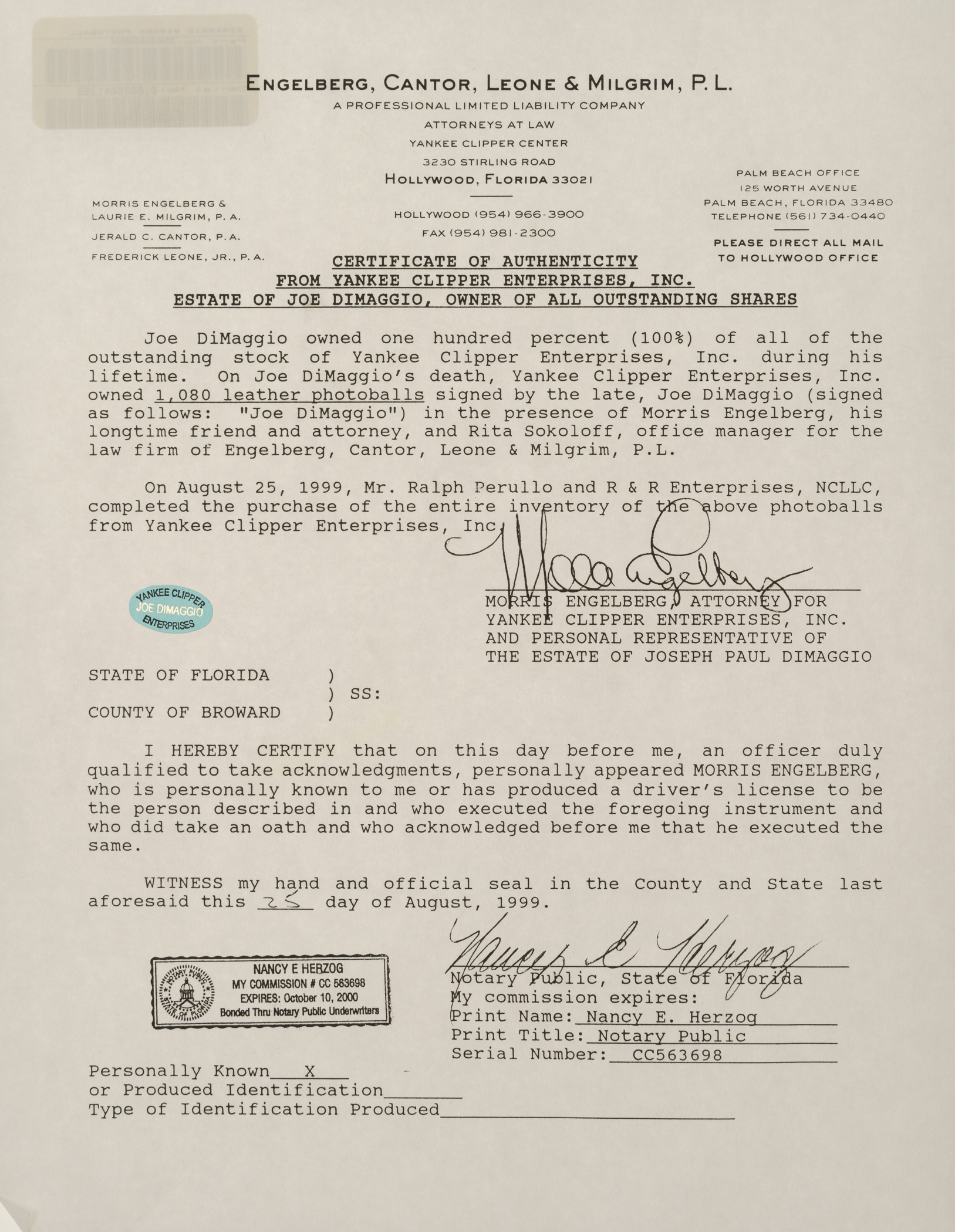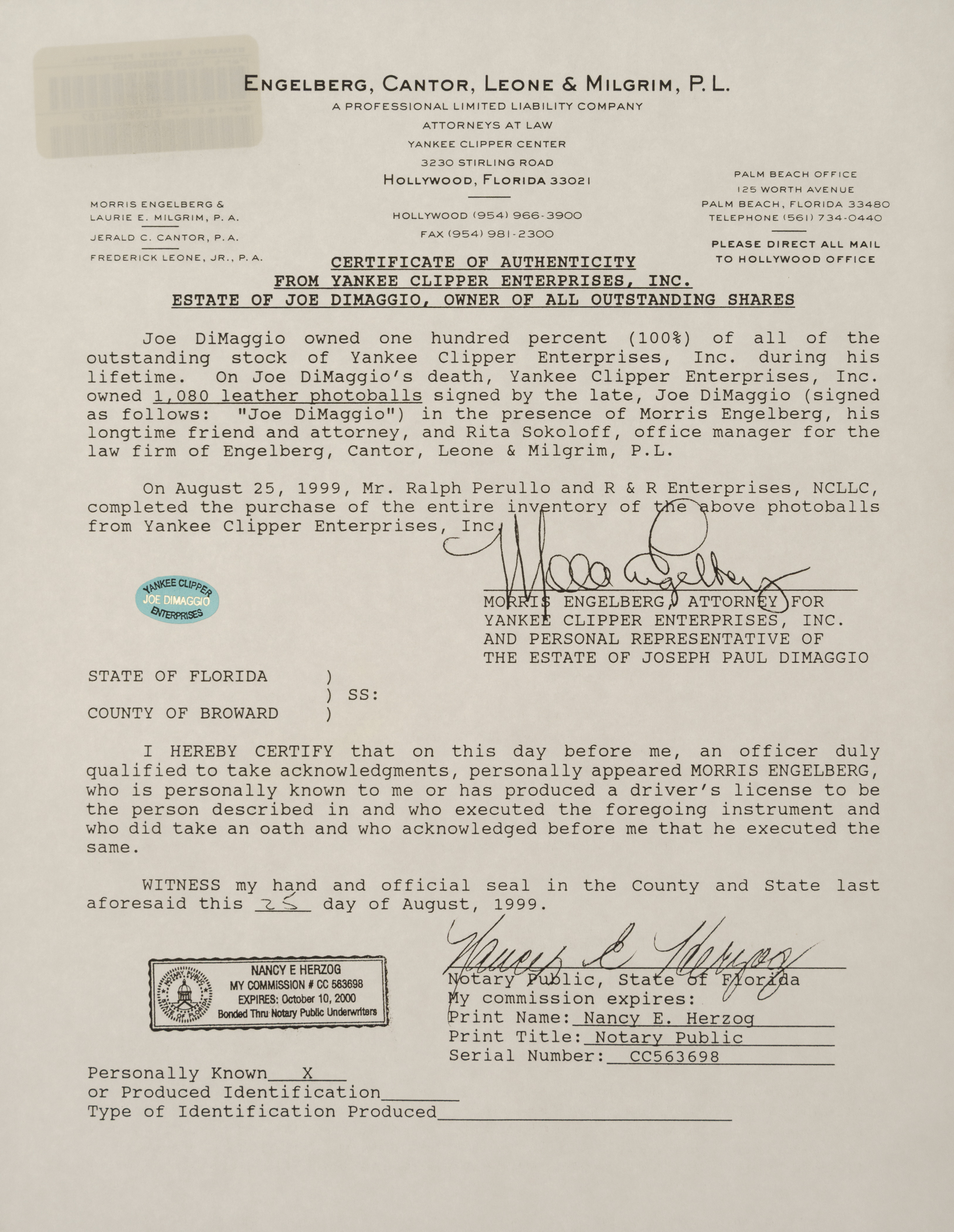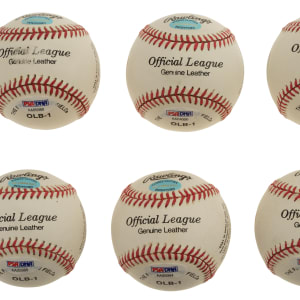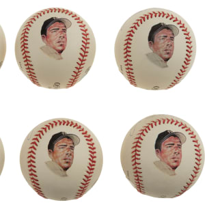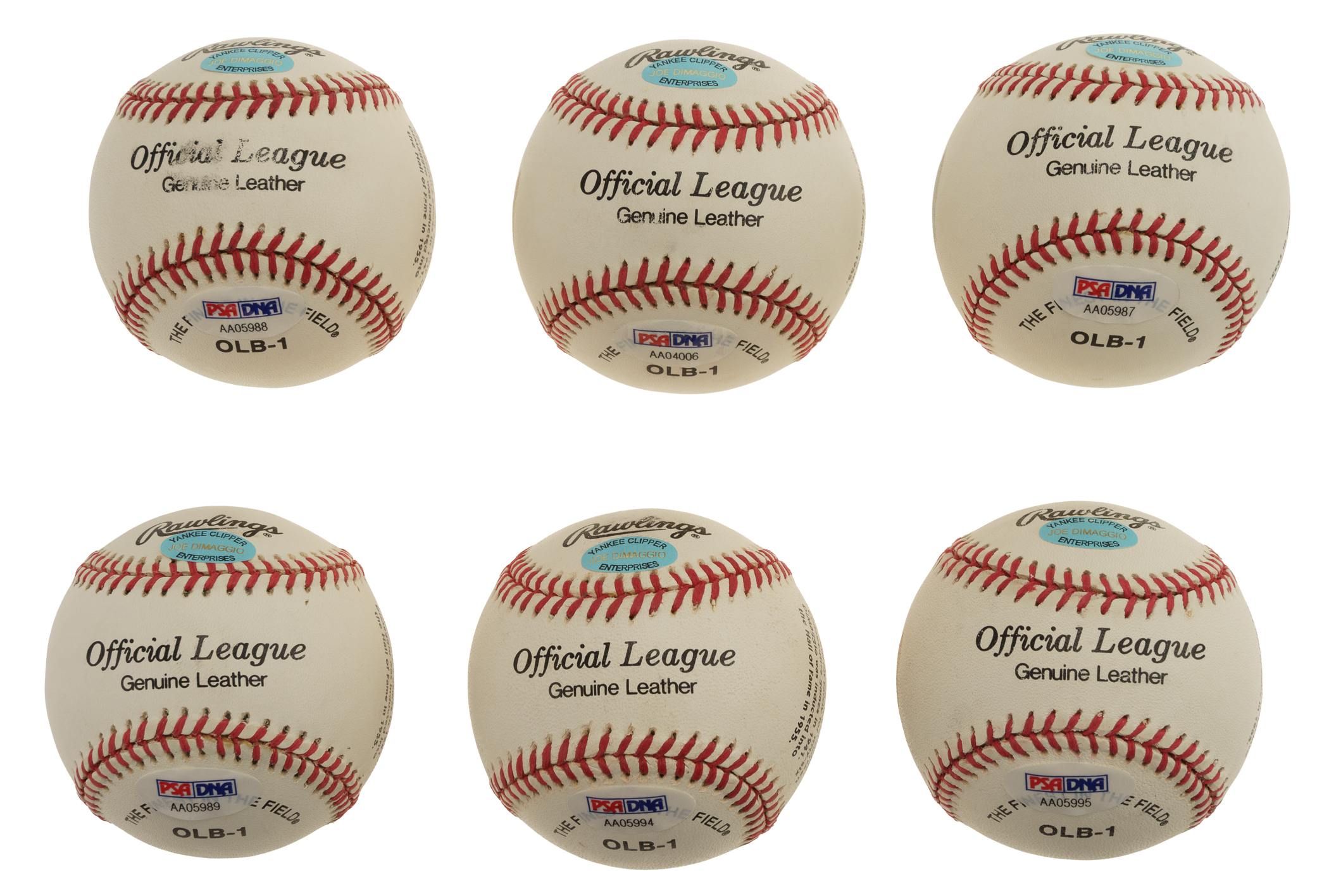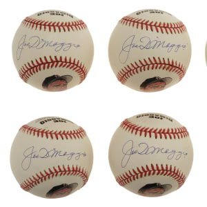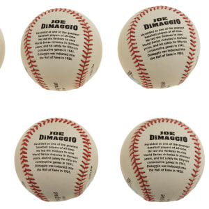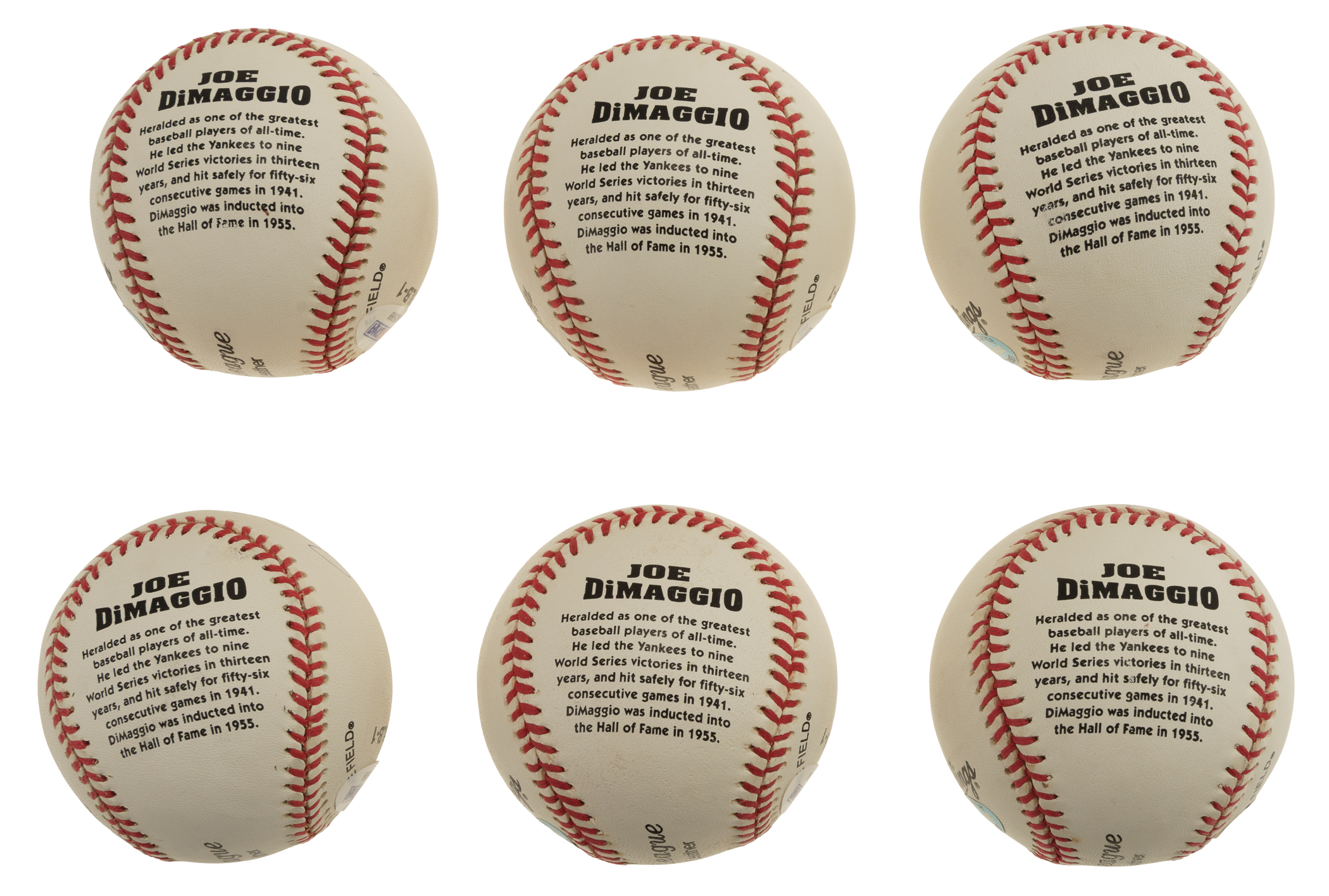 Collection of six Rawlings "Official League" baseballs, each signed in blue ink across the sweet spot by Joe DiMaggio. Each ball features a hand-painted portrait of DiMaggio on a side panel and printed text on another panel providing a brief overview of his career. This group has the ideal provenance of originating from the Joe DiMaggio estate. A "Yankee Clipper Enterprises" sticker is affixed to each ball. All six baseballs are in Near Mint condition and are authenticated by PSA/DNA (a corresponding sticker affixed to a side panel). Four balls are accompanied by a one-page document provided by DiMaggio's attorney, Morris Engleberg, who oversaw the liquidation of the estate. Total: 6 balls.