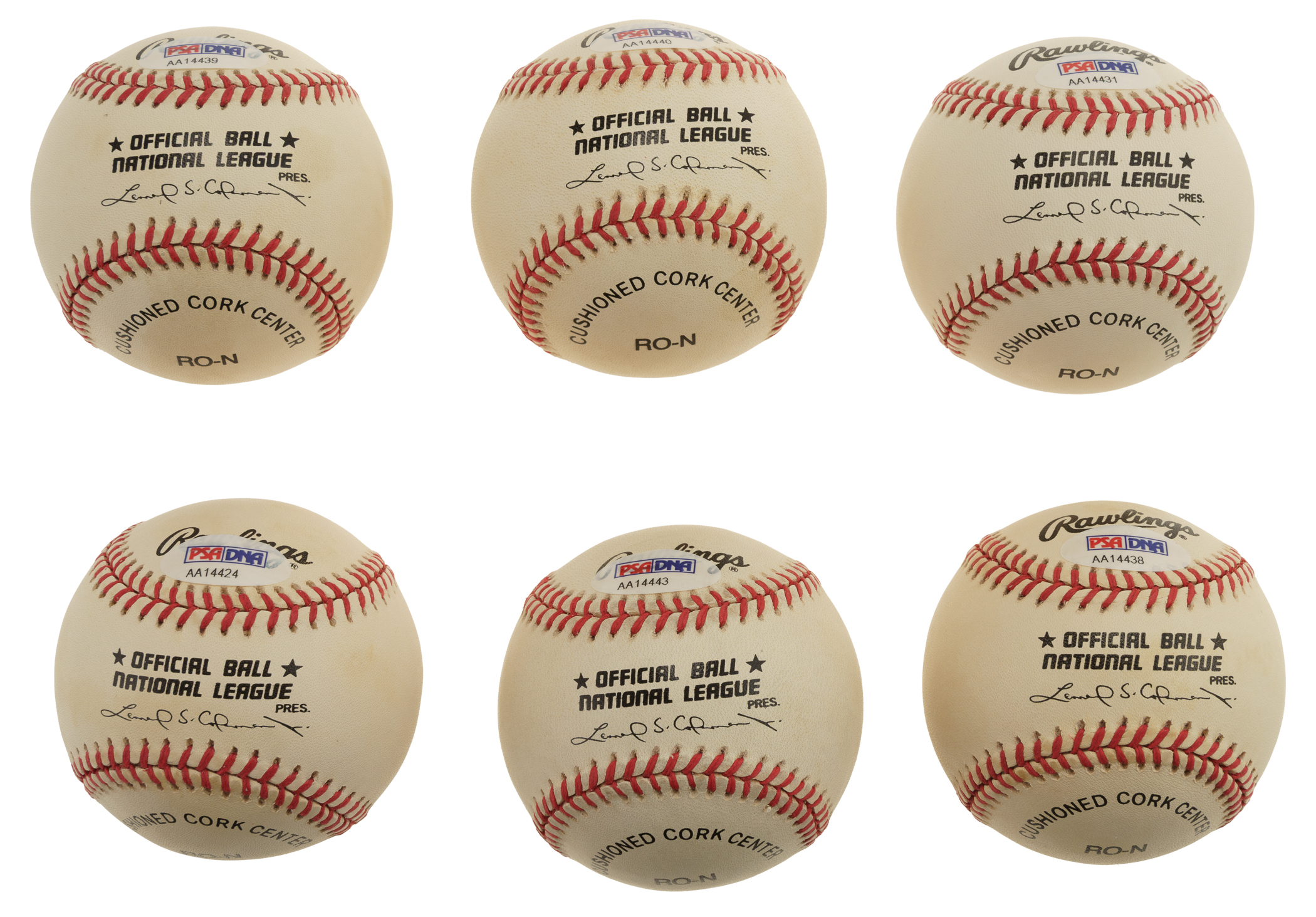 Collection of six Atlanta Braves Hall of Famer Greg Maddux single-signed baseballs. Basic certifications from PSA/DNA. The size/weight of this item requires that there will be an additional shipping charge for this lot.