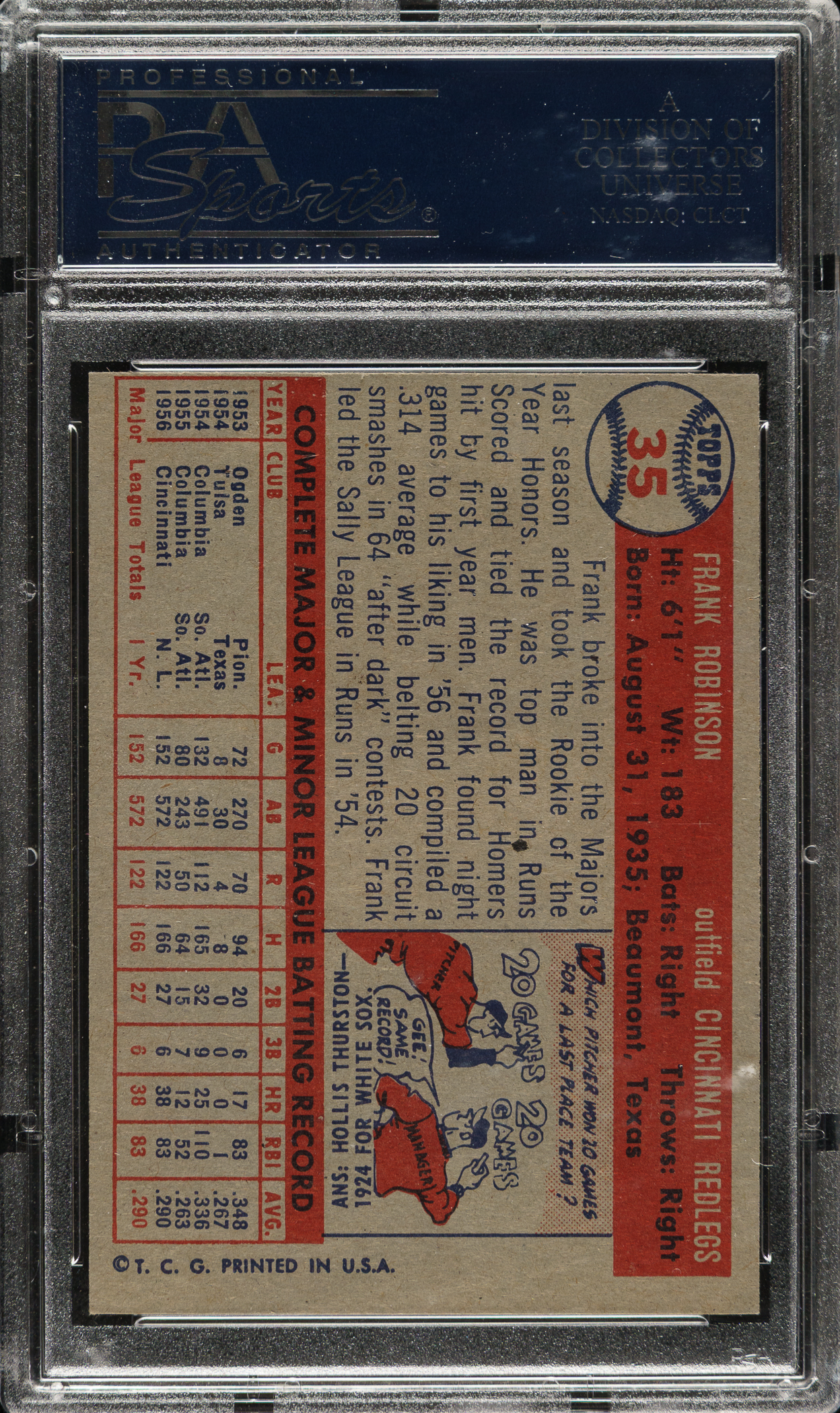Graded NM-MT 8 by PSA. Superb high-grade example of Cincinnati Reds Hall of Famer Frank Robinson's rookie card, one of the keys in the 1957 Topps set. This card has vibrant colors, outstanding registration, and strong corners. Clean reverse. This is a tremendous high-grade representation.