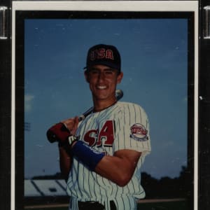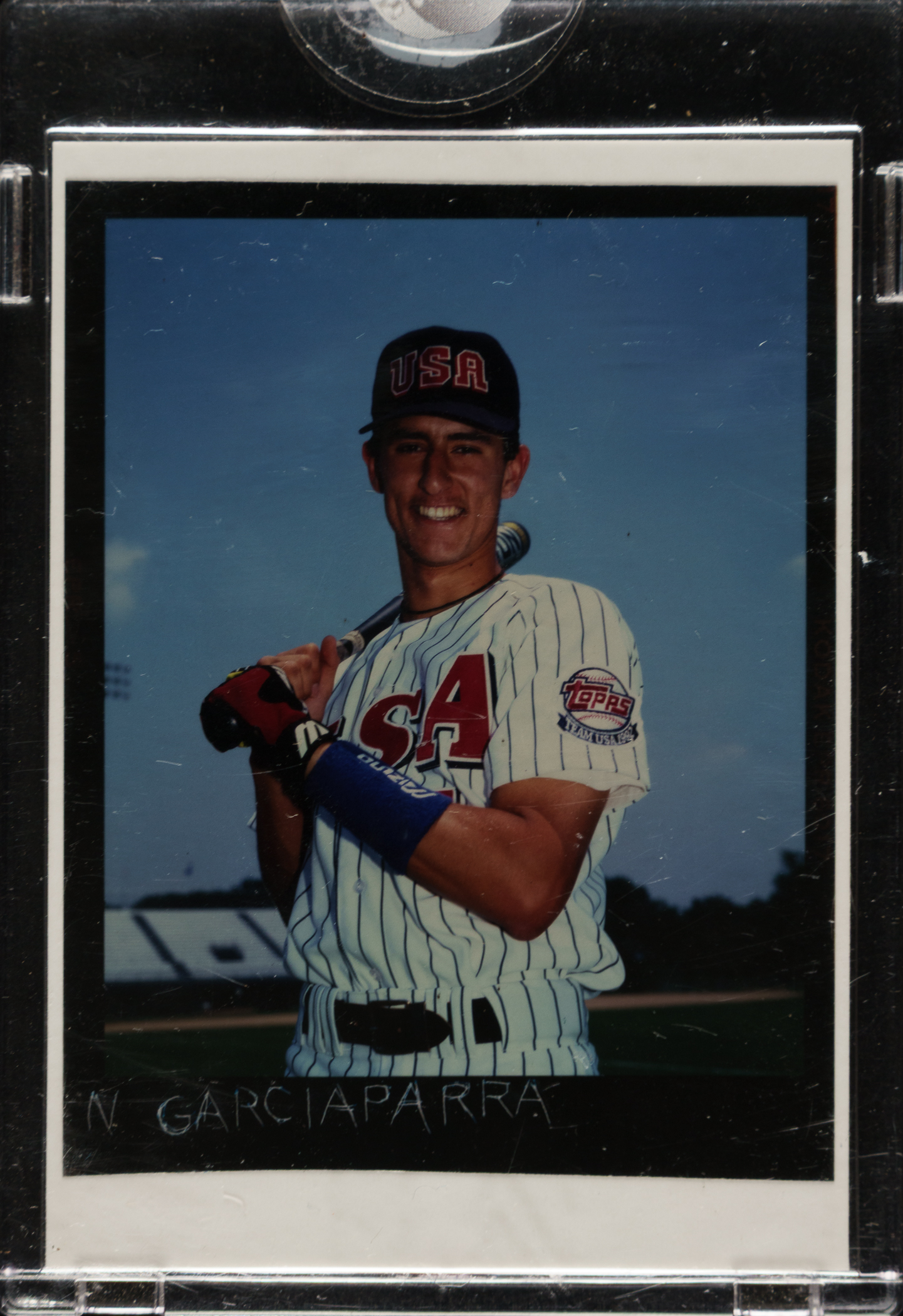 Proof example of Nomar Garciaparra's rookie card from the 1992 Topps Traded issue. The proof appears affixed to a white cardboard backing ("Topps Vault" sticker affixed to the back) and remains housed in a Topps Vault sealed plastic case. Accompanied by a Topps Vault Certificate of Authenticity.