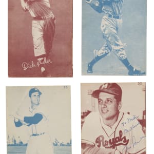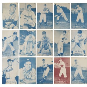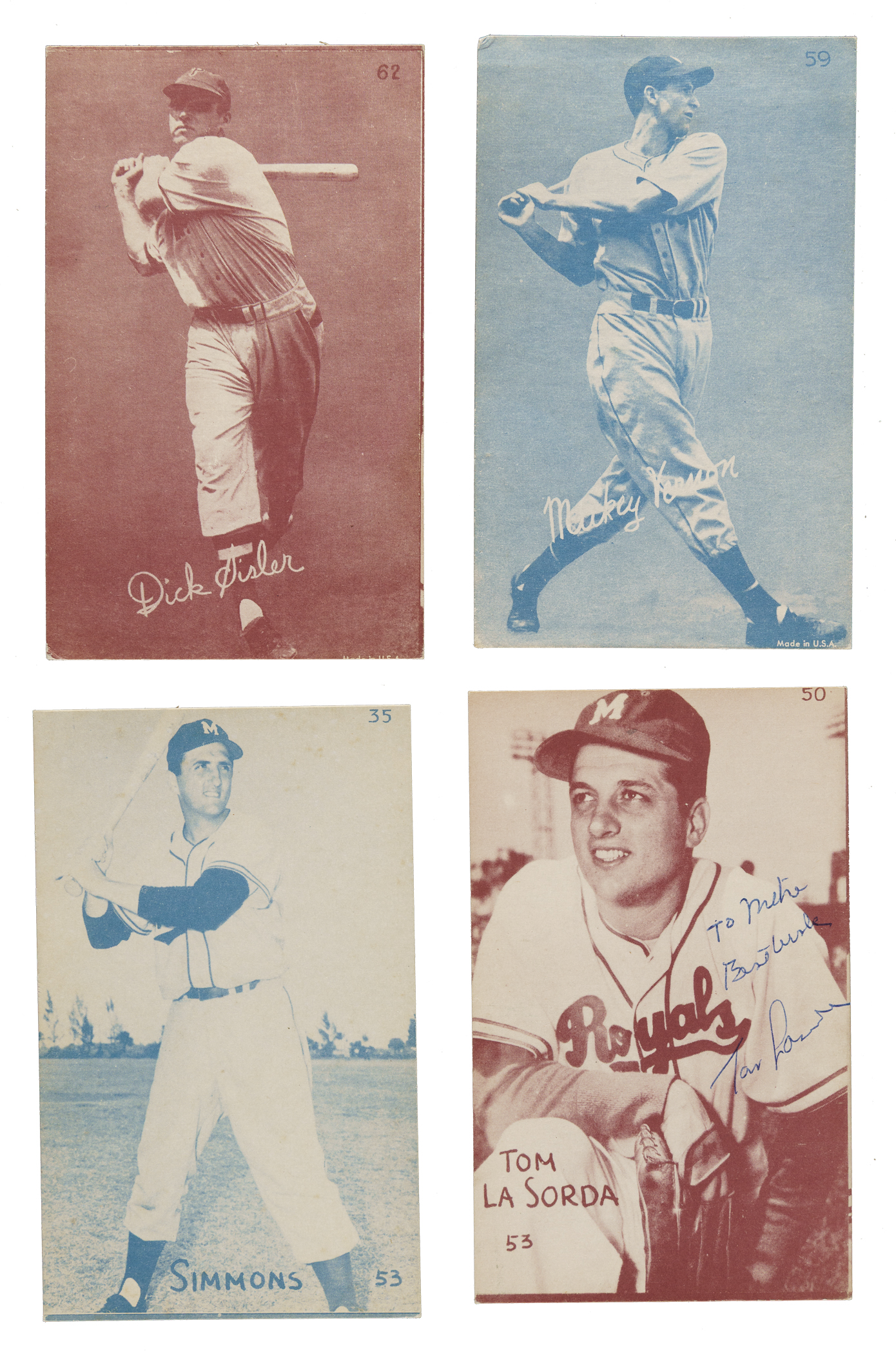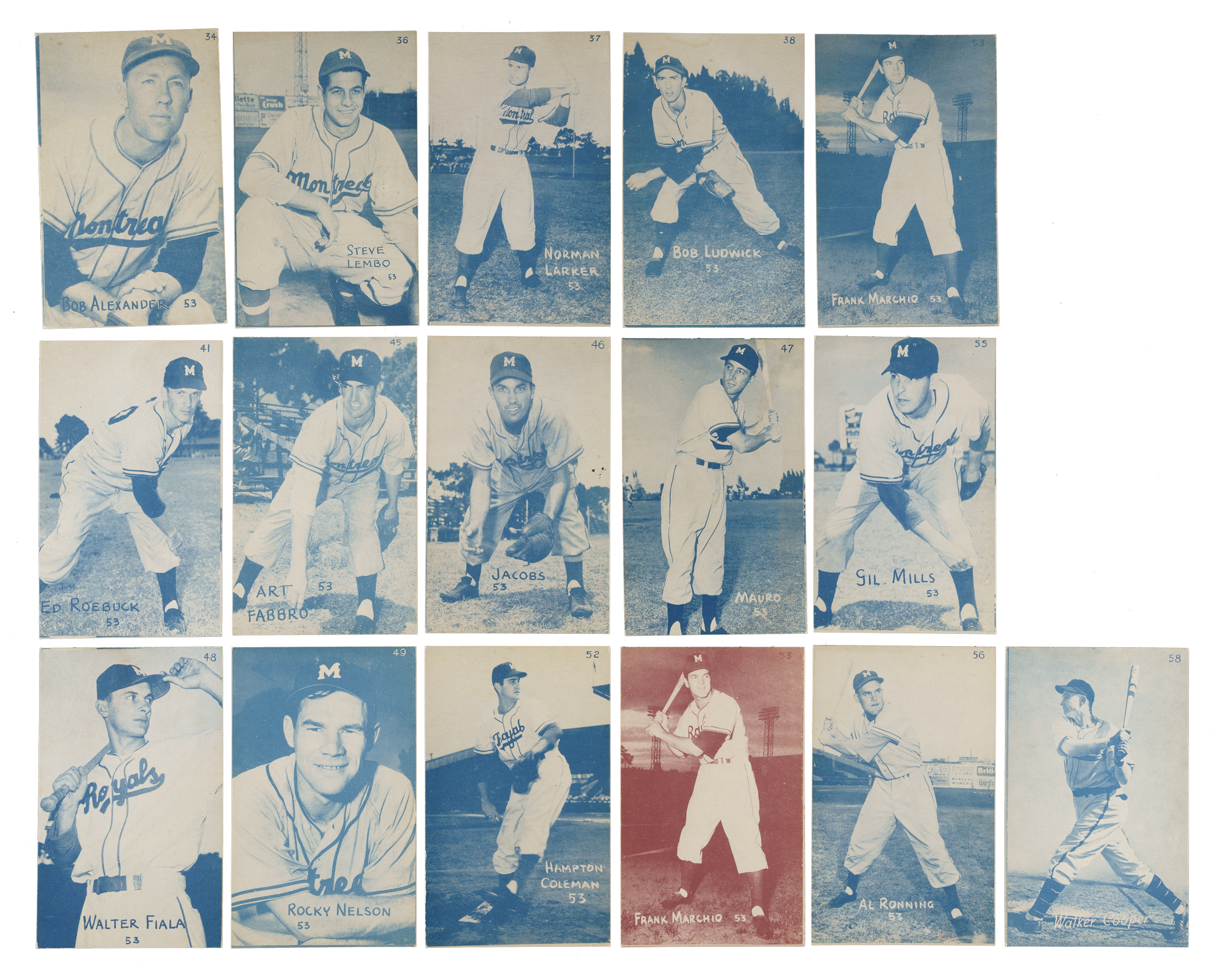 Collection of twenty 1953 Canadian Exhibits, featuring Montreal Royals Hall of Famer Tom La Sorda. Condition ranges from Pr to Vg-Ex (averaging Gd/Vg), including one higher. This collection consists of the following: #34, 35, 36, 37, 38, 41, 45, 46, 47, 48, 49, 50 La Sorda (signed, Vg-Ex), 52, two 53, 55, 56, 58, 59, and 62. Total: 20 cards. Auction LOA from James Spence/JSA. The size/weight of this item requires that there will be an additional shipping charge for this lot.