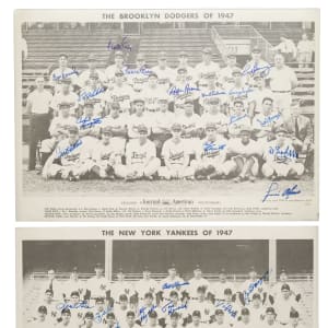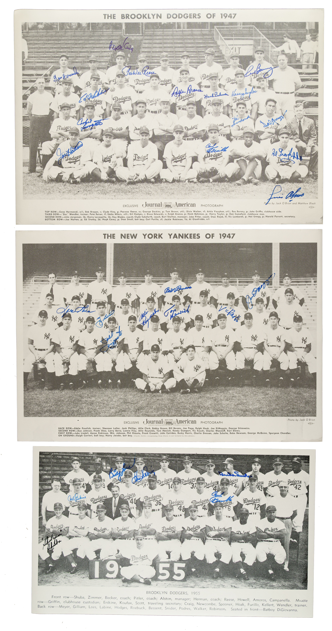 Trio of team photos featuring the Brooklyn Dodgers and the New York Yankees. Each photo has been signed by several players. This collection consists of the following: 1) 1947 New York Yankees team photo. Issued as a special premium by the New York Journal-American newspaper. Signed in blue marker by the following eight players: Bevens, DiMaggio, Shea, Berra, Reynolds, Henrich, Raschi, and Rizzuto. Measuring 17.5 x 12 inches and in Excellent condition overall. 2) 1947 Brooklyn Dodgers team photo. Issued as a special premium by the New York Journal-American newspaper. Signed in blue marker by the following 15 players: Hermanski, King, Reese, Barney, Miksis, Branca, Behrman, Taylor, Lavagetto, Lombardi, Gregg, Hatten, Furillo, Gionfriddo, and Olmo. Measuring 17.5 x 12 inches and in Excellent condition overall. 3) 1955 Brooklyn Dodgers team photo. Signed in blue and black marker by the following six players: Loes, Labine, Snider, Erskine, Furillo, and Shuba. Measuring 16 x 9.5 inches and in Excellent condition overall. Total: 3 photos. Auction LOA from James Spence/JSA. The size/weight of this item requires that there will be an additional shipping charge for this lot.