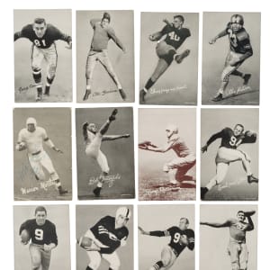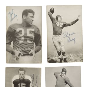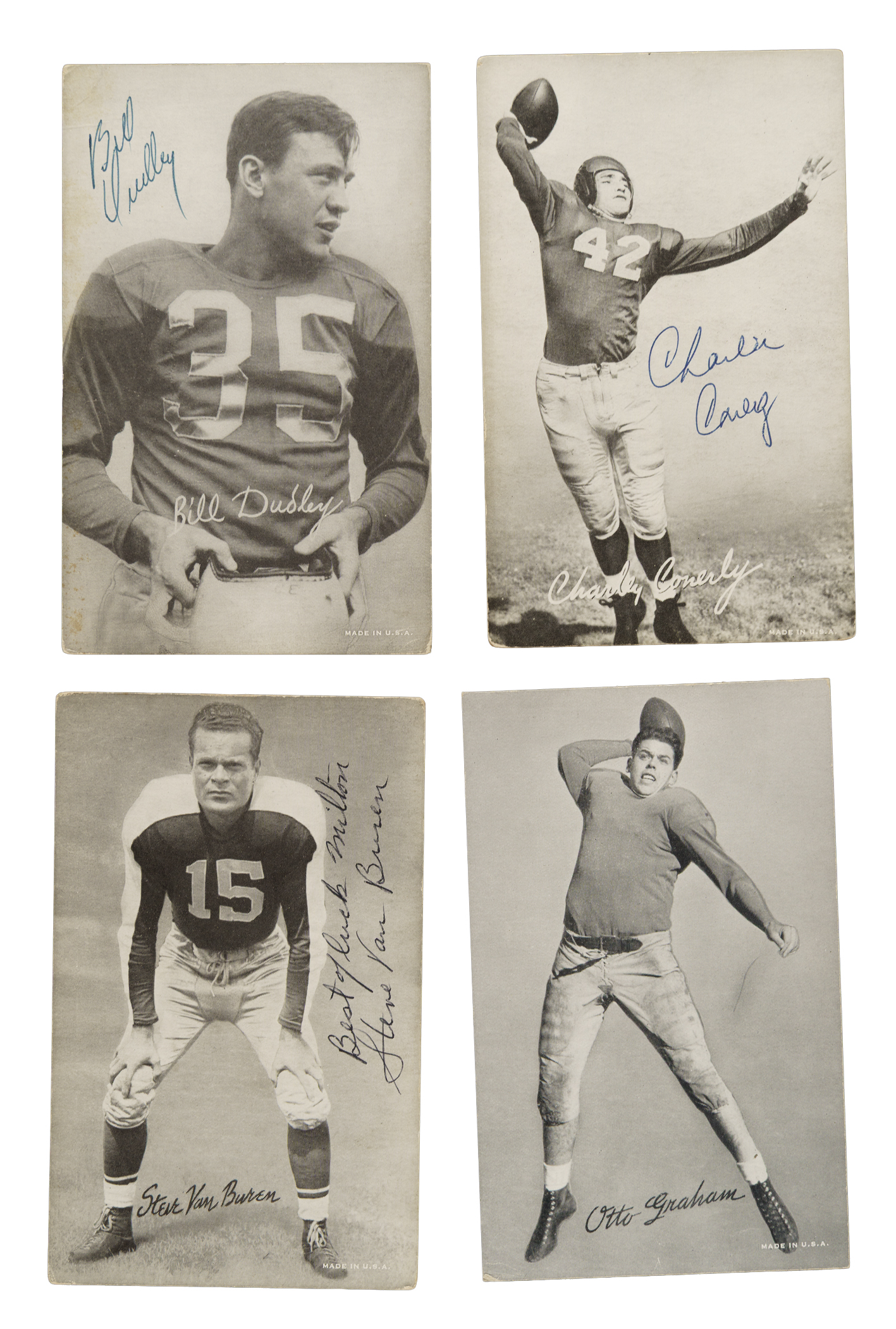 Collection of sixteen 1948-1952 W468 Football Exhibits cards. Four cards have been signed. Condition ranges from Pr to Vg (averaging Fr). This collection consists of the following: Albert, Conerly (signed), Connor (pencil on reverse, otherwise Gd+), Dudley (signed, Gd), two Graham (pencil on reverse, otherwise Vg and pencil on reverse, otherwise Gd), Hirsch (Gd+), Hoernschemeyer, Matson (pencil on reverse, otherwise Vg-Ex), Motley (signed, pencil on reverse, otherwise Gd+), Ratterman, Rykovich, Sitko, Van Buren (signed, Vg), Waterfield (pencil and partially erased pencil on reverse, otherwise Vg+), and Williams. Total: 16 cards. Auction LOA from James Spence/JSA.