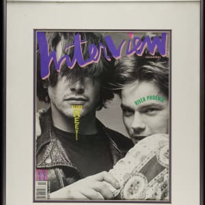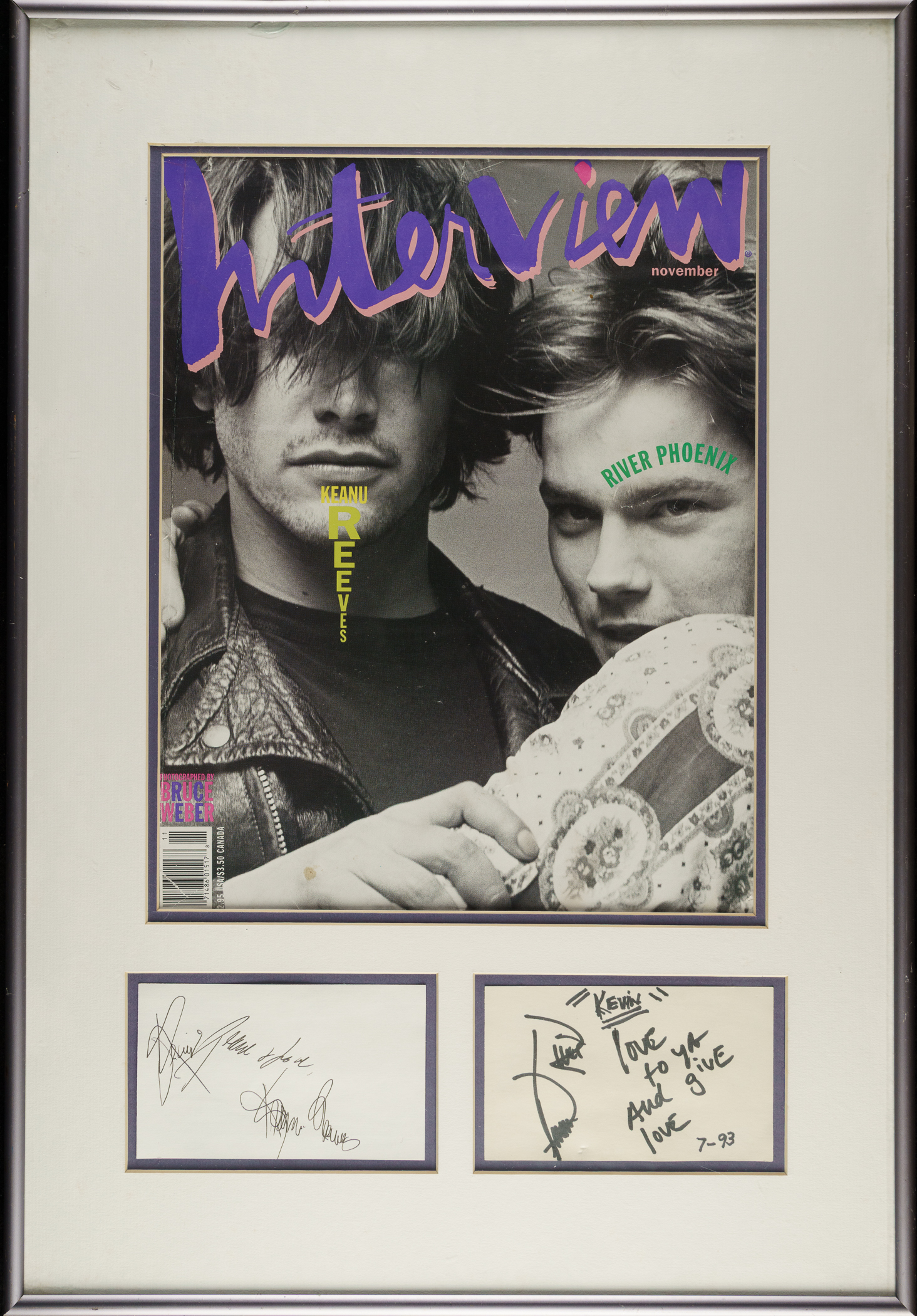 Pair of index cards, one signed by Keanu Reeves and the other signed by River Phoenix. Each signature is accompanied by a personalized inscription. The index cards have been framed together with the cover of the November 1991 issue of Interview Magazine featuring Reeves and Phoenix. Matted and framed to total dimensions of 15.5 x 23 inches. Auction LOA from James Spence/JSA. The size/weight of this item requires that there will be an additional shipping charge for this lot.