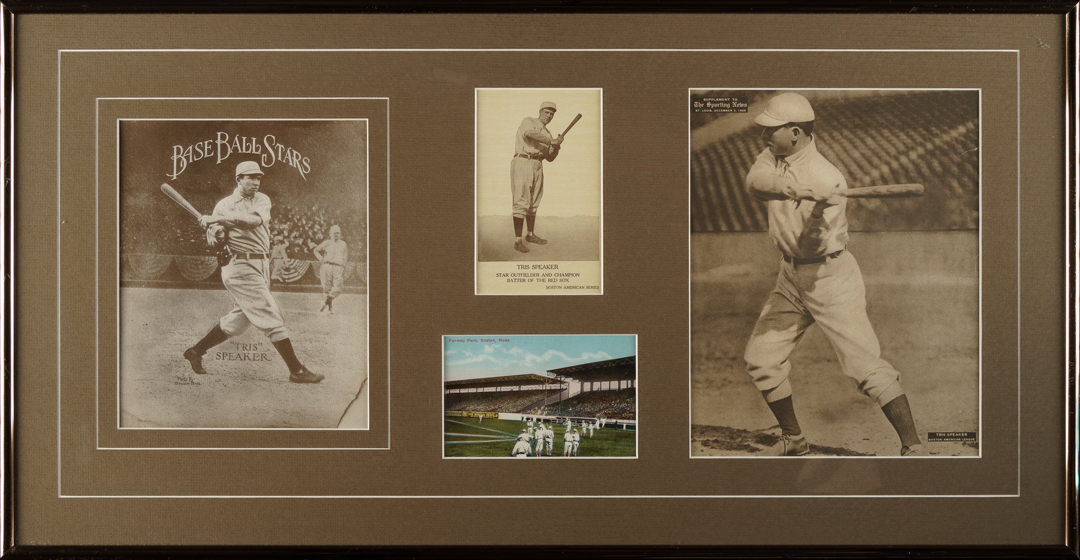 Offered is a collection of four Tris Speaker items matted and framed together. 1) Circa 1910 Notebook Cover. 6.5 x 8 inches (visible dimensions) and in apparent Fair condition overall due to the missing bottom-right corner. 2) 1912 Boston American Series Postcard. 3.25 x 5.25 inches (visible dimensions) and in apparent Excellent condition overall. 3) Circa 1915 A. Israelson & Co. Boston Red Sox Fenway Park Postcard. 5 x 3 inches (visible dimensions) and in apparent Excellent condition overall. 1909-1913 M101-2. 7.5 x 9.5 inches (visible dimensions) and in apparent Very Good condition overall. Matted and framed to total dimensions of 28 x 14 inches. The size/weight of this item requires that there will be an additional shipping charge for this lot.