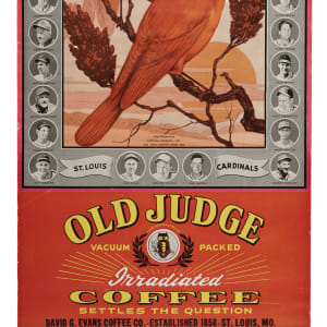 Coffee calendar, issued in promotion of Old Judge Irradiated Coffee, commemorating the 1942 World Champion St. Louis Cardinals. The design features a central illustration of two cardinals, surrounded on all four sides by portrait images of 26 members of the 1942 St. Louis Cardinals, including Stan Musial, Enos Slaughter, manager Billy Southworth, Mary Marion, Harry Walker, George Kurowski, Johnny Hopp, Morton Cooper, and Walker Cooper. The middle portion of the piece advertises for "Old Judge Irradiated Coffee." A wall calendar featuring tear-away calendar pages for the year 1943 is situated below the Old Judge advertising. The poster (14 x 31 inches), which is printed on thin paper stock, displays scattered creasing and a few small edge tears. The reverse features several strips of tape residue/paper loss along the perimeter as a result of prior tape removal. Good condition overall. The size/weight of this item requires that there will be an additional shipping charge for this lot.
