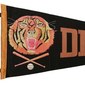 Scarce Detroit Tigers pennant dating from 1937. The graphics feature a depiction of a tiger's head with two crossed bats and a ball, while the lettering to the right reads "Detroit 1937." The black-felt pennant (28-3/4 inches), which is complete with tassels, displays minor handling wear and only minimal crazing to the painted graphics. In Very Good to Excellent condition overall. The size/weight of this item requires that there will be an additional shipping charge for this lot.