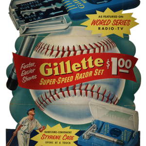 Original Gillette "World Series Special" die-cut display issued in the 1940s when the company was the sole sponsor for World Series radio broadcasts. The colorful store display showcases a pair of Gillette Razors built around an intriguing offer: a Super-Speed Razor Set for just $1.00. An image of a generic ballplayer appears in the lower left. The display (31.5 x 42.5 inches) exhibits wear commensurate with its age and former use, including edge wear and a few small spots of paper loss. The original easel is missing. Good condition overall. As the dominant sponsor of the World Series for multiple decades, this display endures as a scarce relic from one of MLB's most prominent corporate partnerships. The size/weight of this item requires that there will be an additional shipping charge for this lot.