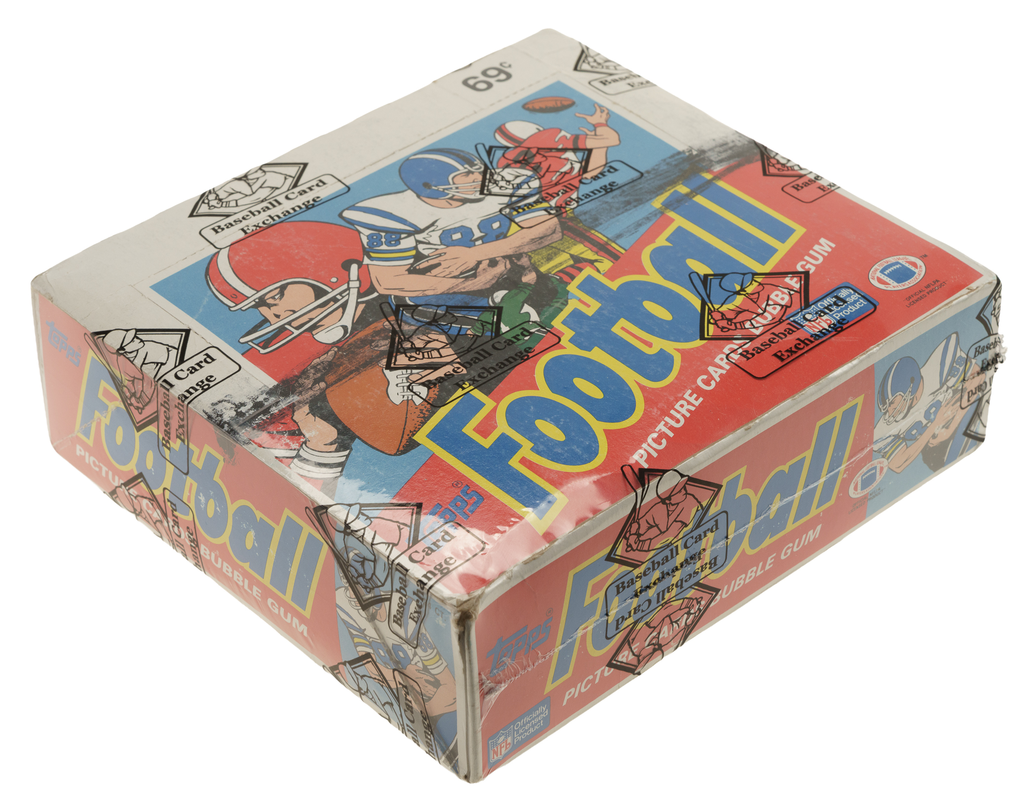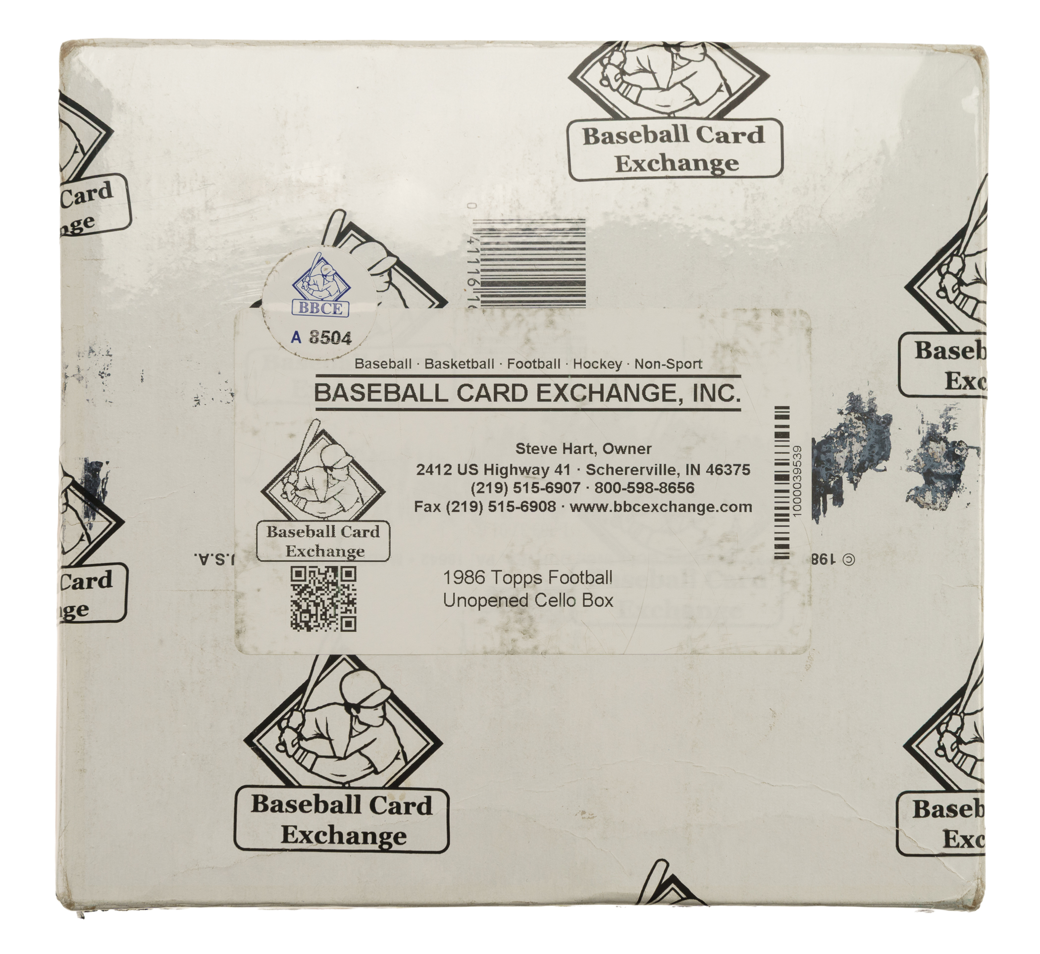 Complete, original unopened cello box of 1986 Topps football. The box houses 24 packs with each pack containing 32 cards, for a total of 768 cards. The 1986 Topps set features rookie cards of Hall of Famers Jerry Rice, Steve Young, Reggie White, Andre Reed, and Bruce Smith, as well as numerous other stars and Hall of Famers, including Walter Payton, Joe Montana, and Boomer Esiason. The store display box is bright and bold, with moderate shelf wear, including a bit of creasing. There is a black close-out marking written on the lid. This box comes shrink-wrapped by Baseball Card Exchange (owned by Steve Hart, the foremost expert on unopened material). An outstanding unopened box from this popular 1980s football set.