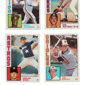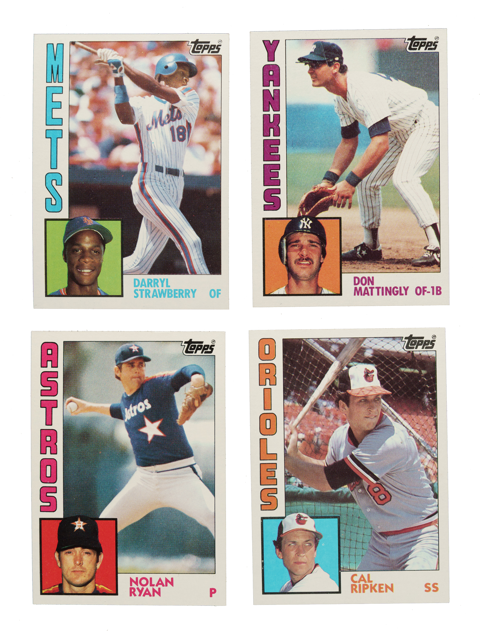 Complete 792-card set of 1984 Topps baseball cards highlighted by the rookie cards of Don Mattingly and Darryl Strawberry. Condition is 75% Nr/Mt to Nr/Mt-Mt (including a few higher) and 25% Ex to Ex-Mt (including 3% lesser). Keys: #8 Mattingly RC (Nr/Mt), 182 Strawberry RC (Nr/Mt), 470 Ryan (Nr/Mt), and 490 Ripken (Nr/Mt-Mt+). Total: 792 cards. The size/weight of this item requires that there will be an additional shipping charge for this lot.