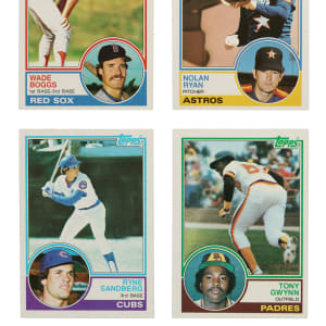 Presented is a collection of five 792-card complete sets of 1983 Topps baseball cards. Overall condition ranges from Ex to Mint (averaging Nr/Mt), including 3% lesser. Keys: Five #83 Sandberg RC (three Mint, Nr/Mt-Mt+, and Nr/Mt-Mt), five 360 Ryan (two Nr/Mt-Mt, two 75/25 T/B, otherwise Nr/Mt-Mt, and Vg due to "spider" wrinkles), five 482 Gwynn RC (three Nr/Mt, Ex-Mt, and Ex), and five 498 Boggs RC (Mint, 75/25 T/B, otherwise Nr/Mt-Mt+, Nr/Mt-Mt, Nr/Mt, and Ex). Total: 5 sets, 3,960 cards. The size/weight of this item requires that there will be an additional shipping charge for this lot.