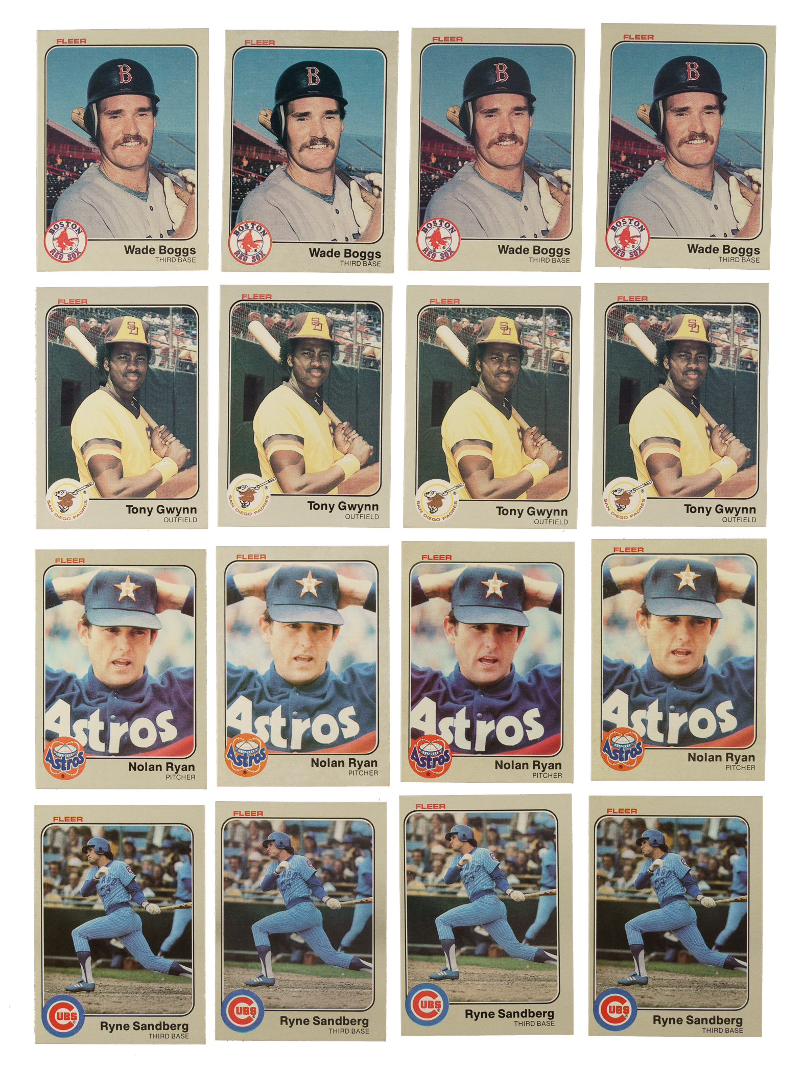 Presented is a collection of five 660-card complete sets of 1983 Fleer baseball cards. Overall condition ranges from Ex to Mint (averaging Nr/Mt), including 2% lesser. Keys: Five #179 Boggs RC (Mint, Nr/Mt-Mt+, and three Nr/Mt-Mt), five 360 Gwynn RC (Mint, Nr/Mt-Mt, Nr/Mt+, and two Nr/Mt), five 463 Ryan (Mint, two Nr/Mt-Mt+, and two Nr/Mt), and five 507 Sandberg RC (two Nr/Mt, Ex-Mt+, and two Ex). Total: 5 sets, 3,300 cards. The size/weight of this item requires that there will be an additional shipping charge for this lot.
