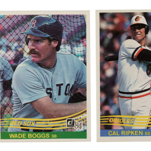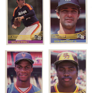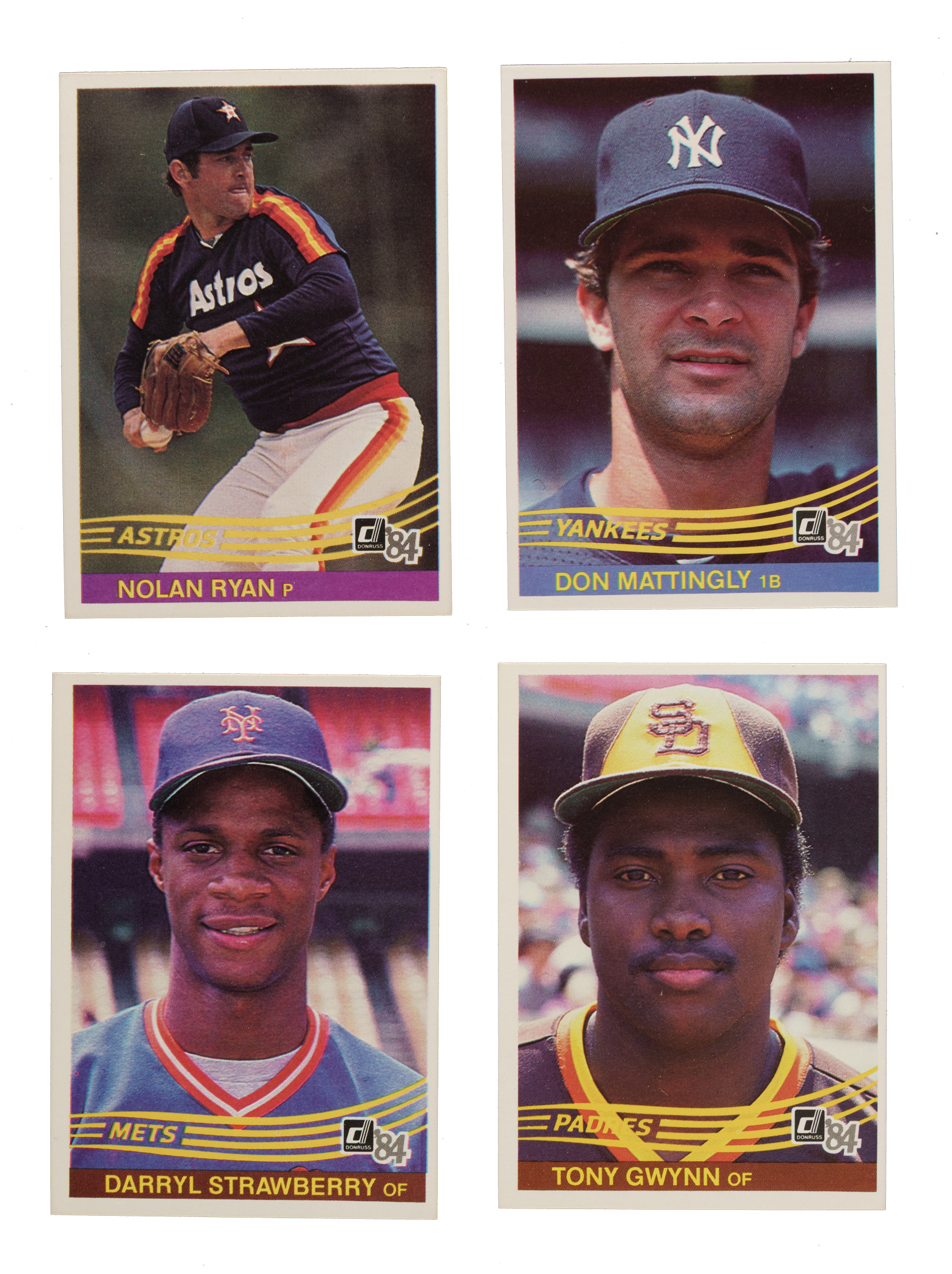 Presented is a 660-card complete set of 1984 Donruss baseball cards highlighted by Don Mattingly's rookie card. This set includes both Living Legends cards (#A Perry/Fingers and B Bench/Yastrzemski). Condition is 74% Nr/Mt to Nr/Mt-Mt and 26% Ex to Ex-Mt. Keys: #60 Ryan (Nr/Mt+), 68 Strawberry RC (Ex-Mt), 106 Ripken (Nr/Mt), 151 Boggs (Nr/Mt-Mt), 248 Mattingly RC (Nr/Mt-Mt), 311 Sandberg (Nr/Mt), and 324 Gwynn (Ex-Mt). Total: 660 cards. The size/weight of this item requires that there will be an additional shipping charge for this lot.