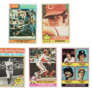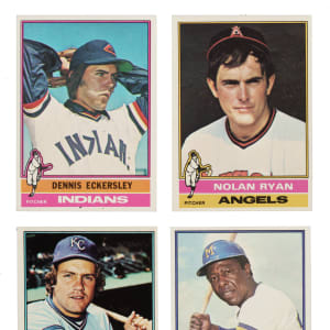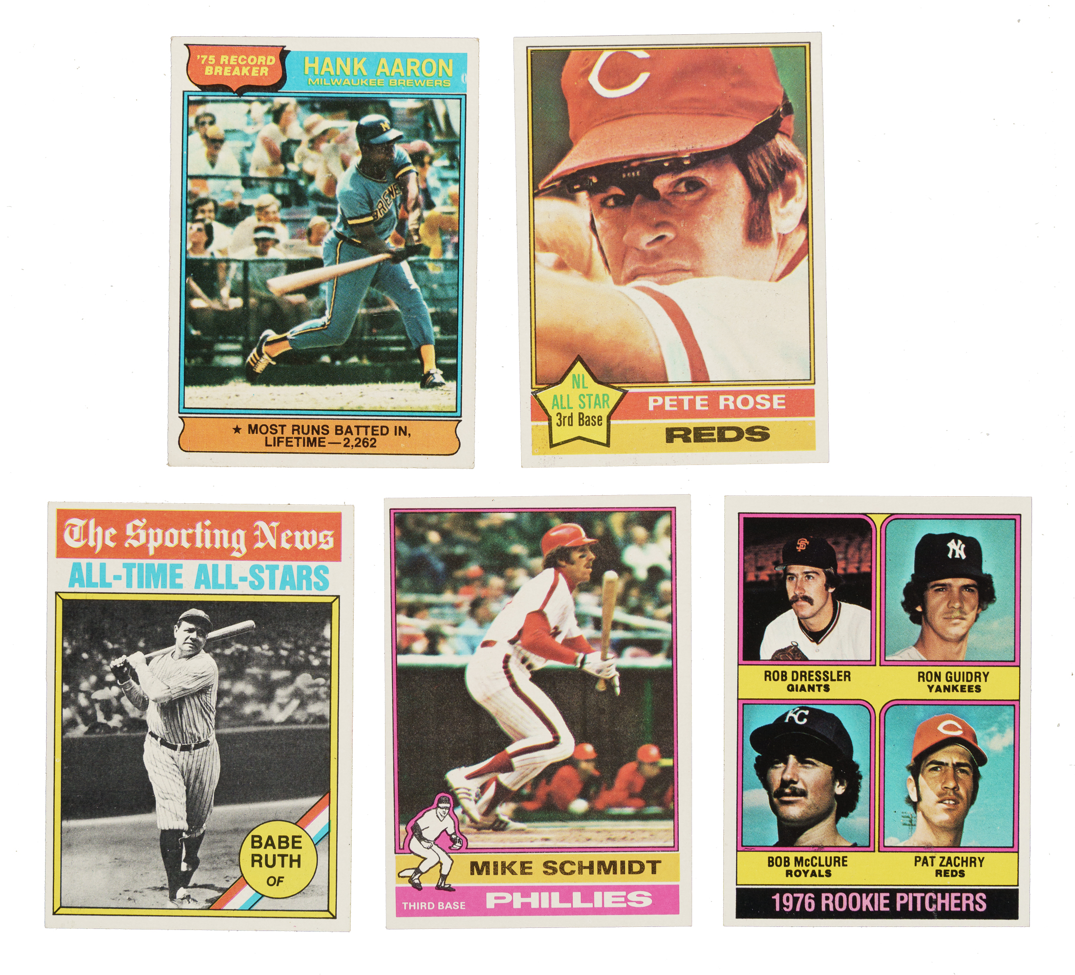 Presented is a very attractive 660-card complete set of 1976 Topps Baseball. The set is highlighted by dozens of stars and Hall of Famers, including Nolan Ryan, George Brett, Dennis Eckersley (rookie), and the final card of Hank Aaron. Condition is 56% Nr/Mt to Nr/Mt-Mt and 44% Ex to Ex-Mt (including 2% lesser and a few with a slight miscut). Keys: #1 Aaron RB (Vg-Ex+), 19 Brett (Ex+), 98 Eckersley RC (Ex), 240 Rose (100/0 centering on reverse, otherwise Nr/Mt+), 330 Ryan (Ex), 345 Ruth ATAS (Ex-Mt), 480 Schmidt (Ex), 550 Aaron (Nr/Mt), and 599 Guidry RC (Ex-Mt). This is an outstanding high-grade 1976 Topps complete set with numerous highlights. Total: 660 cards.