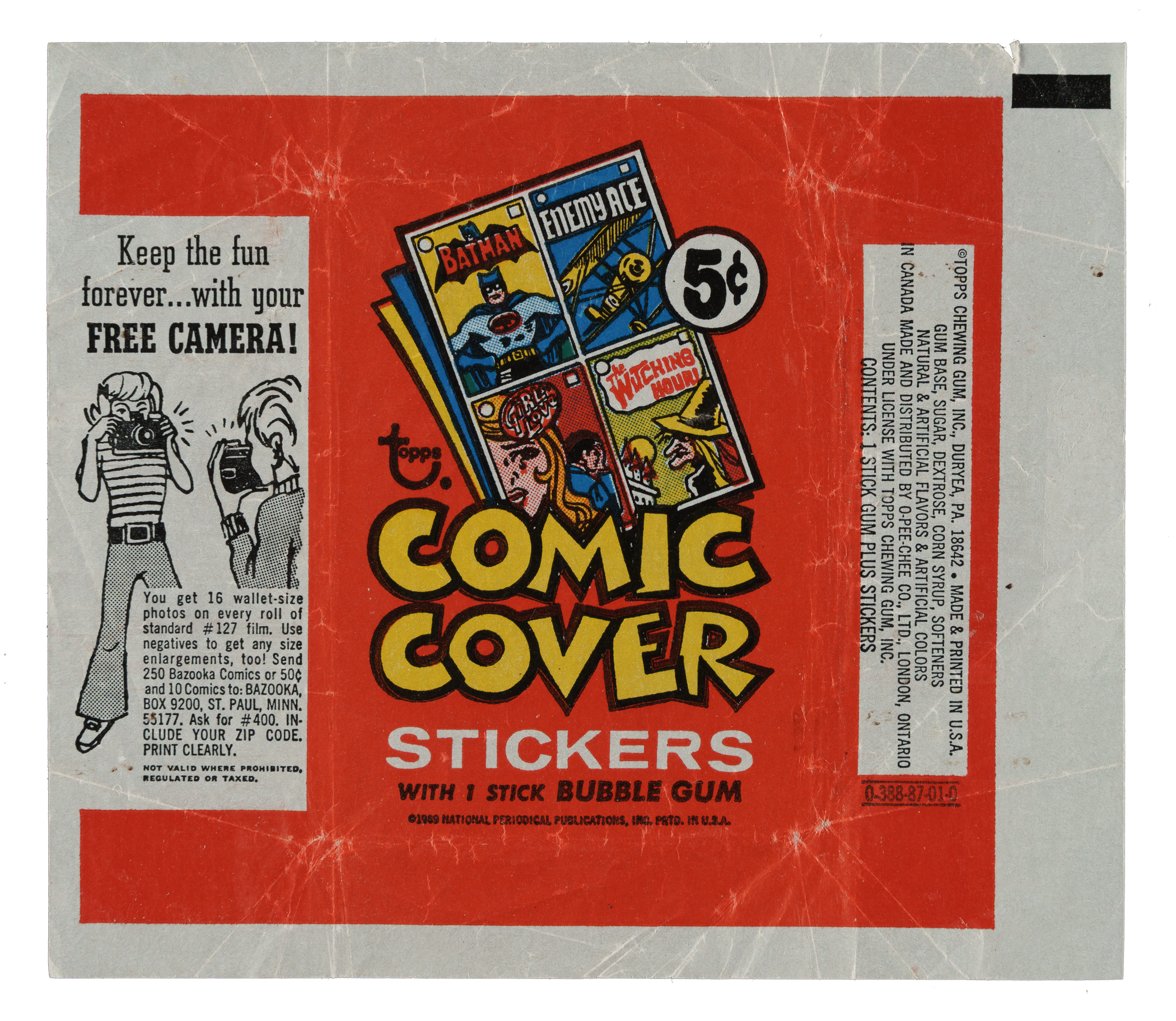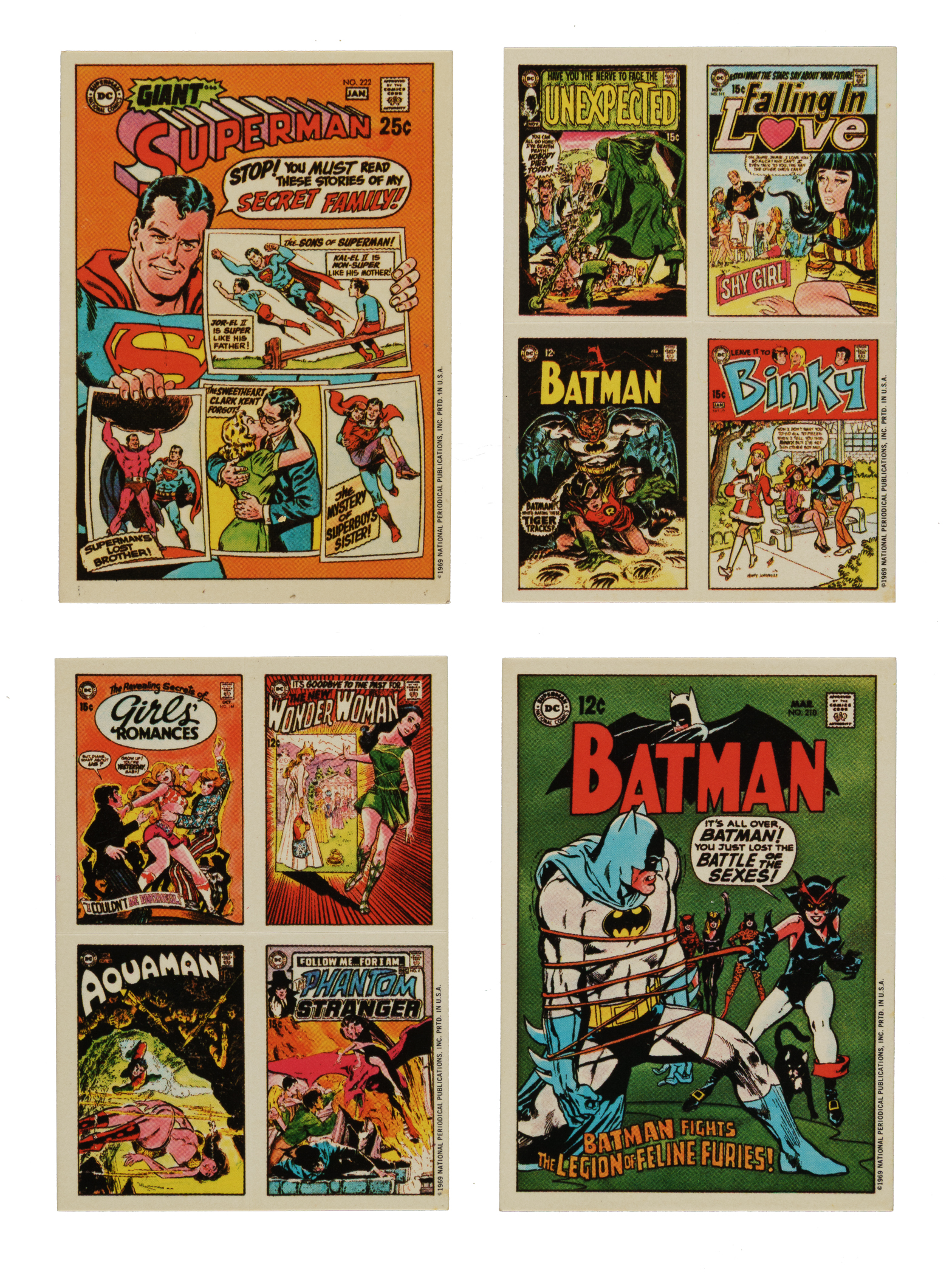 Presented is a rarely offered complete set of 1970 Topps "Comic Cover Stickers." DC's roster of super heroes serves as subjects for this popular set, including Batman, Superman, Wonder Woman, and others, in a series of colorful scenes throughout the 44-sticker set. This unusual sticker set was produced to appeal to both card and comic book collectors. Each sticker in the set is designed using an issued comic book cover, of which twenty-nine of the stickers feature a four-on-one format (showing four different comic book covers). The condition is 35% Nr/Mt or better, 35% Ex to Ex-Mt, and 30% Vg to Vg-Ex (including one lesser). The set is accompanied by an original wrapper in Very Good condition. This is an outstanding complete set of this very popular 1970s nonsport issue. Total: 44 stickers.